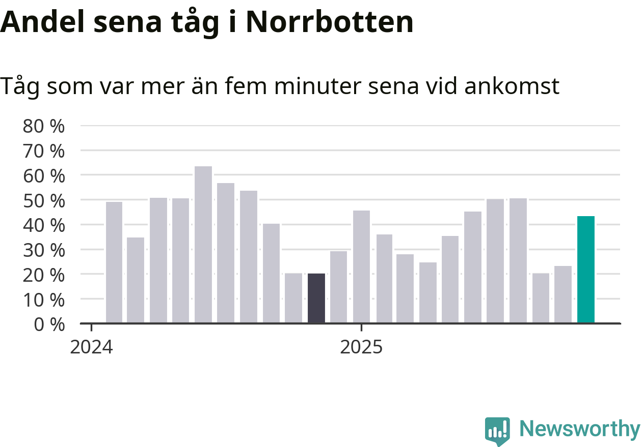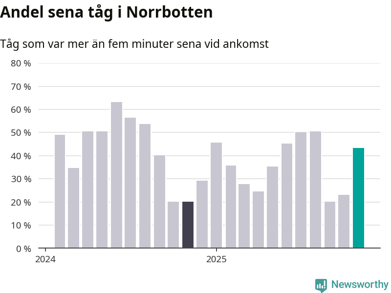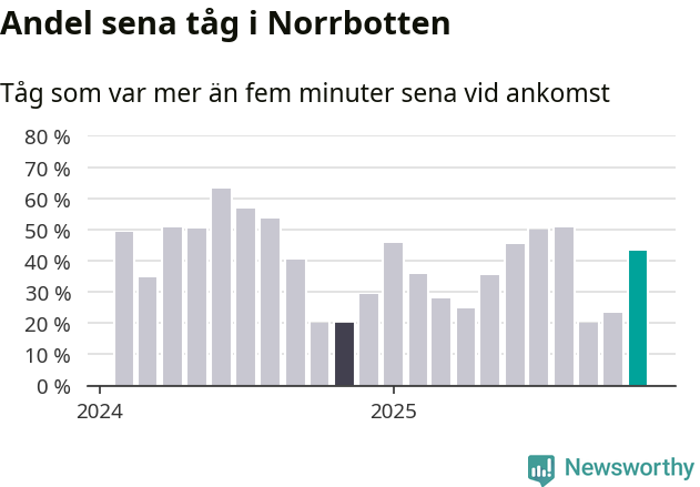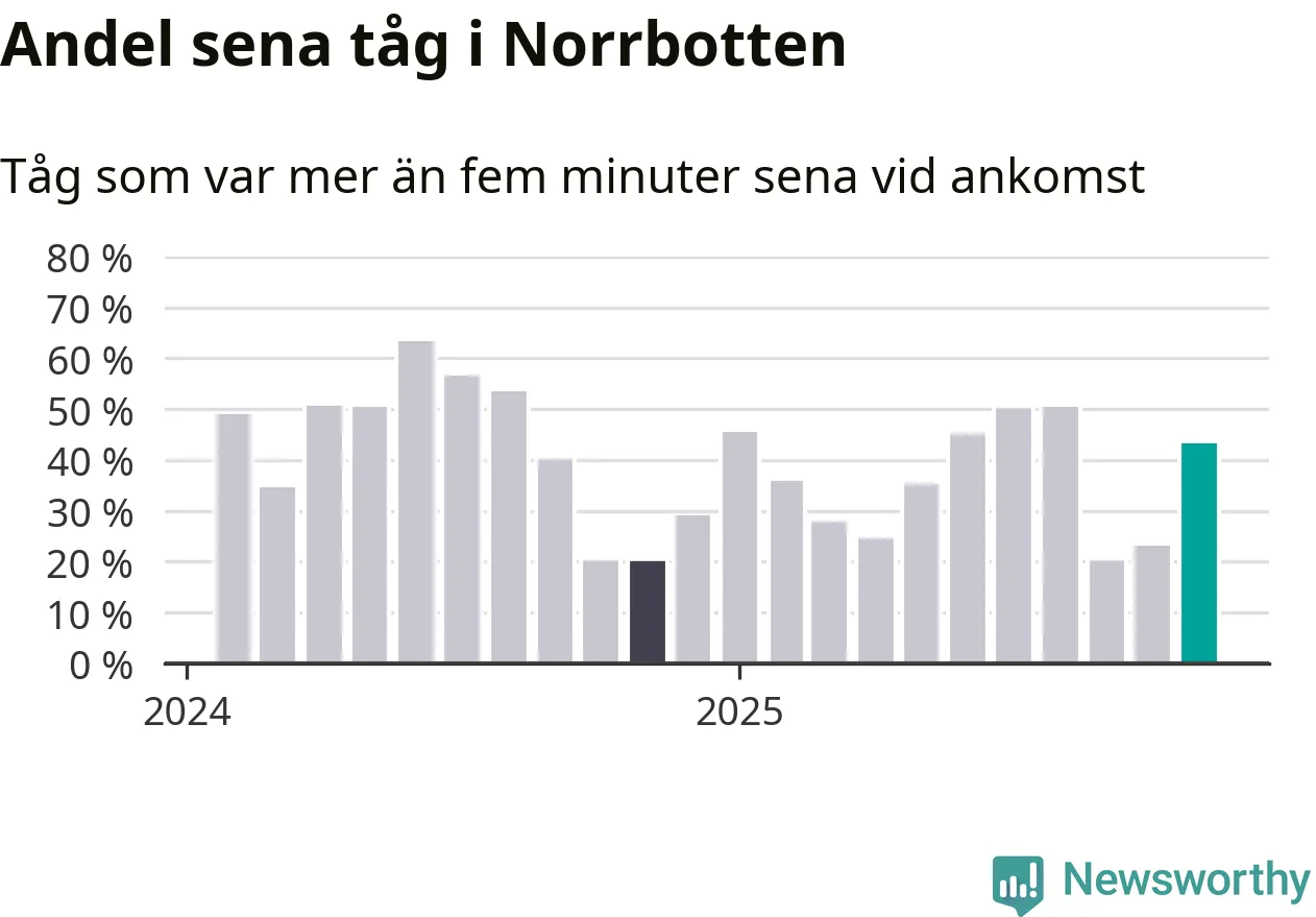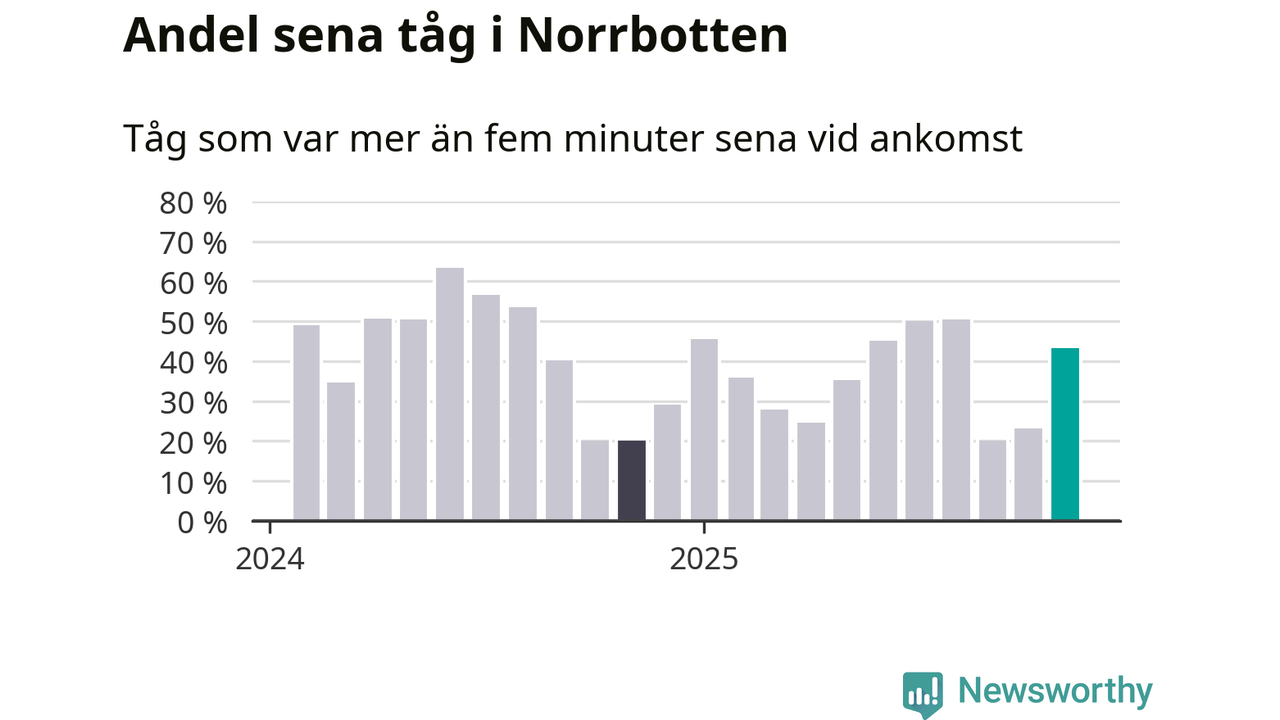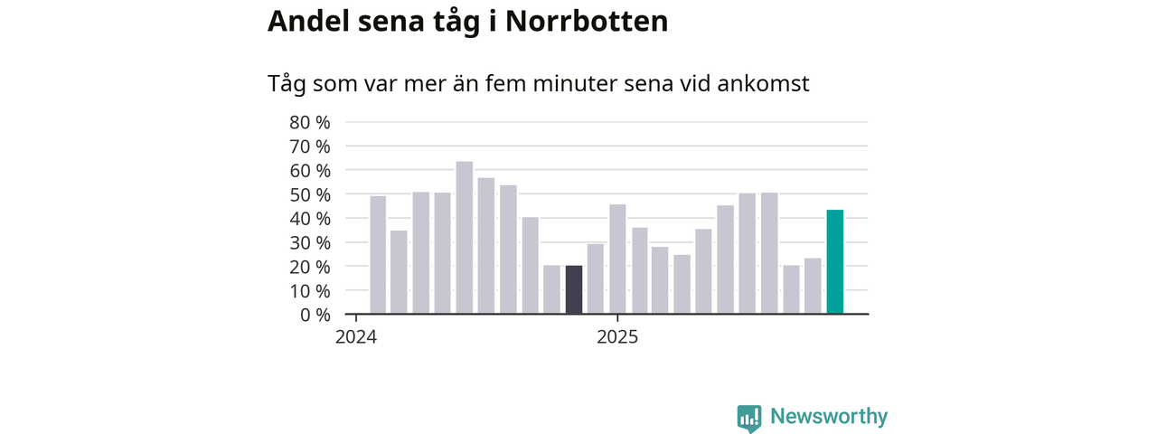 43 procent kan jämföras med 23 procent månaden innan, och 20 procent i november 2024. Siffrorna bygger på realtidsinformation om tågavgångar och ankomster från Trafikverket, som Newsworthy löpande samlar in.