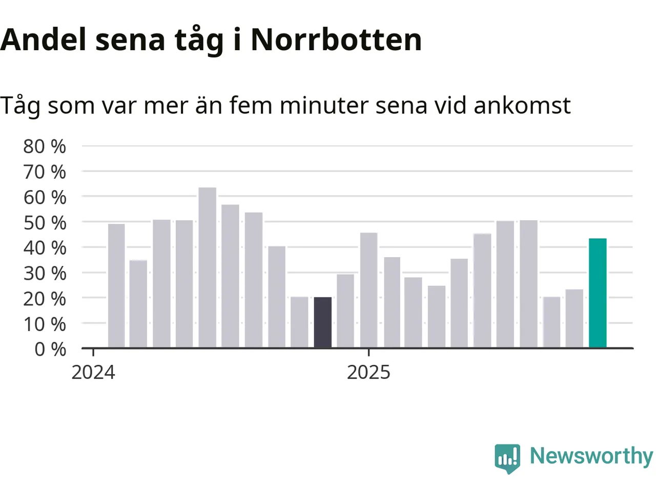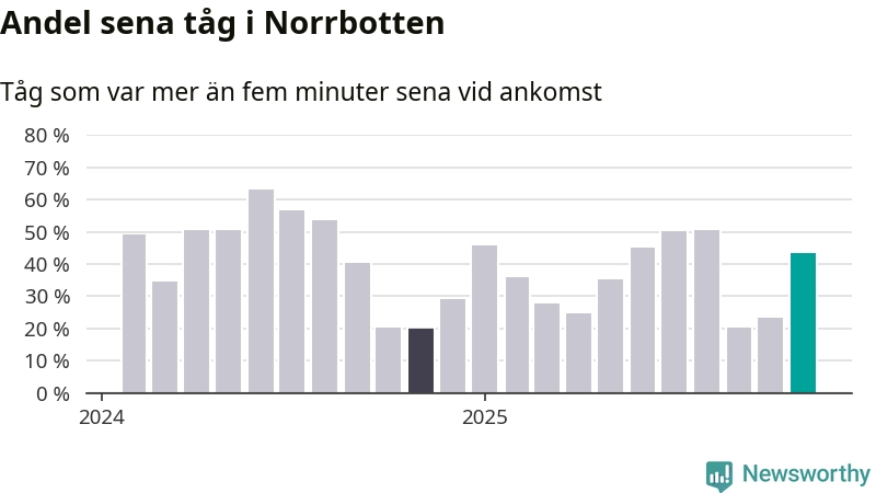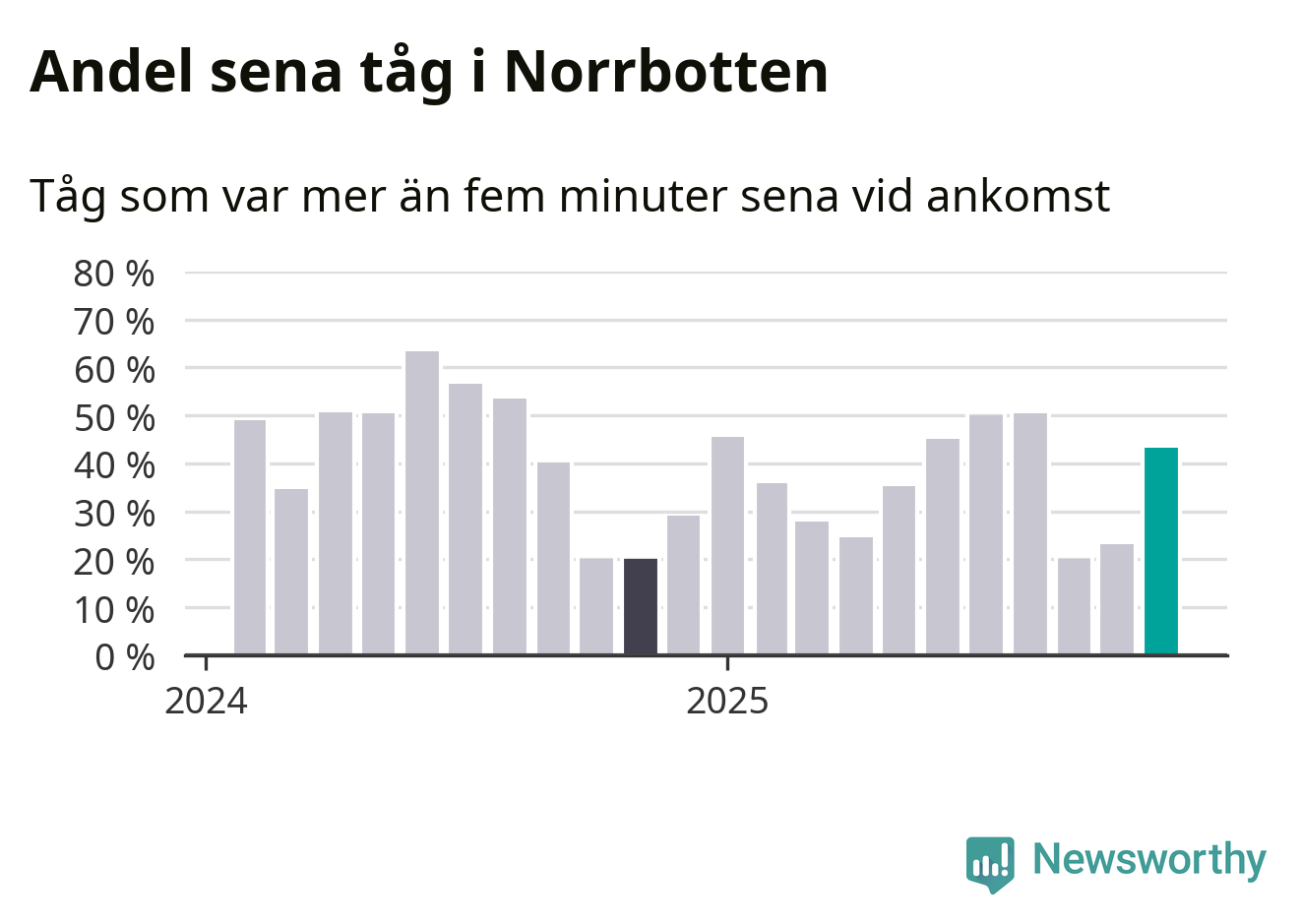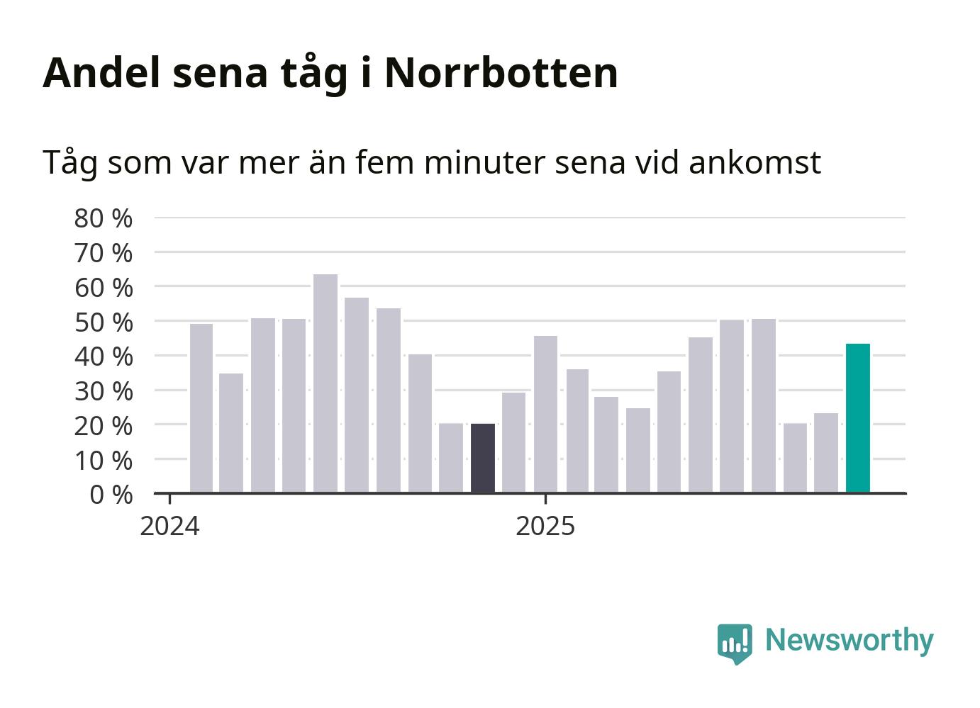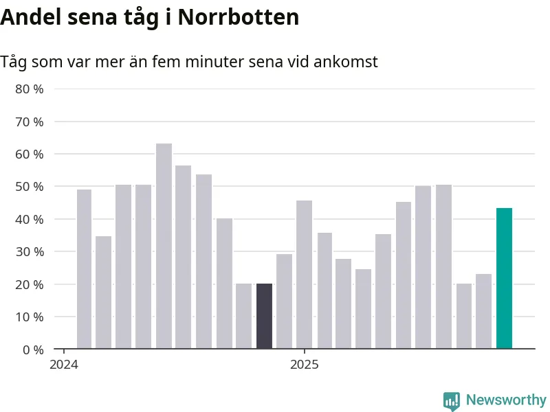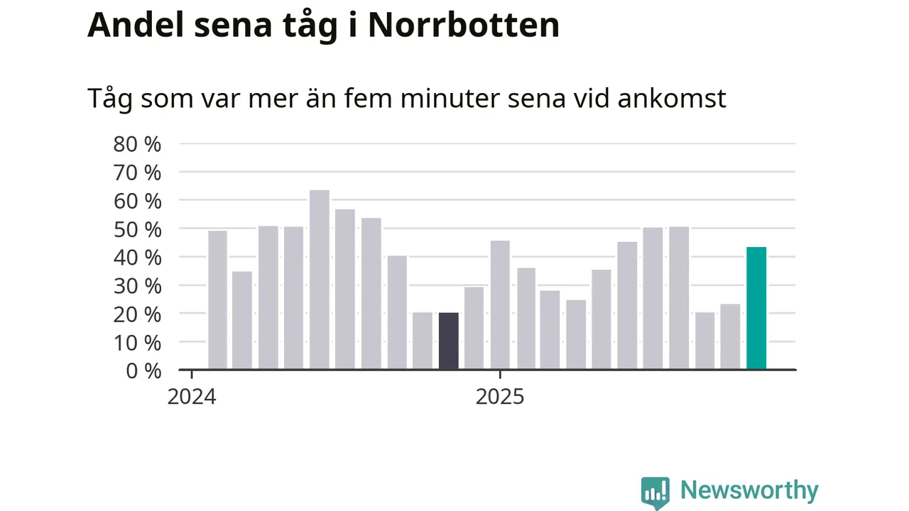 43 procent kan jämföras med 23 procent månaden innan, och 20 procent i november 2024. Siffrorna bygger på realtidsinformation om tågavgångar och ankomster från Trafikverket, som Newsworthy löpande samlar in.