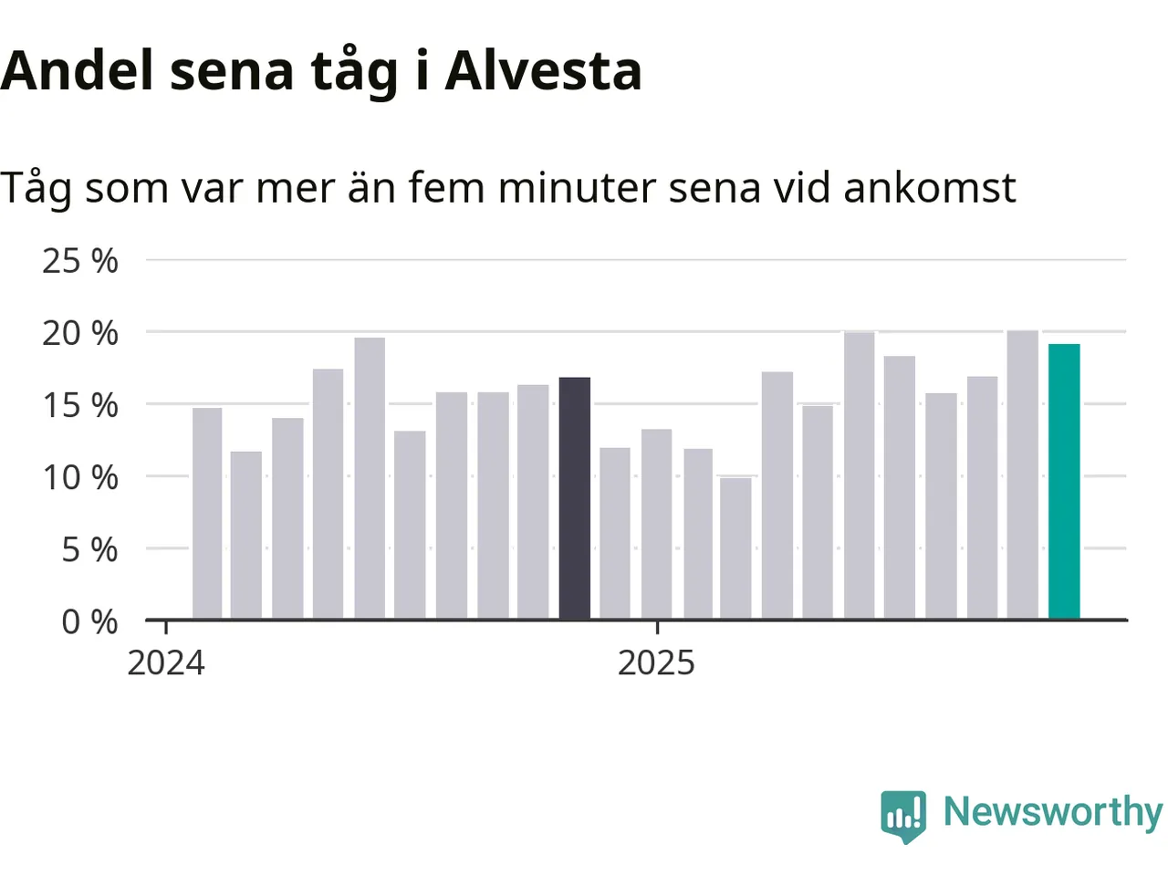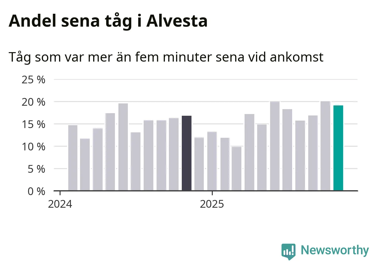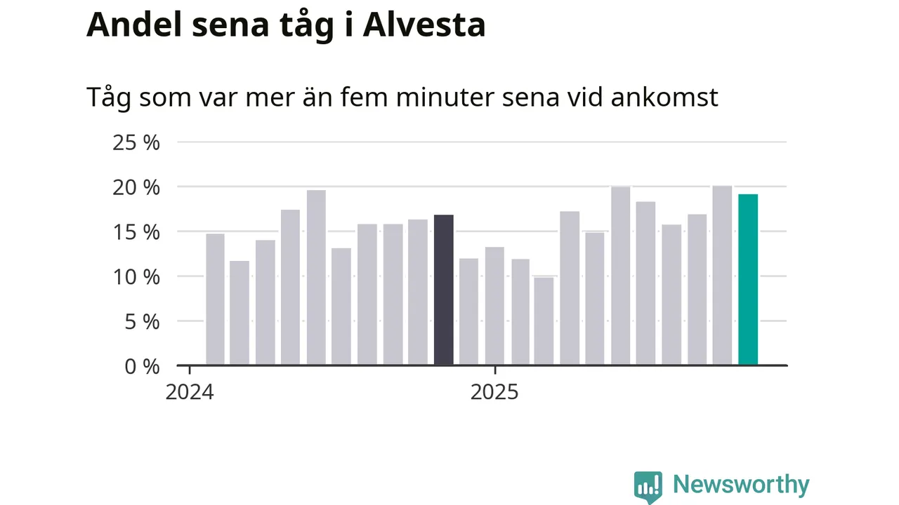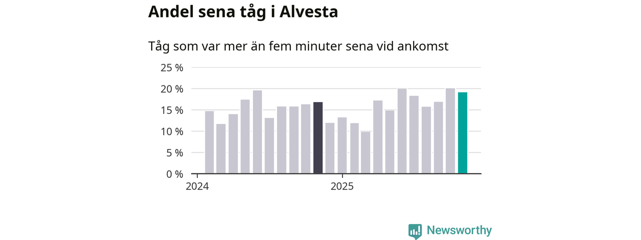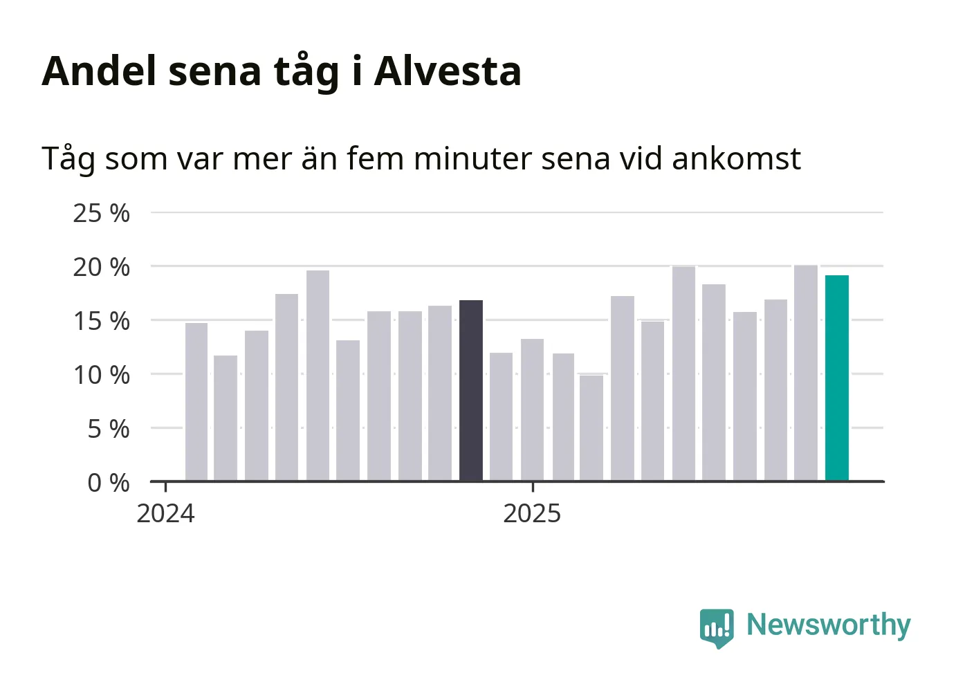 19 procent kan jämföras med 20 procent månaden innan, och 17 procent i november 2024. Siffrorna bygger på realtidsinformation om tågavgångar och ankomster från Trafikverket, som Newsworthy löpande samlar in.