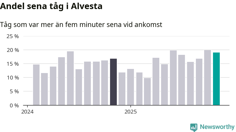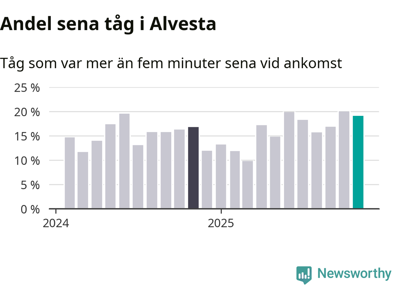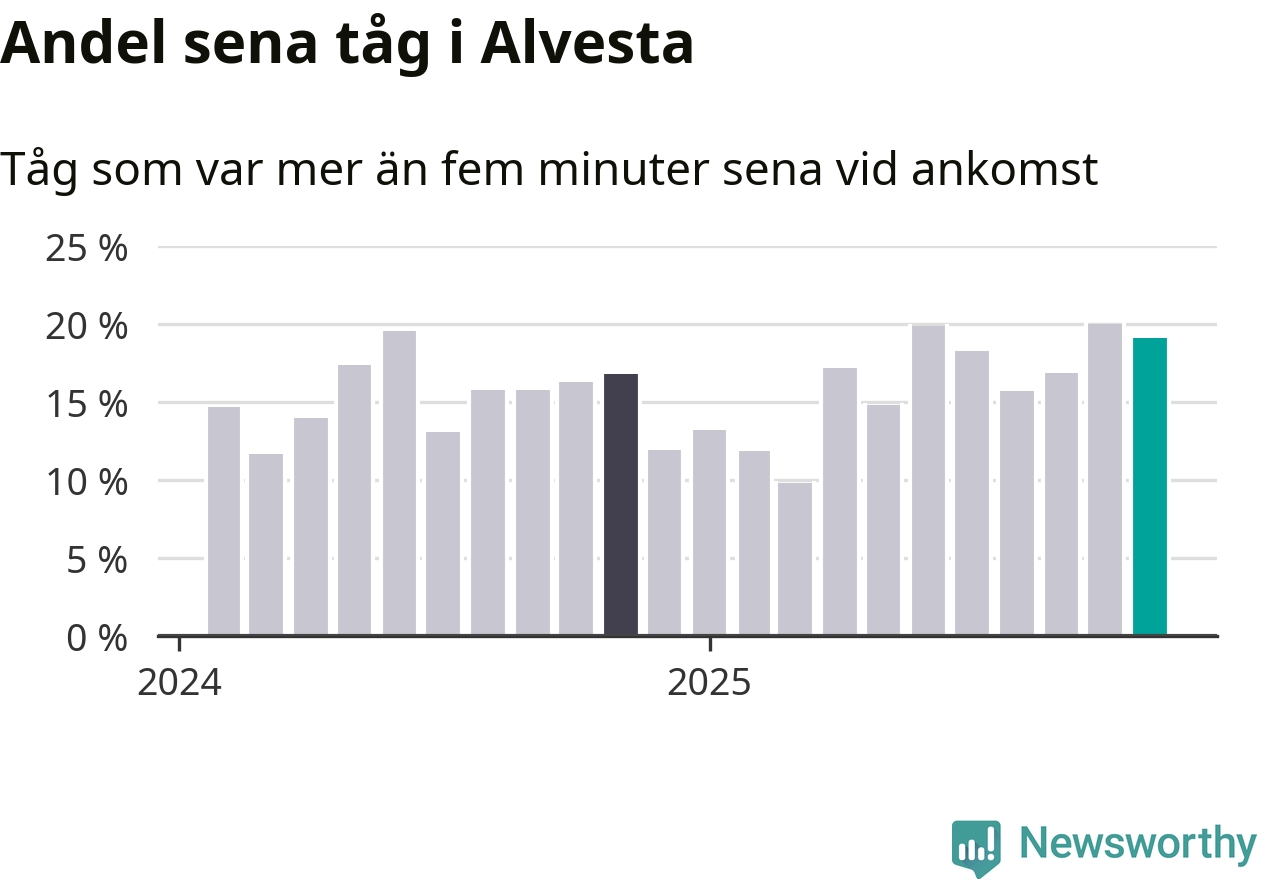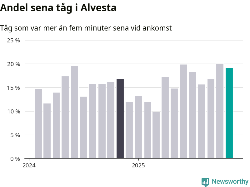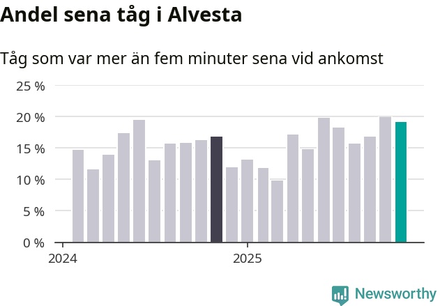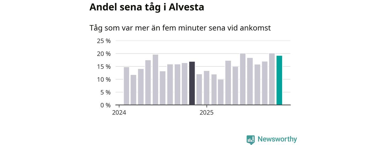 19 procent kan jämföras med 20 procent månaden innan, och 17 procent i november 2024. Siffrorna bygger på realtidsinformation om tågavgångar och ankomster från Trafikverket, som Newsworthy löpande samlar in.