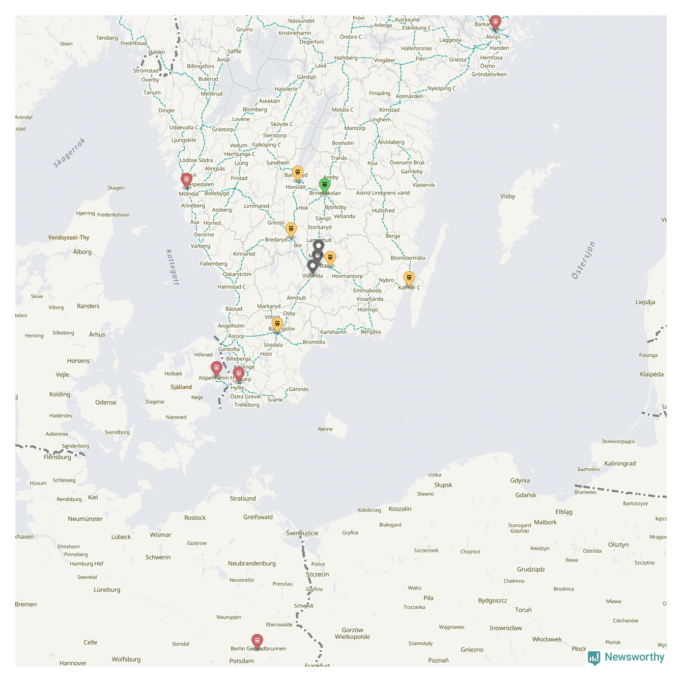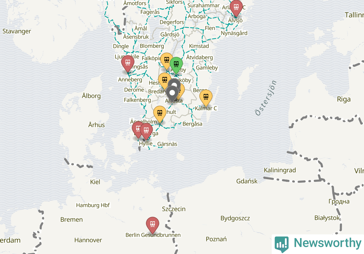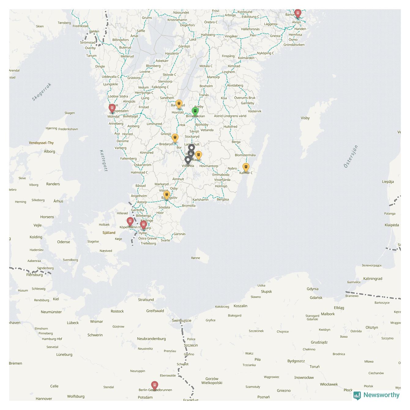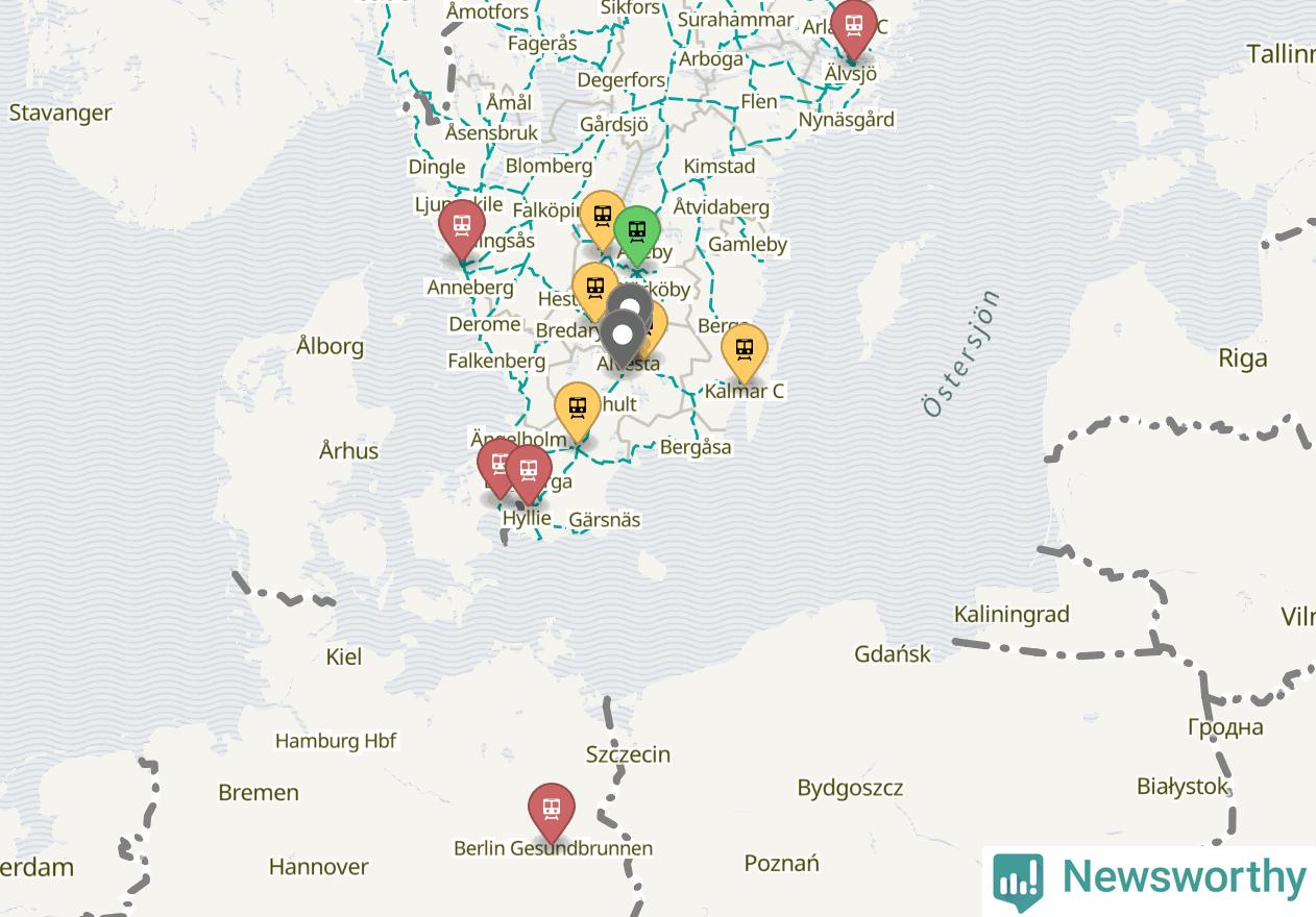 Kartdata från Mapbox, Newsworthy, OpenStreetMap och Trafikverket. Uppgifter om sträckor med passagerartrafik från jarnvag.net.