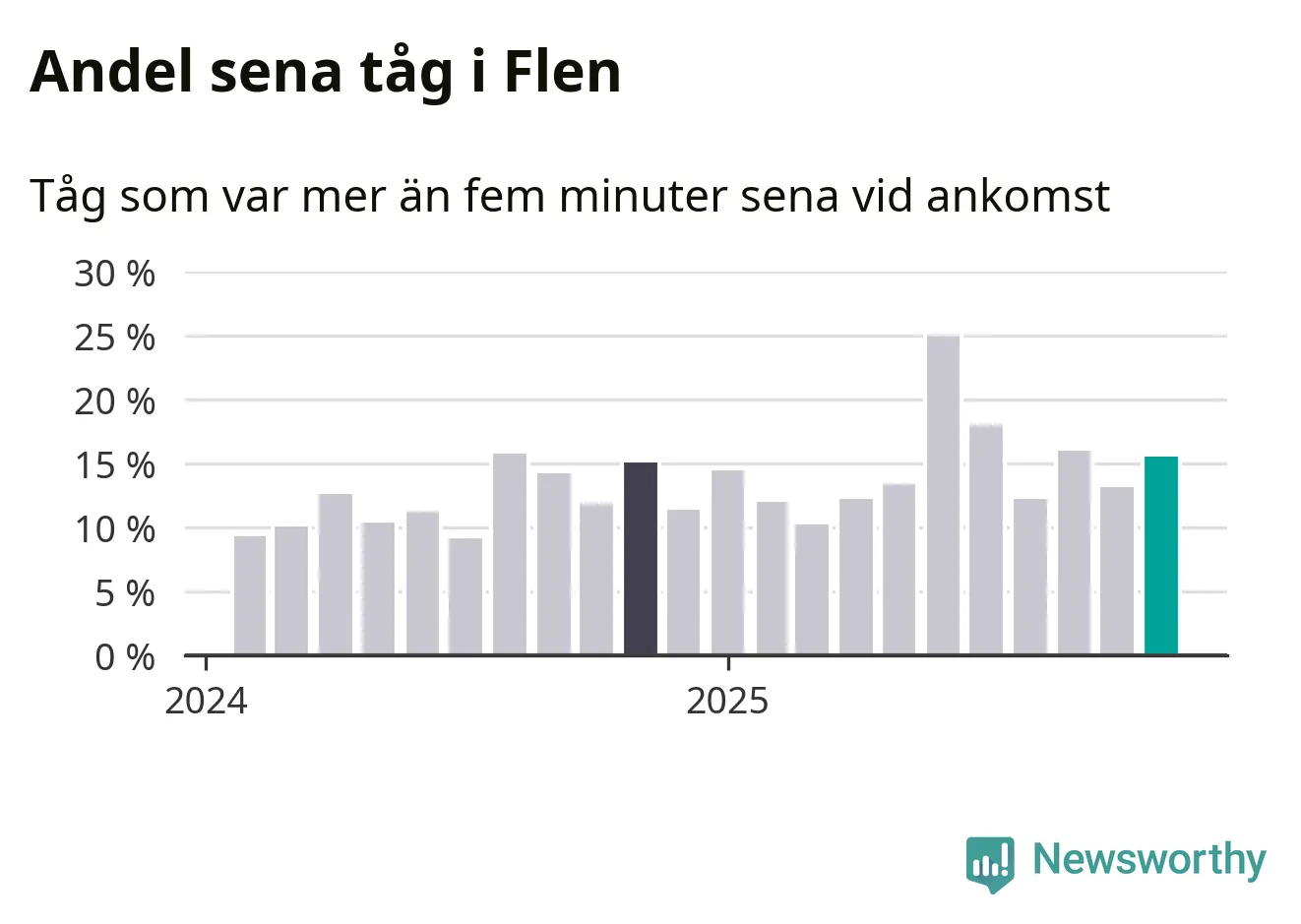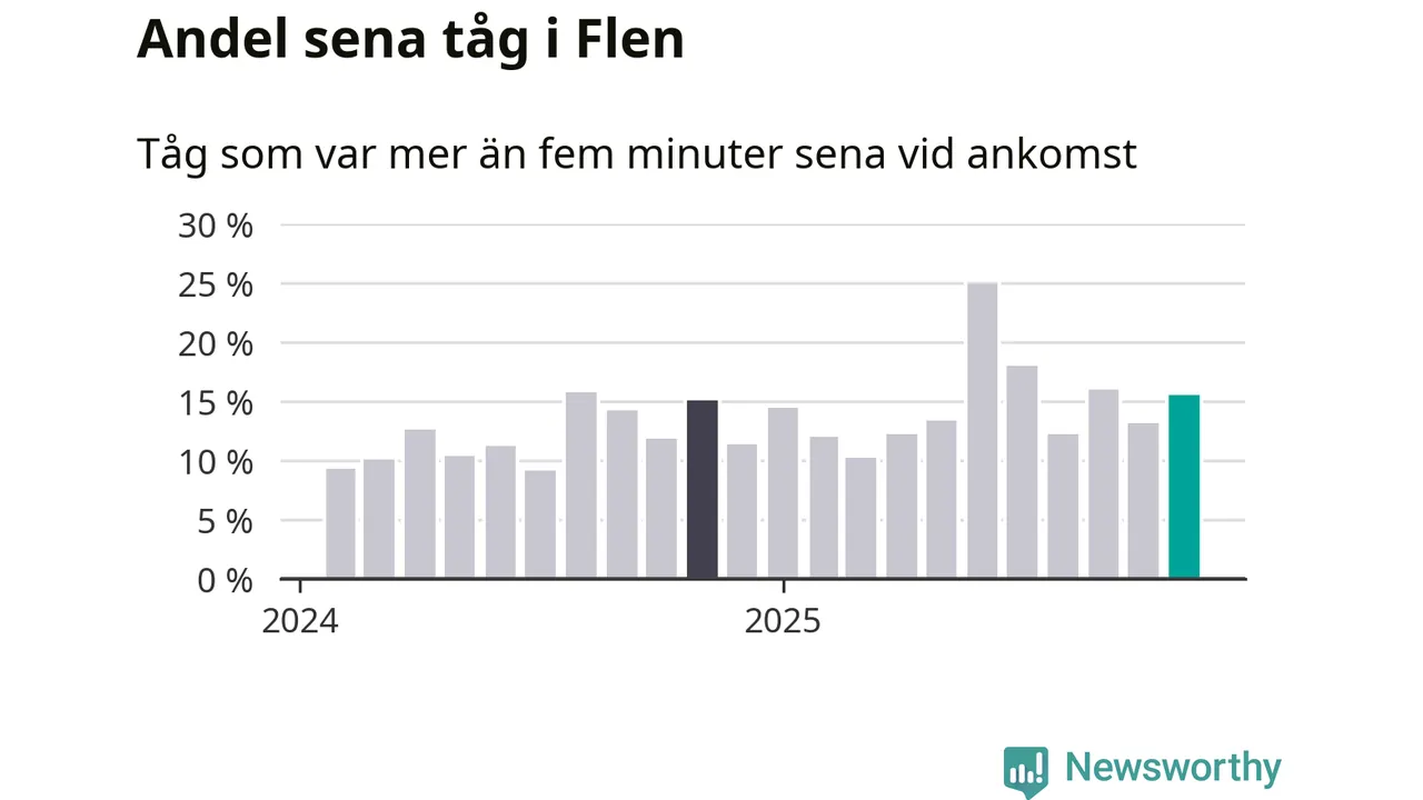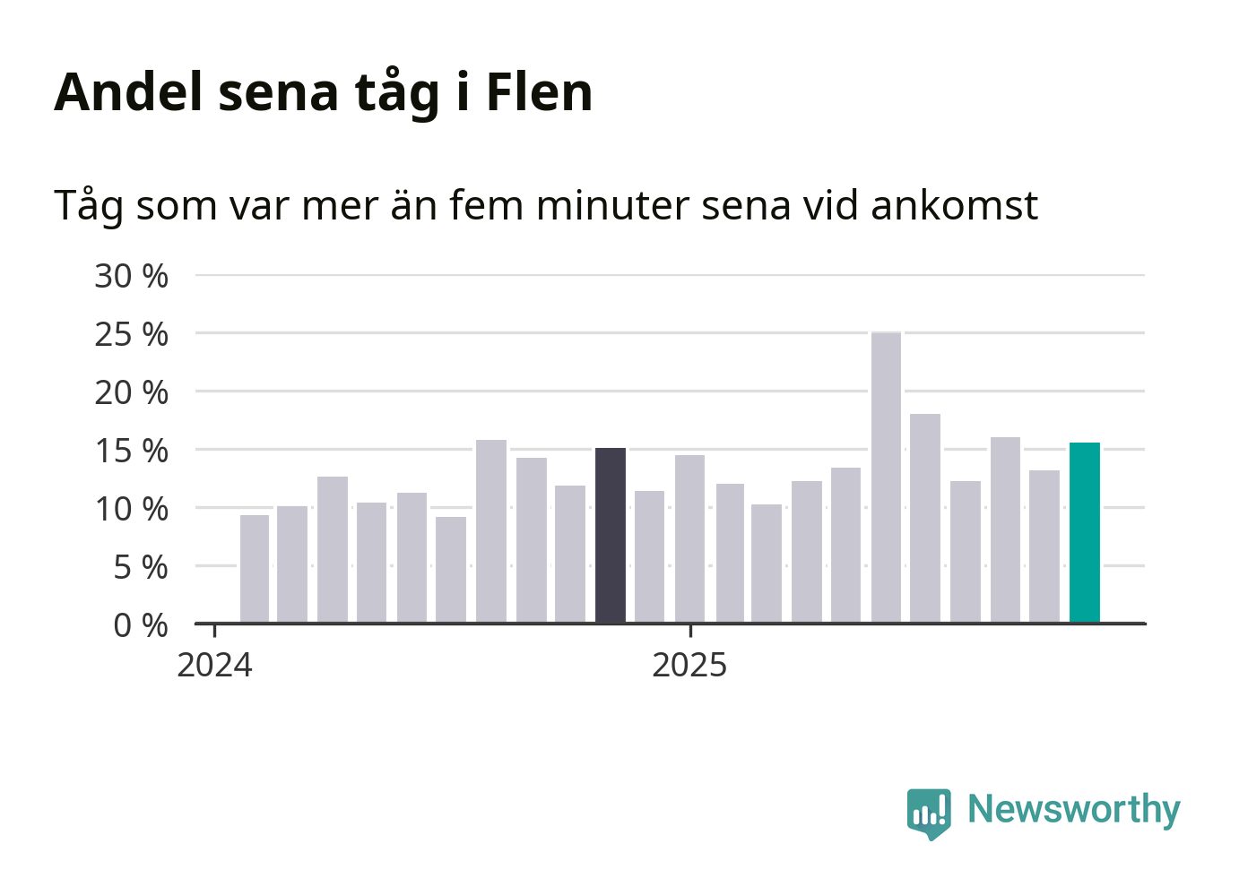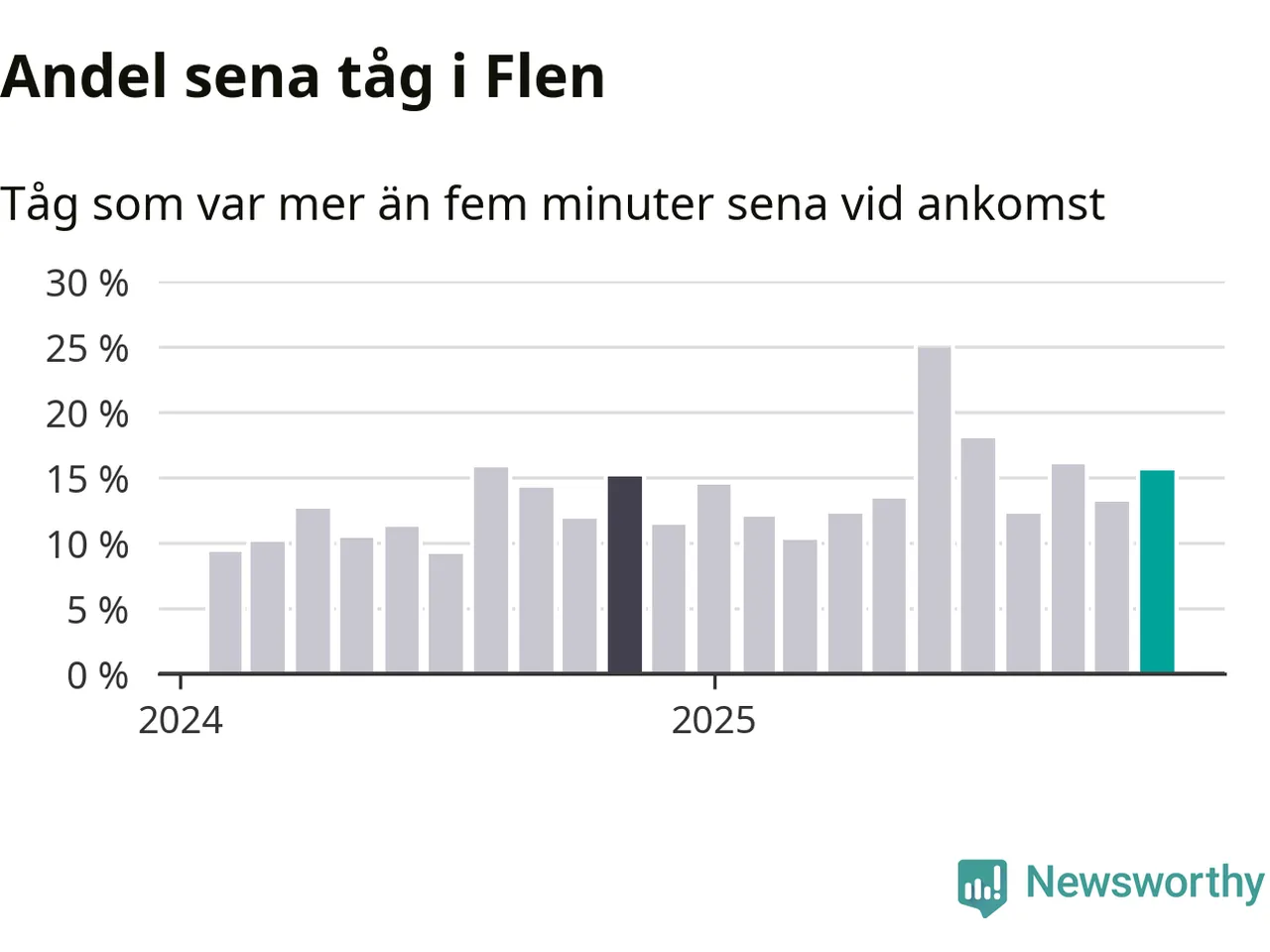 16 procent kan jämföras med 13 procent månaden innan, och 15 procent i november 2024. Siffrorna bygger på realtidsinformation om tågavgångar och ankomster från Trafikverket, som Newsworthy löpande samlar in.