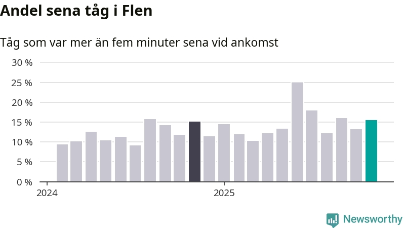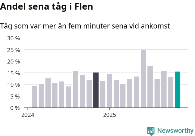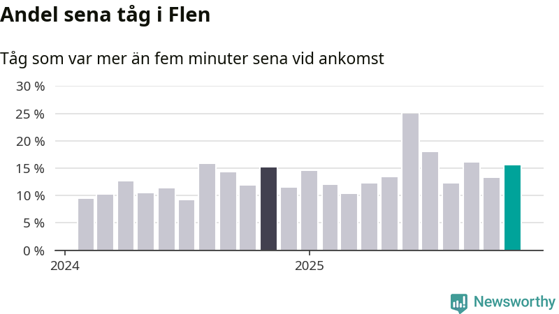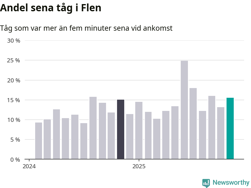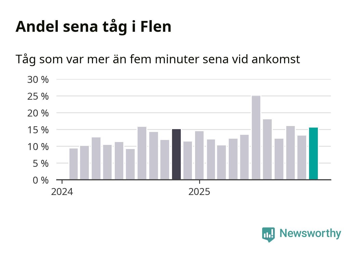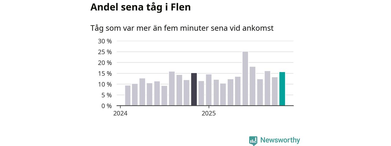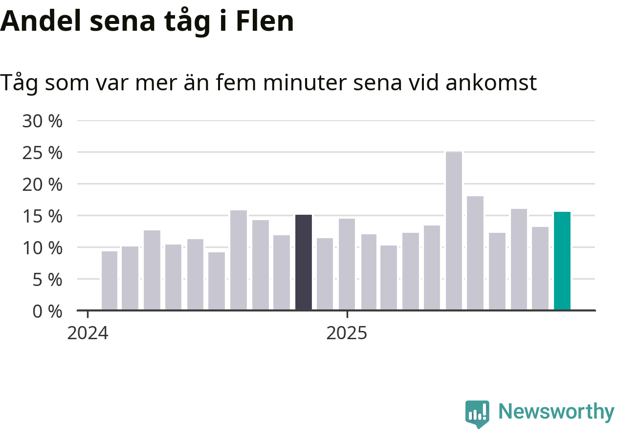 16 procent kan jämföras med 13 procent månaden innan, och 15 procent i november 2024. Siffrorna bygger på realtidsinformation om tågavgångar och ankomster från Trafikverket, som Newsworthy löpande samlar in.