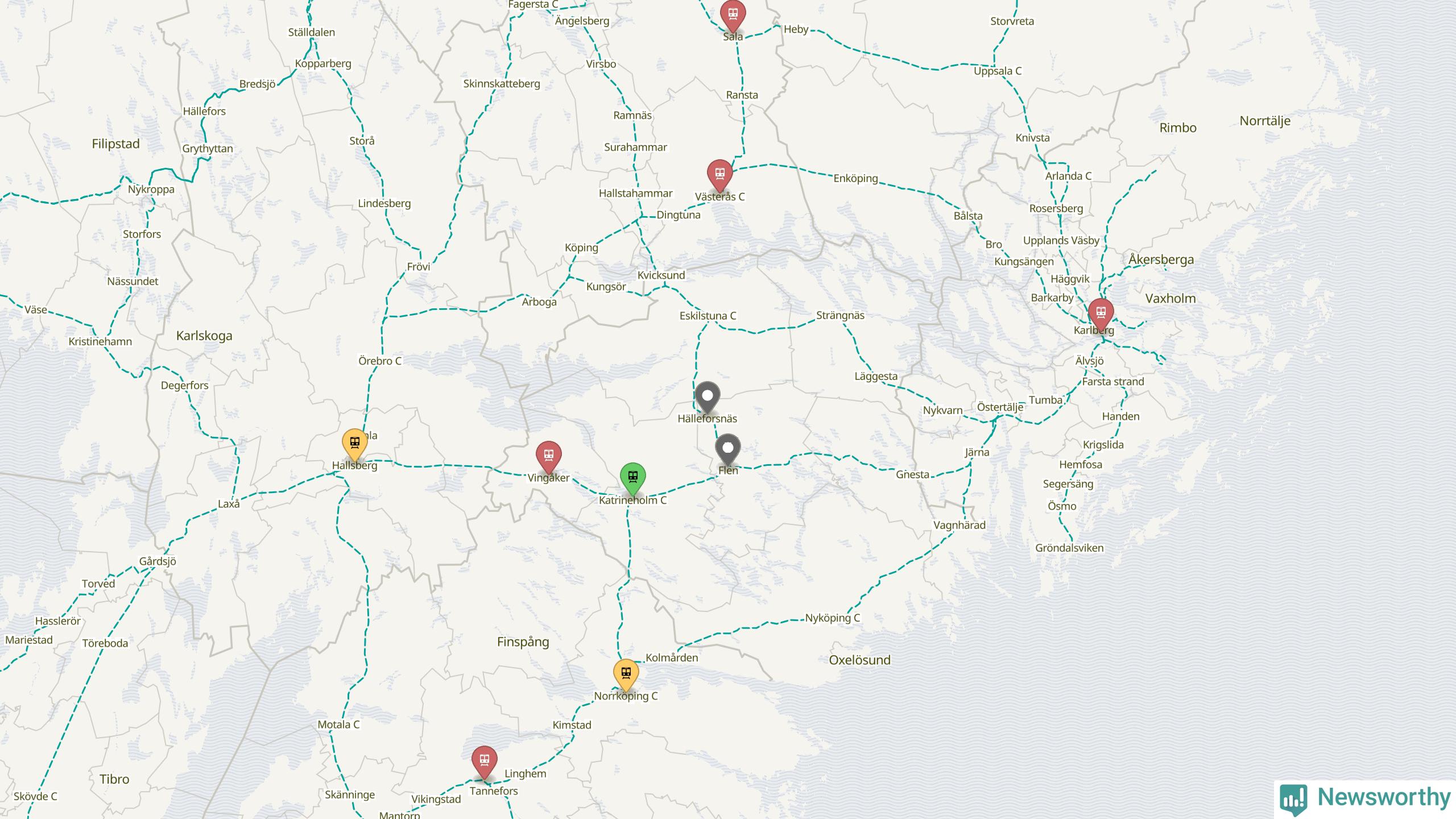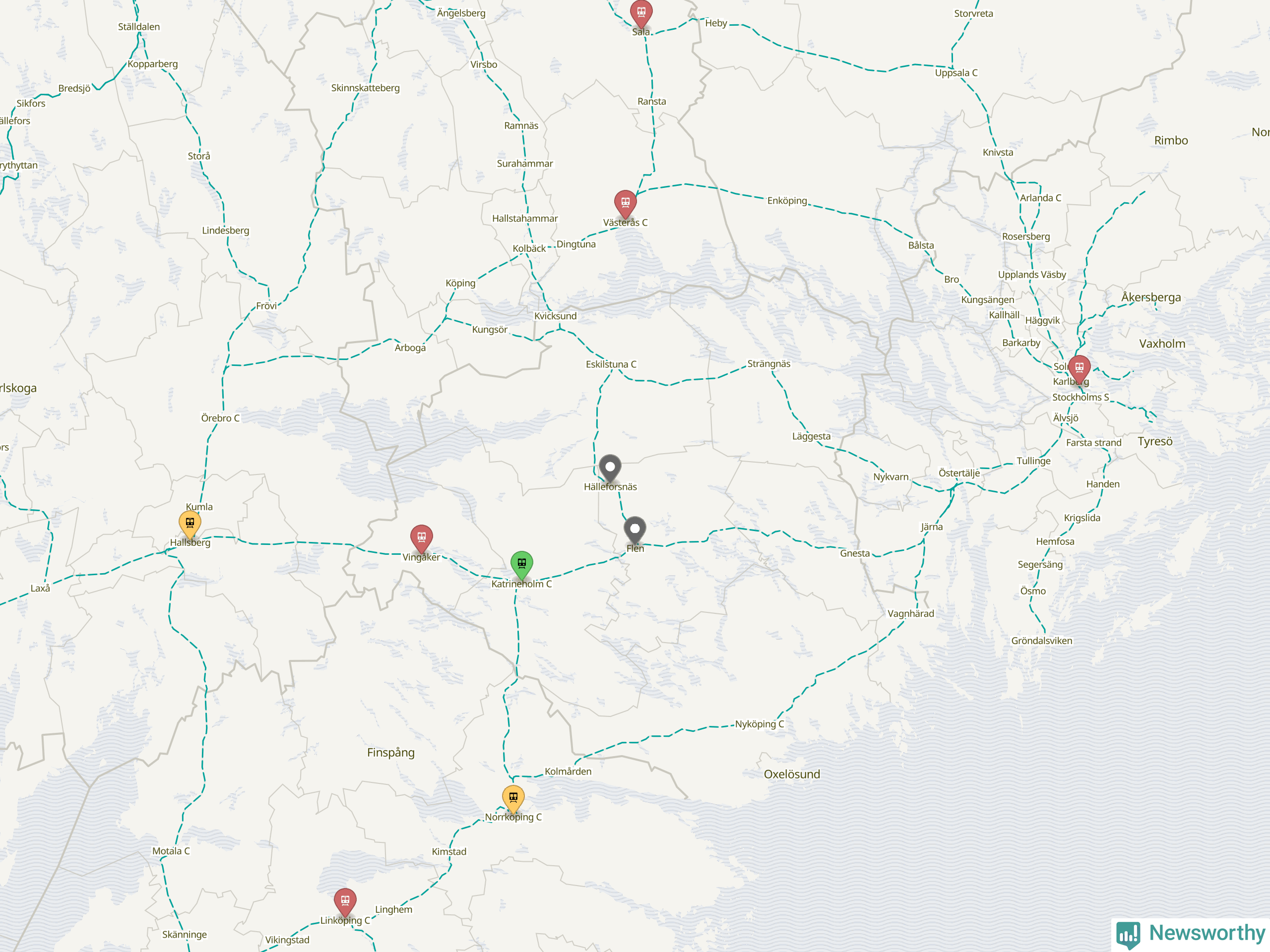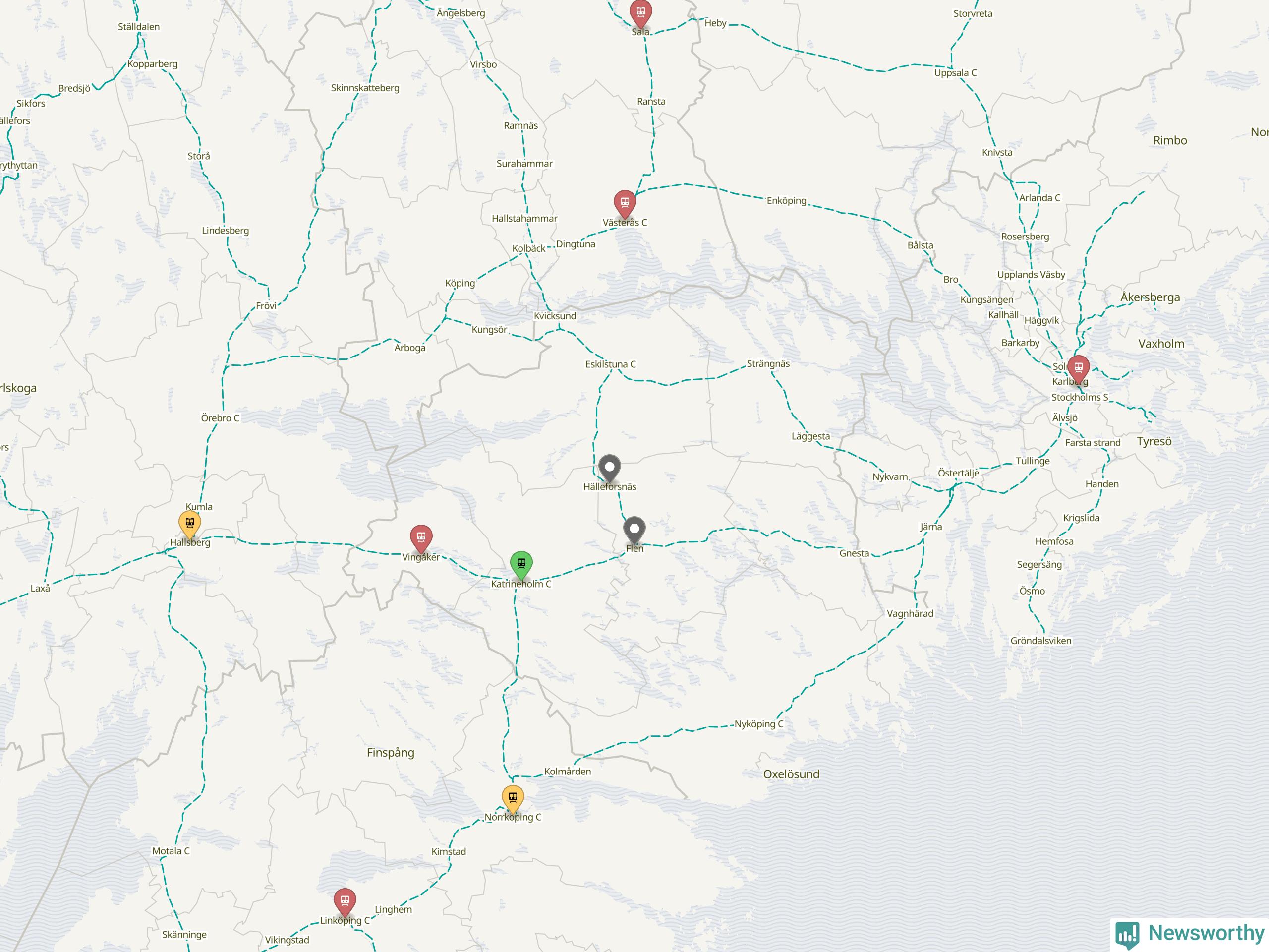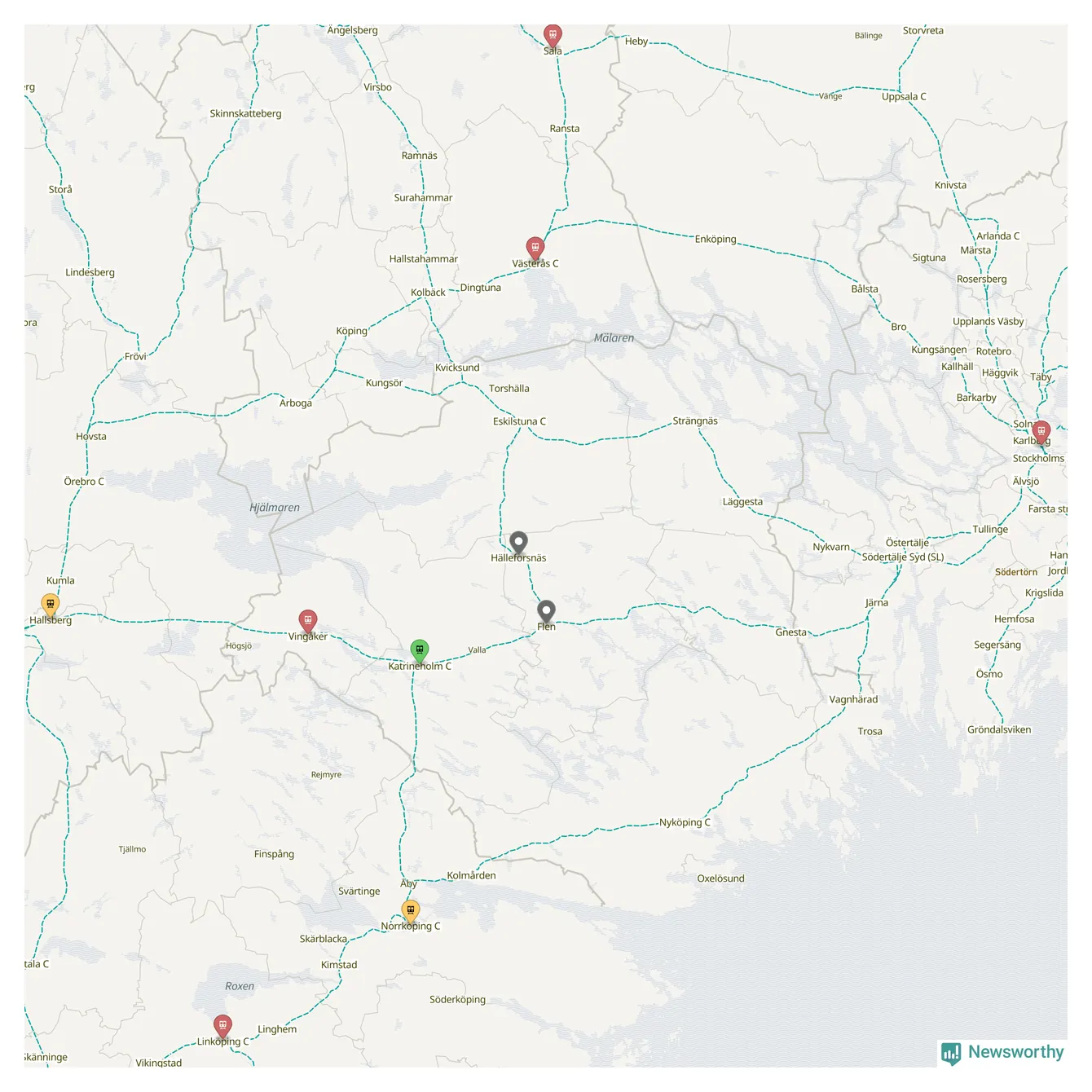 Kartdata från Mapbox, Newsworthy, OpenStreetMap och Trafikverket. Uppgifter om sträckor med passagerartrafik från jarnvag.net.