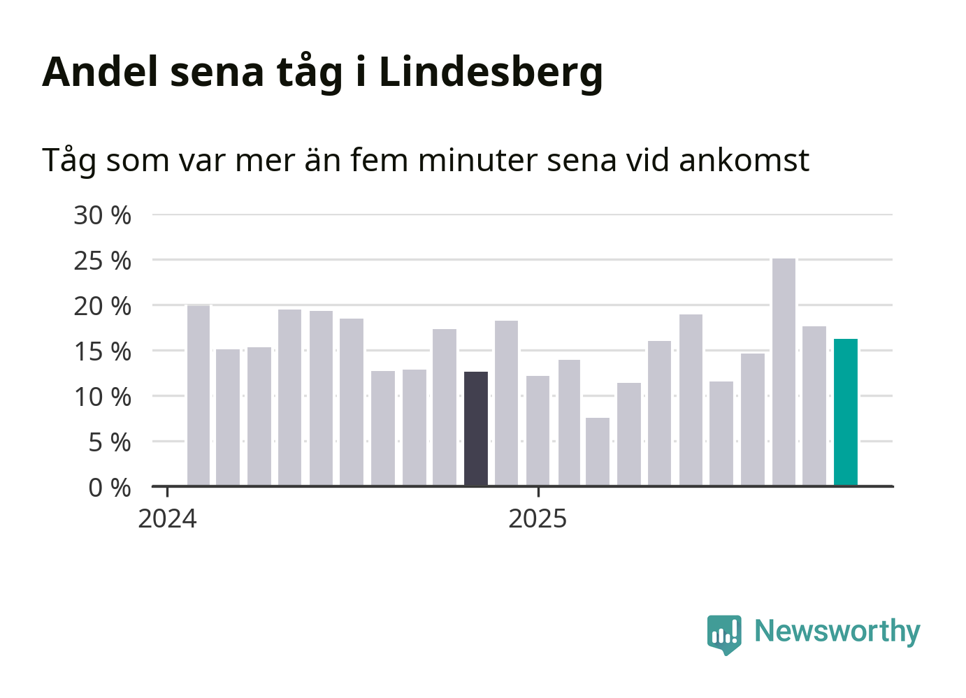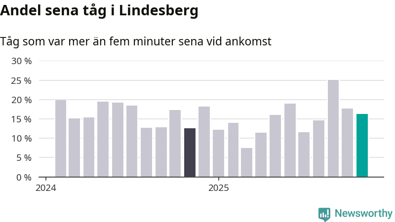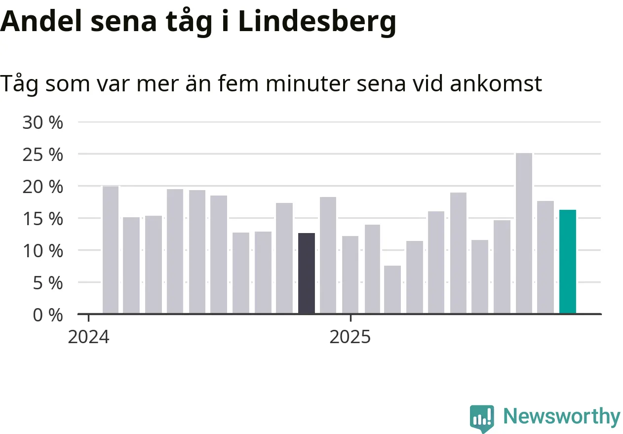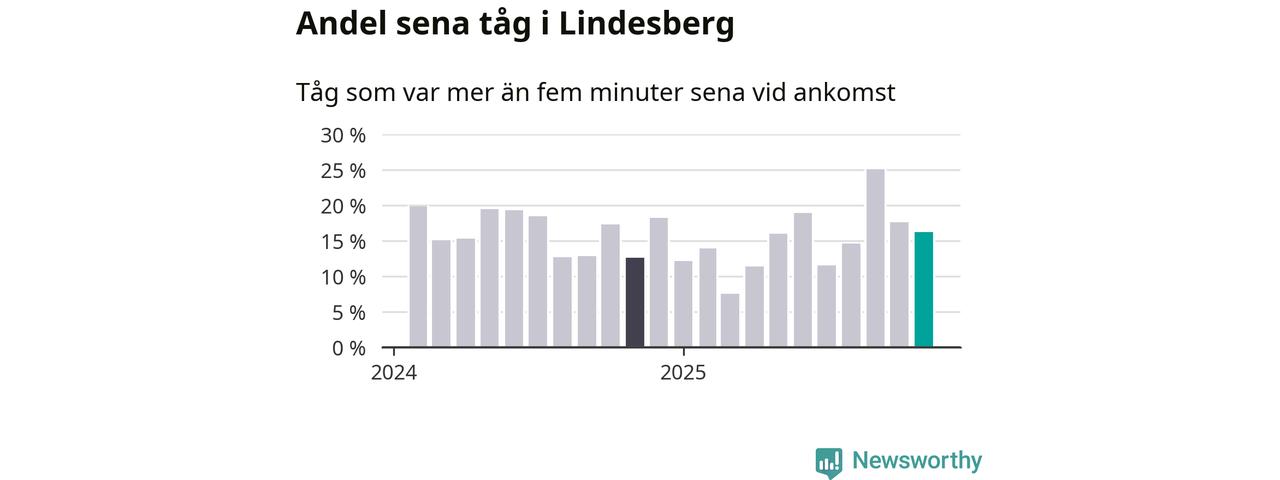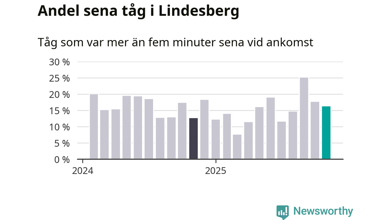 16 procent kan jämföras med 18 procent månaden innan, och 13 procent i november 2024. Siffrorna bygger på realtidsinformation om tågavgångar och ankomster från Trafikverket, som Newsworthy löpande samlar in.