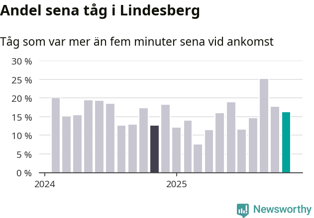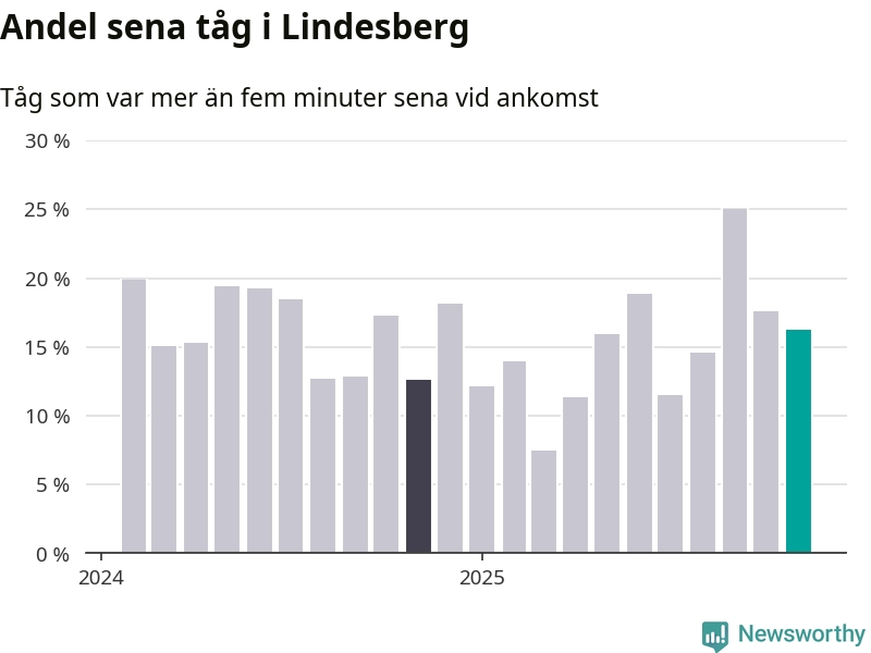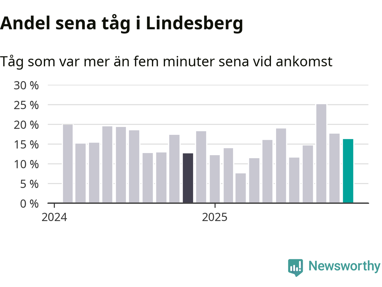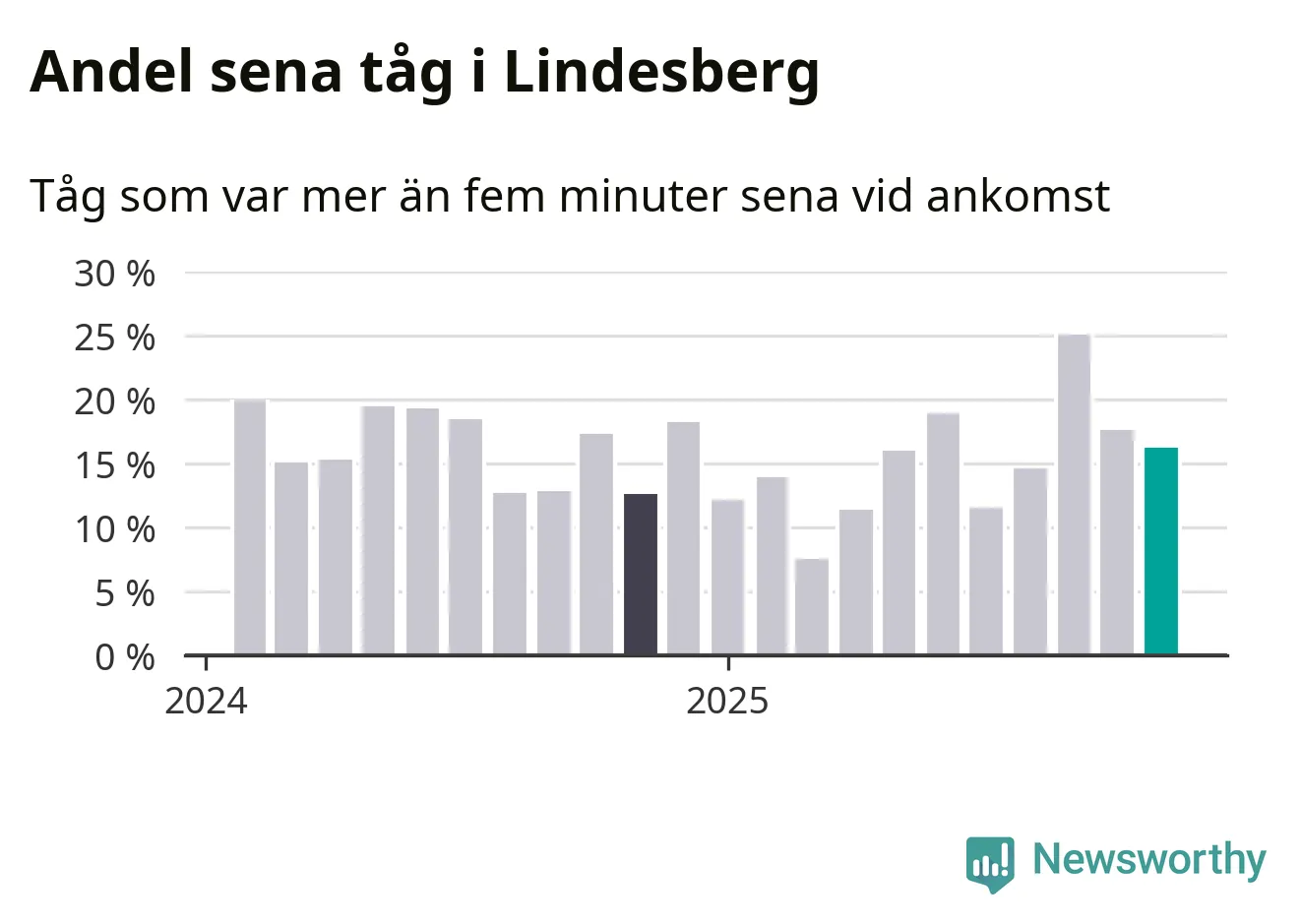 16 procent kan jämföras med 18 procent månaden innan, och 13 procent i november 2024. Siffrorna bygger på realtidsinformation om tågavgångar och ankomster från Trafikverket, som Newsworthy löpande samlar in.