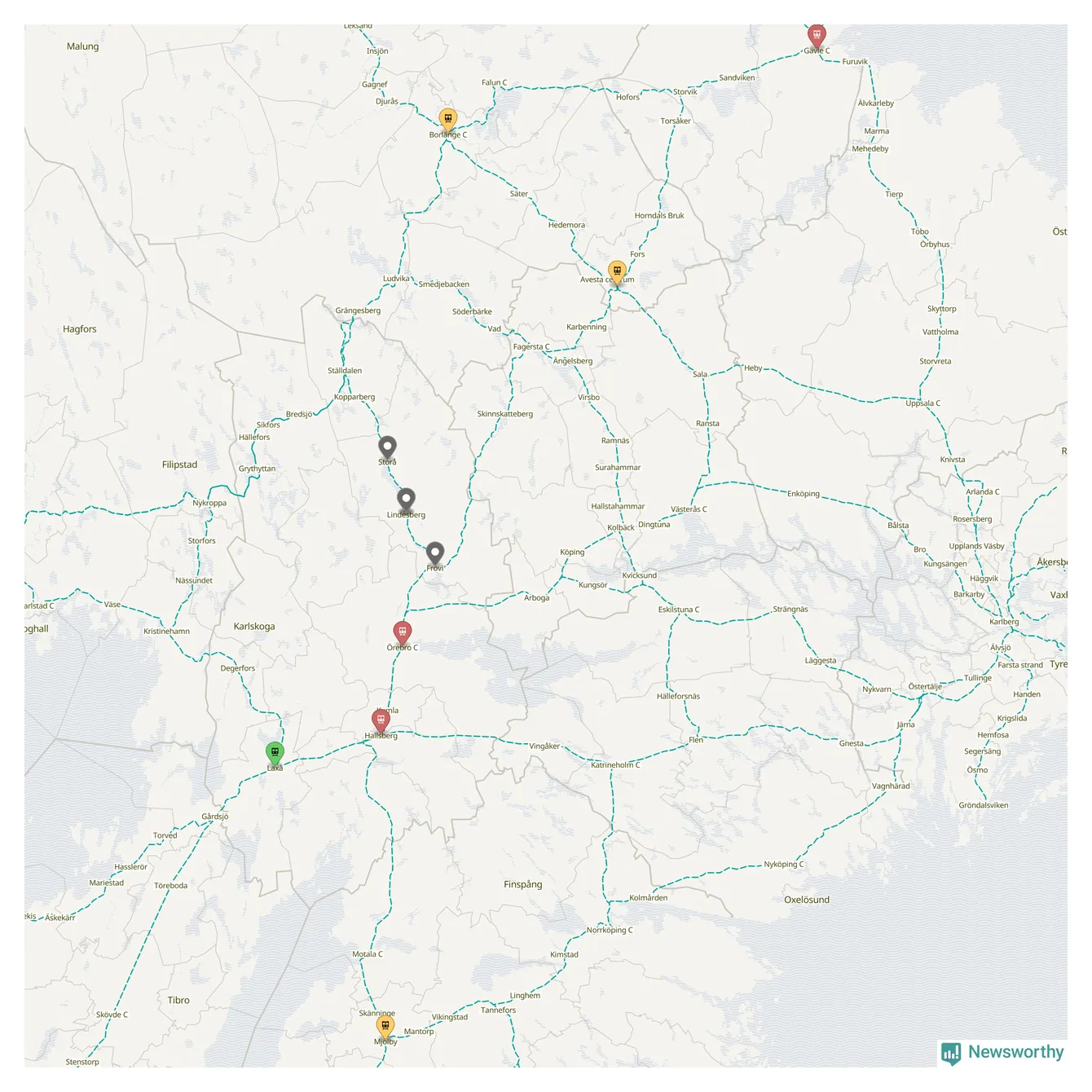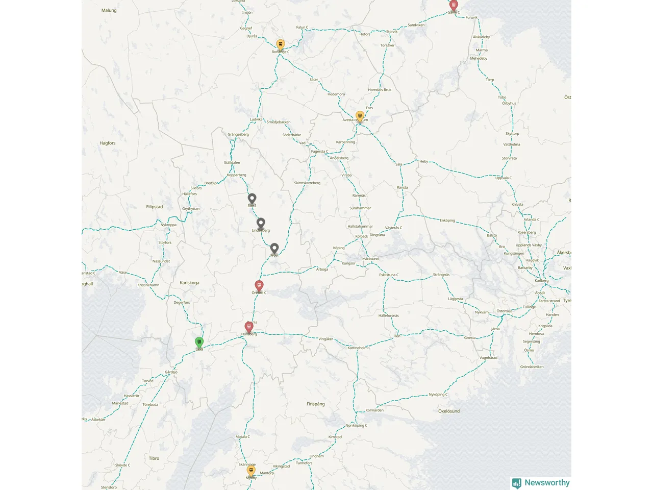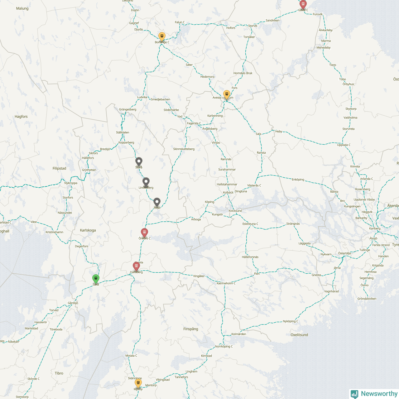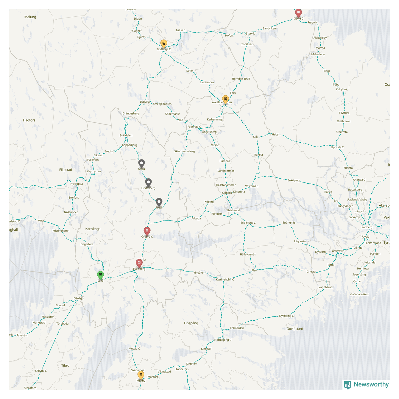 Kartdata från Mapbox, Newsworthy, OpenStreetMap och Trafikverket. Uppgifter om sträckor med passagerartrafik från jarnvag.net.