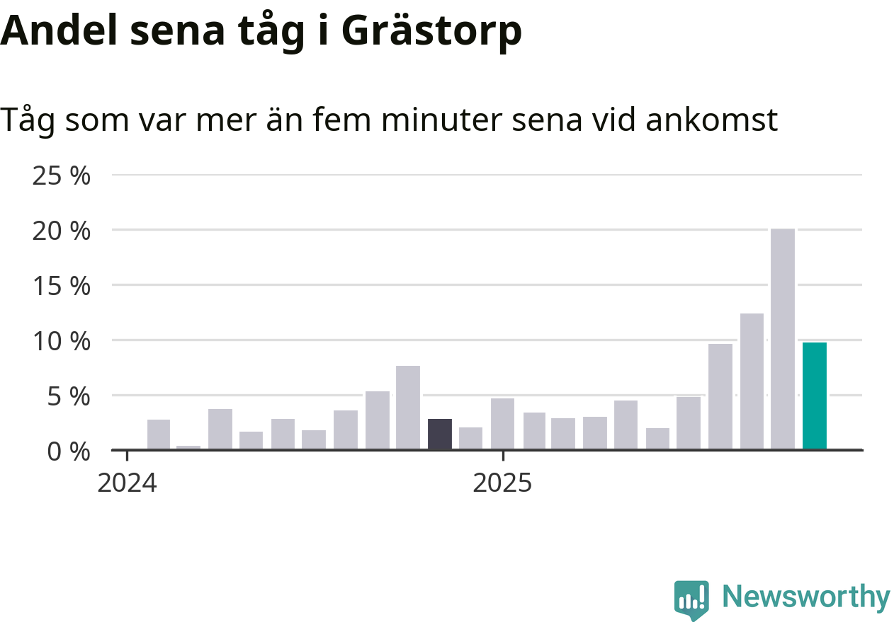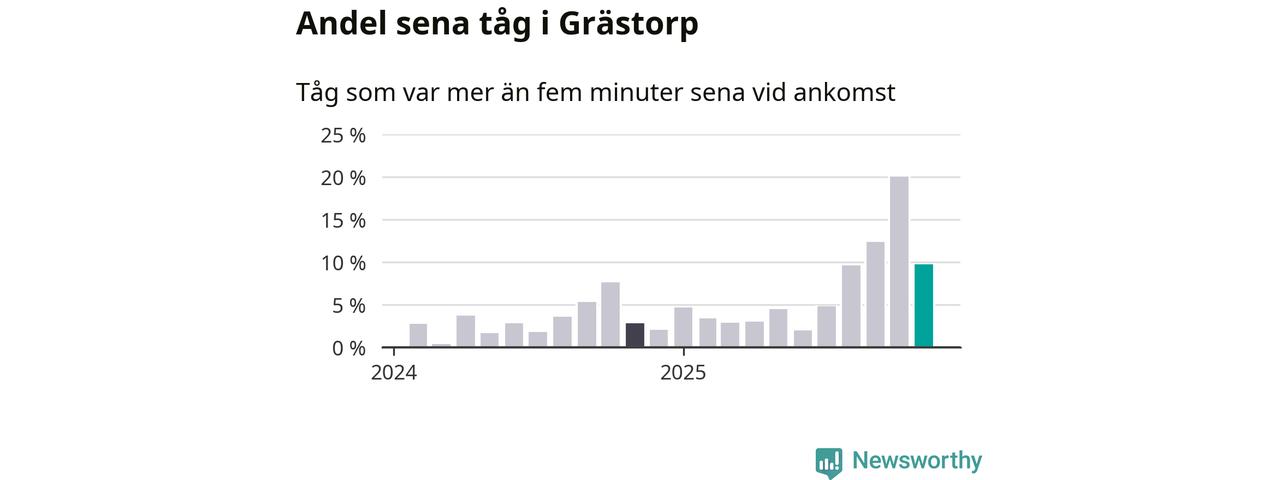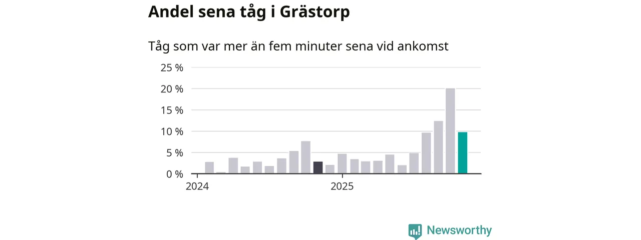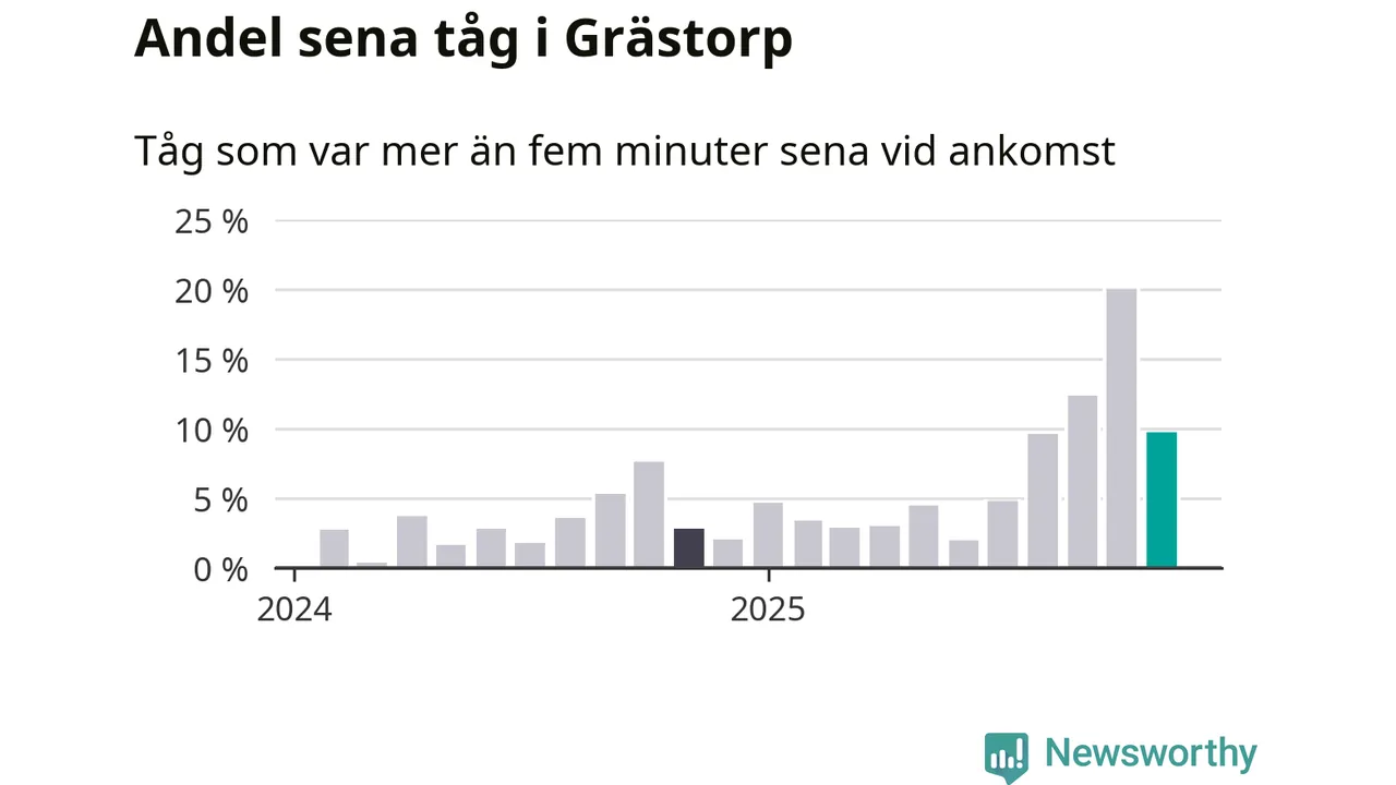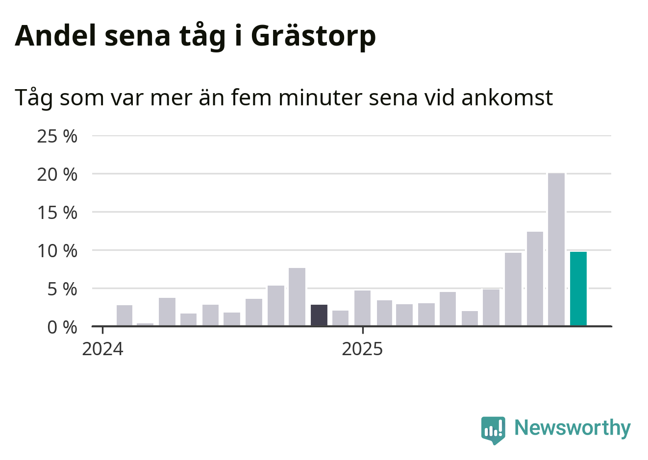 Tio procent kan jämföras med 20 procent månaden innan, och tre procent i november 2024. Siffrorna bygger på realtidsinformation om tågavgångar och ankomster från Trafikverket, som Newsworthy löpande samlar in.