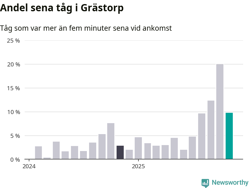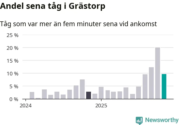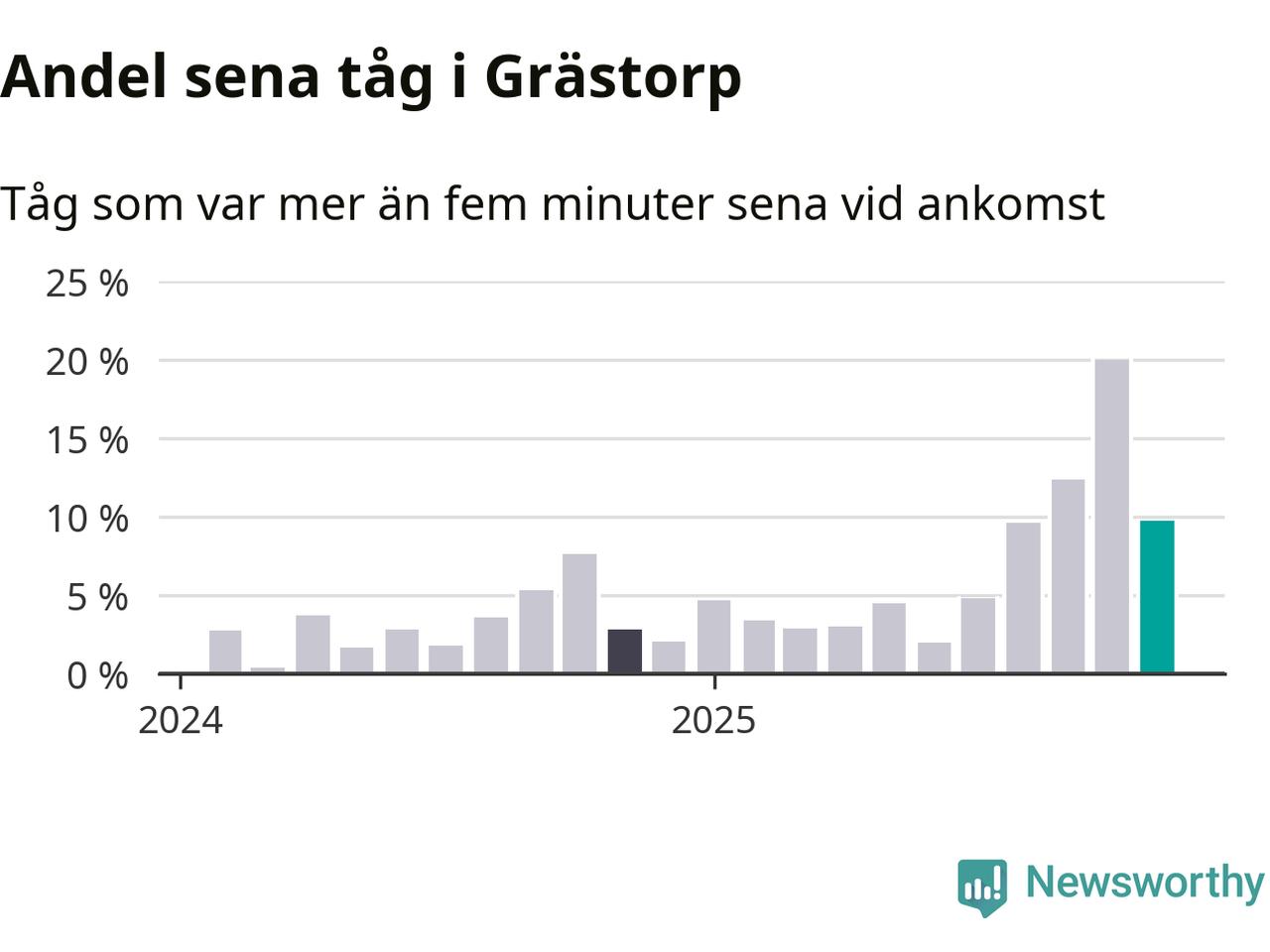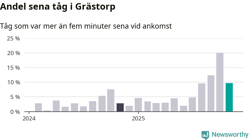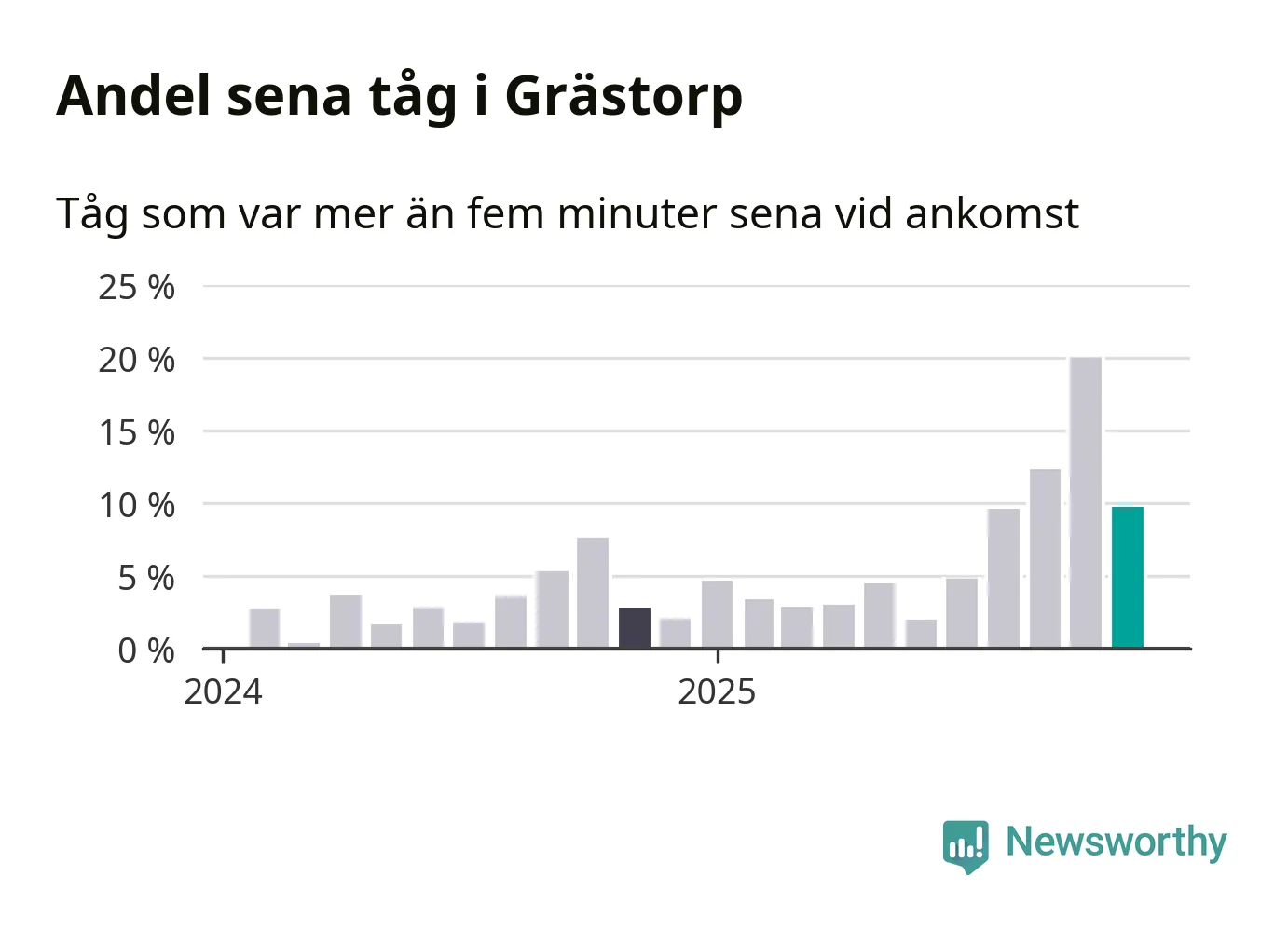 Tio procent kan jämföras med 20 procent månaden innan, och tre procent i november 2024. Siffrorna bygger på realtidsinformation om tågavgångar och ankomster från Trafikverket, som Newsworthy löpande samlar in.