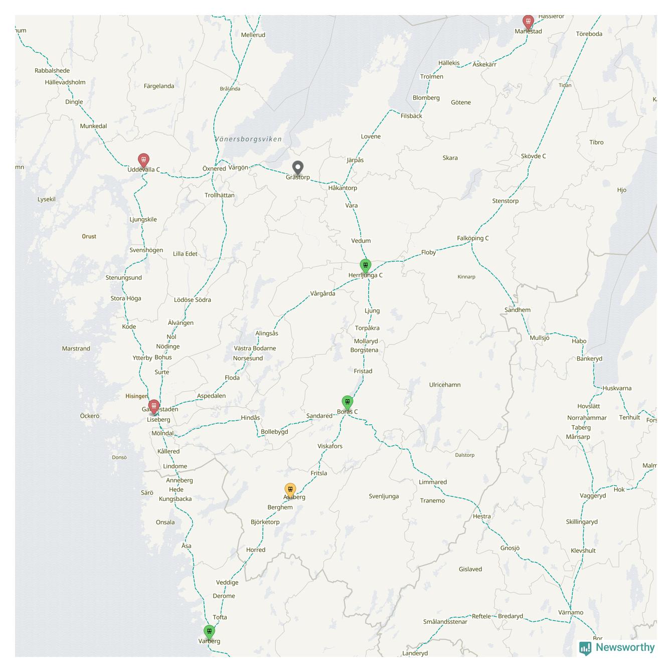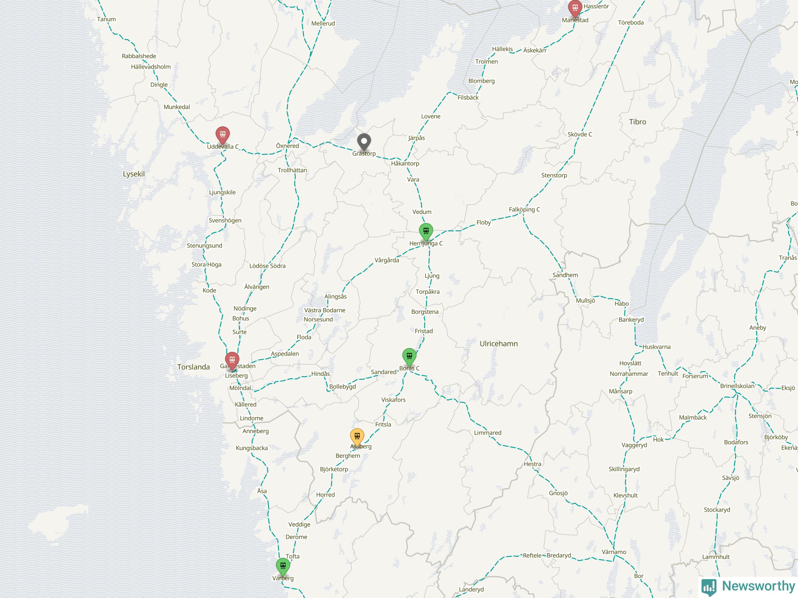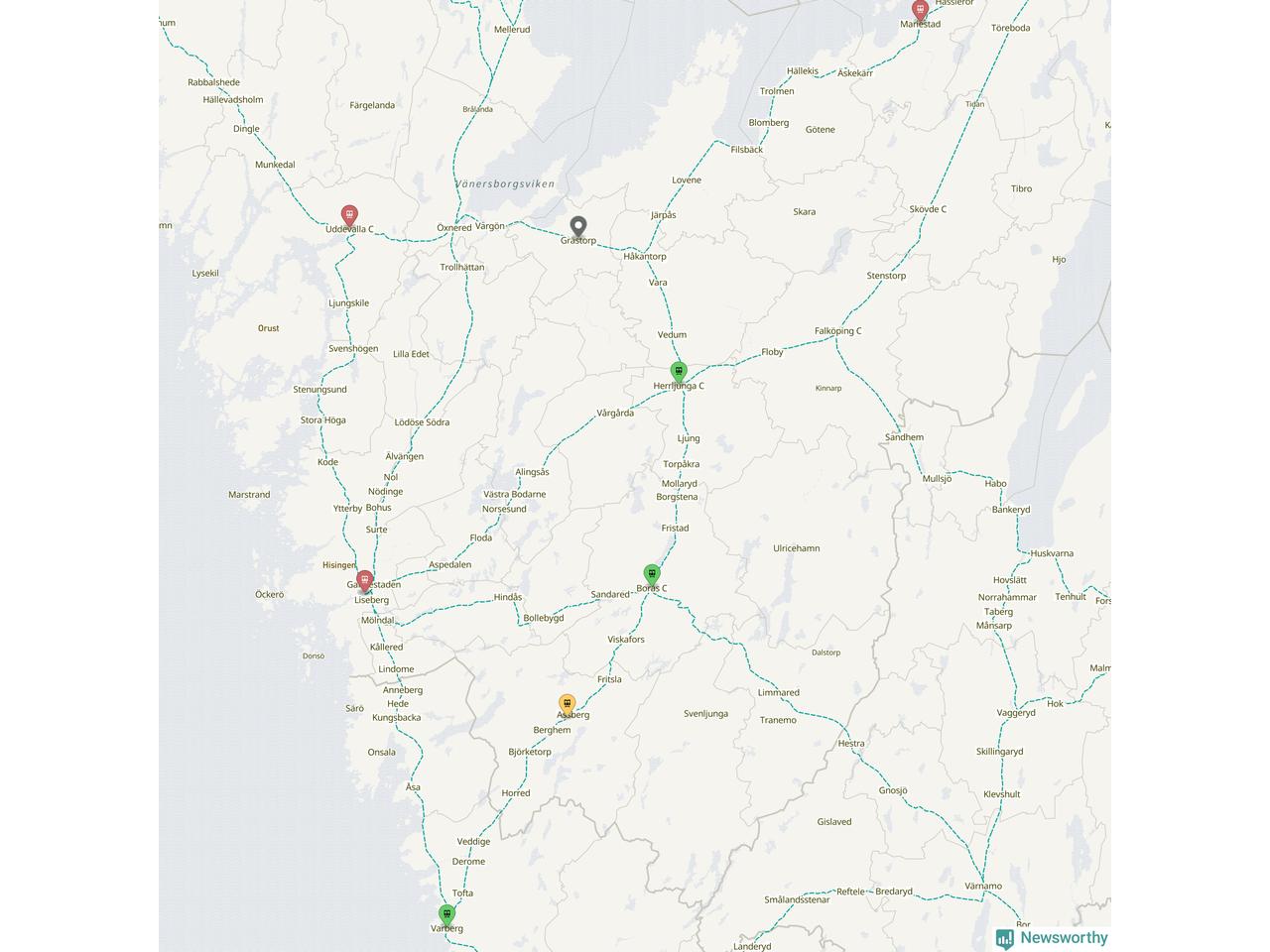 Kartdata från Mapbox, Newsworthy, OpenStreetMap och Trafikverket. Uppgifter om sträckor med passagerartrafik från jarnvag.net.