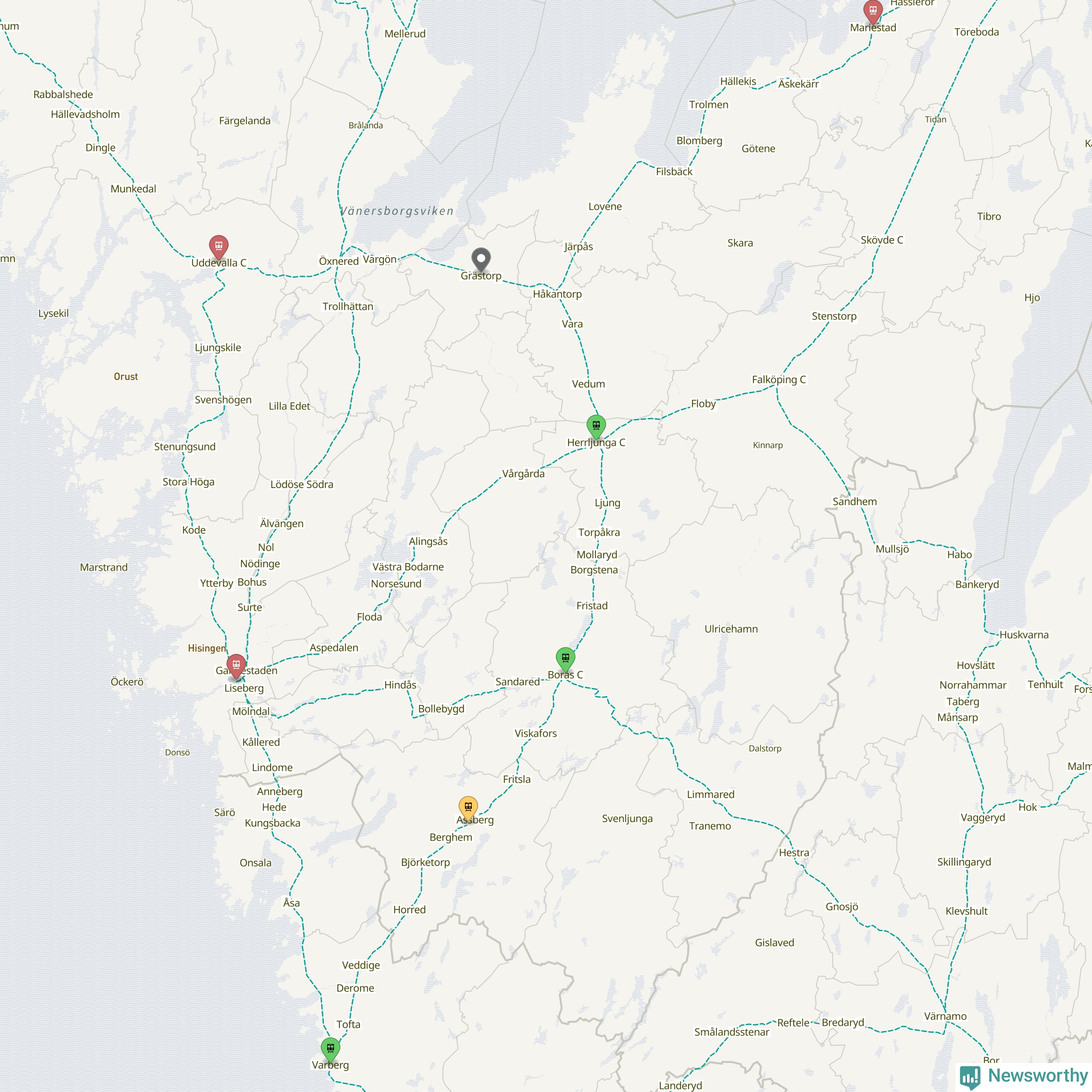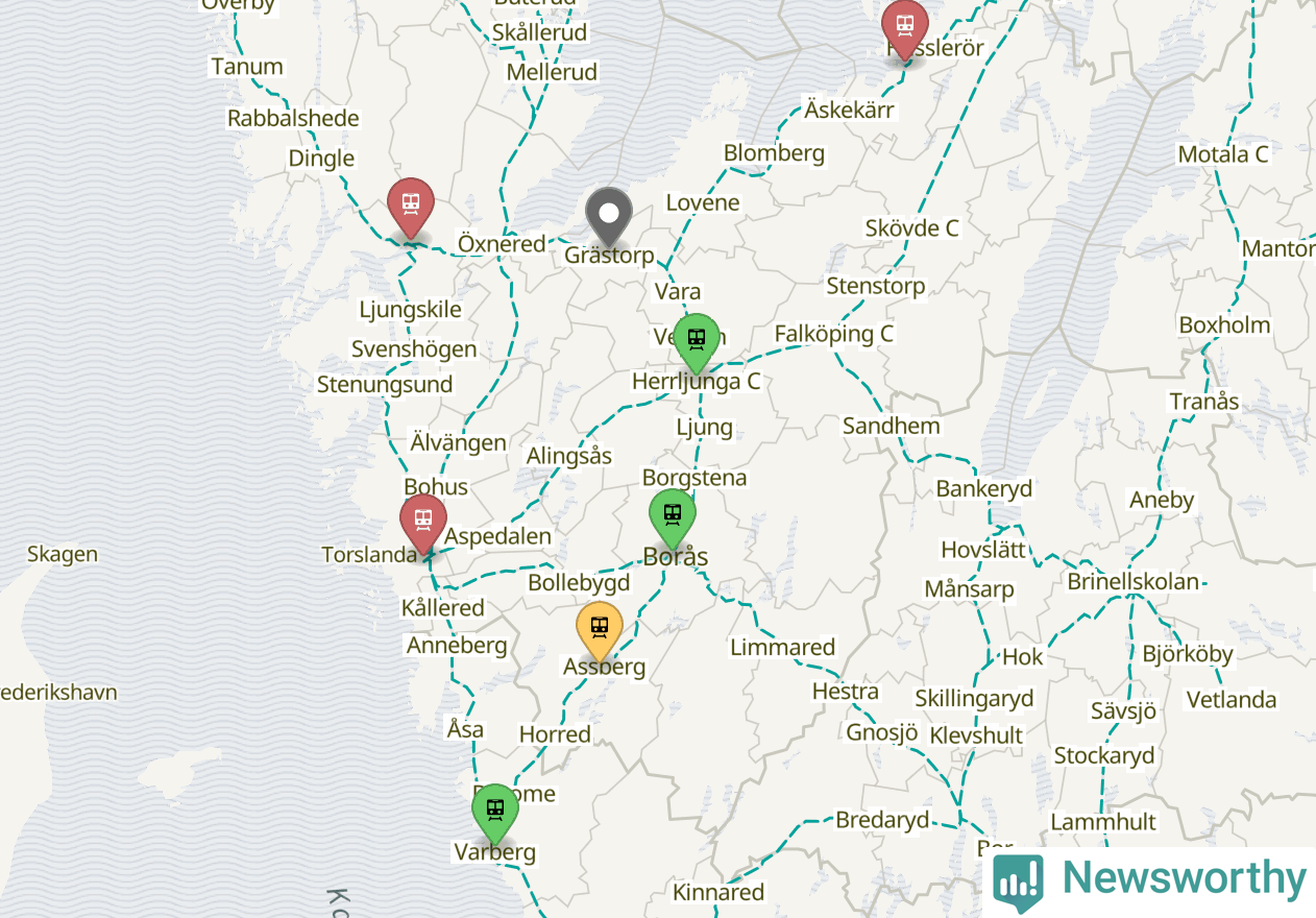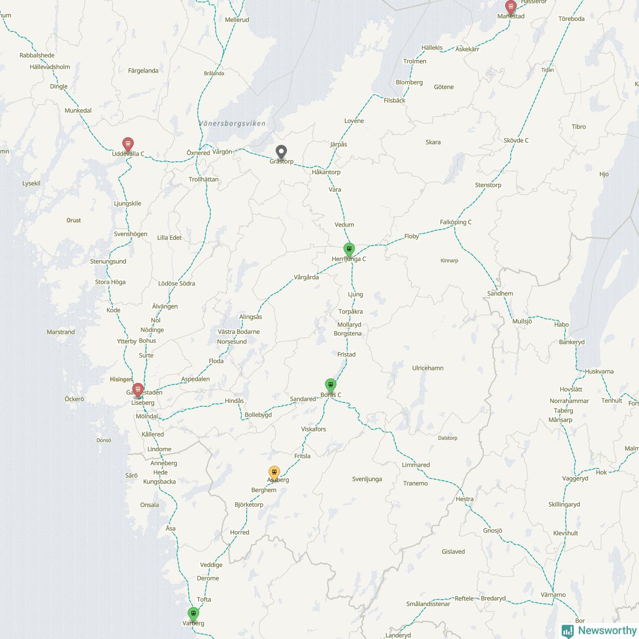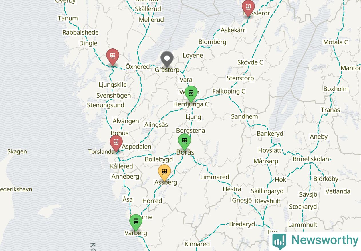 Som försenat räknas ett tåg när det varit minst fem minuter sent vid ankomst till stationerna i Grästorps kommun.