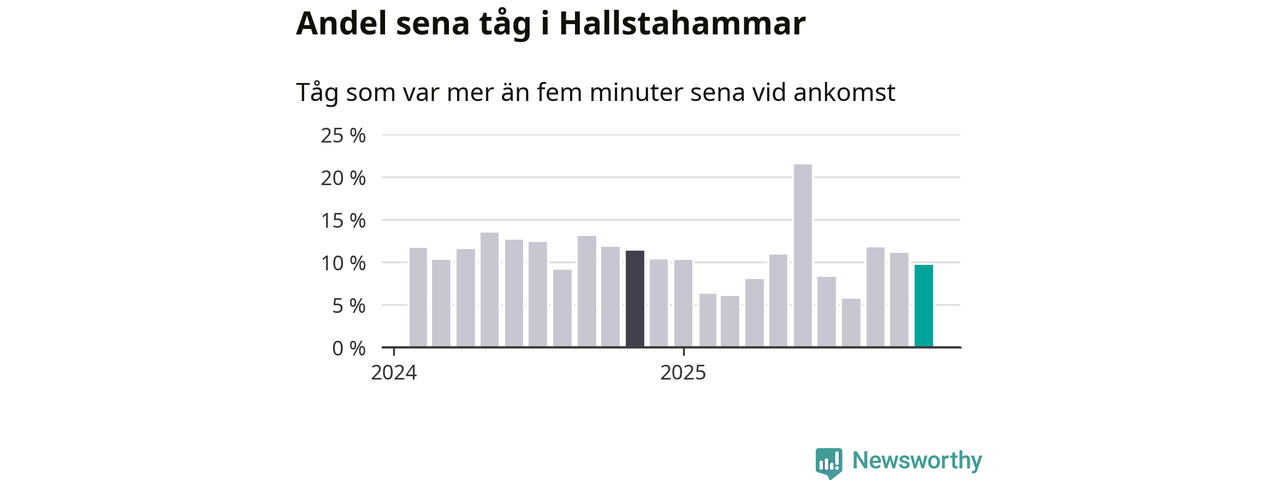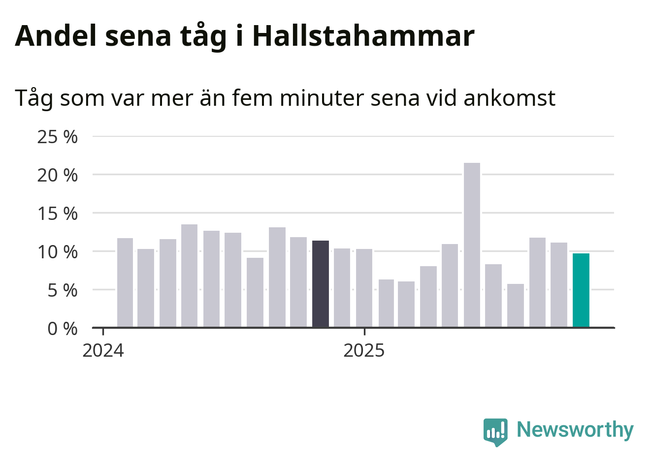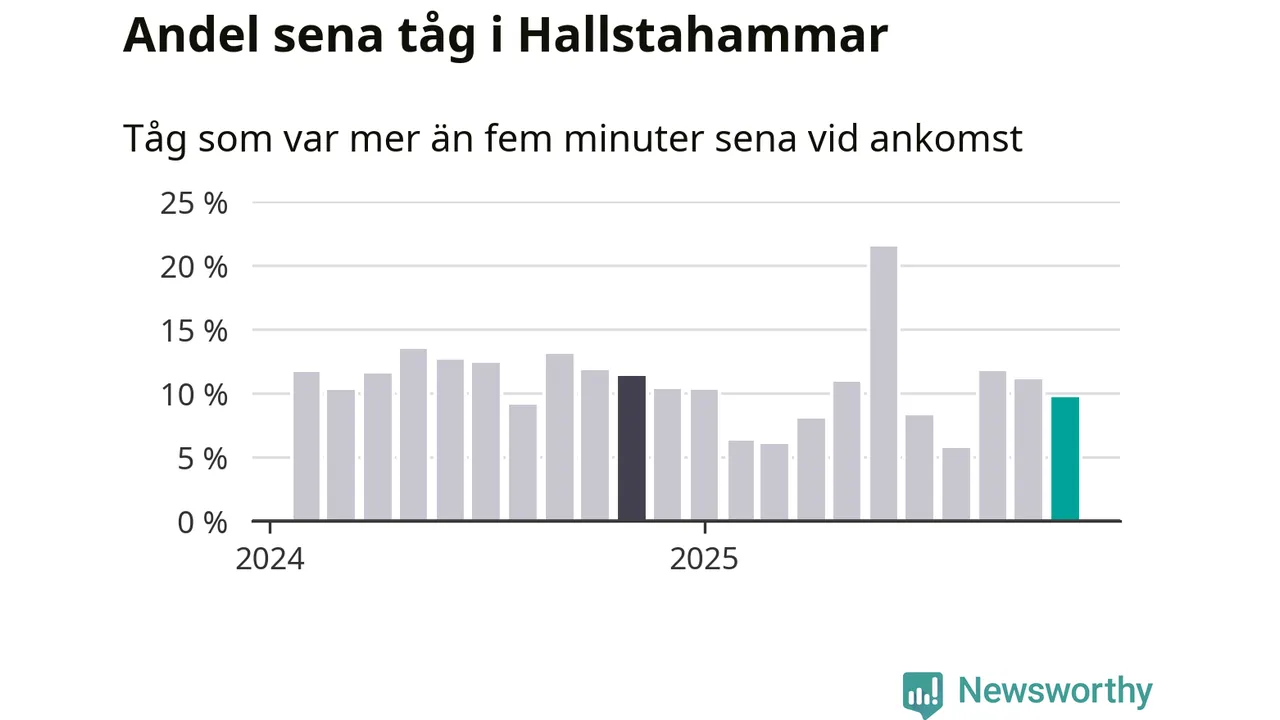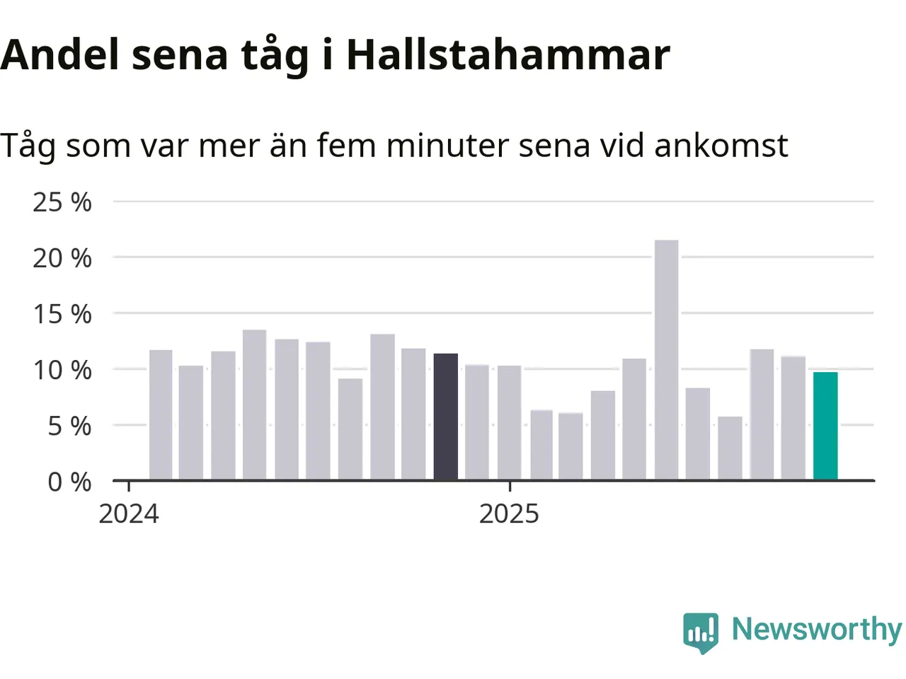 Tio procent kan jämföras med elva procent månaden innan, och elva procent i november 2024. Siffrorna bygger på realtidsinformation om tågavgångar och ankomster från Trafikverket, som Newsworthy löpande samlar in.