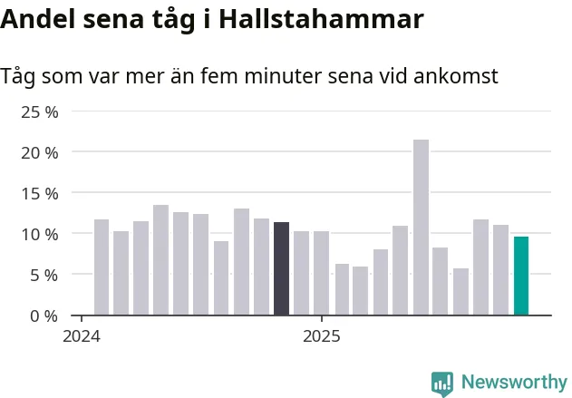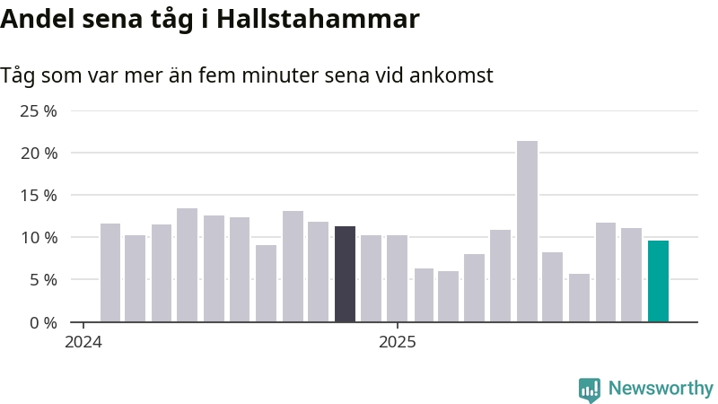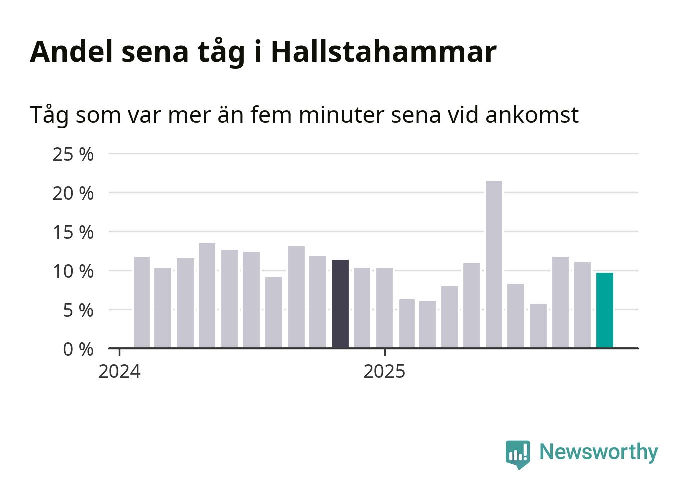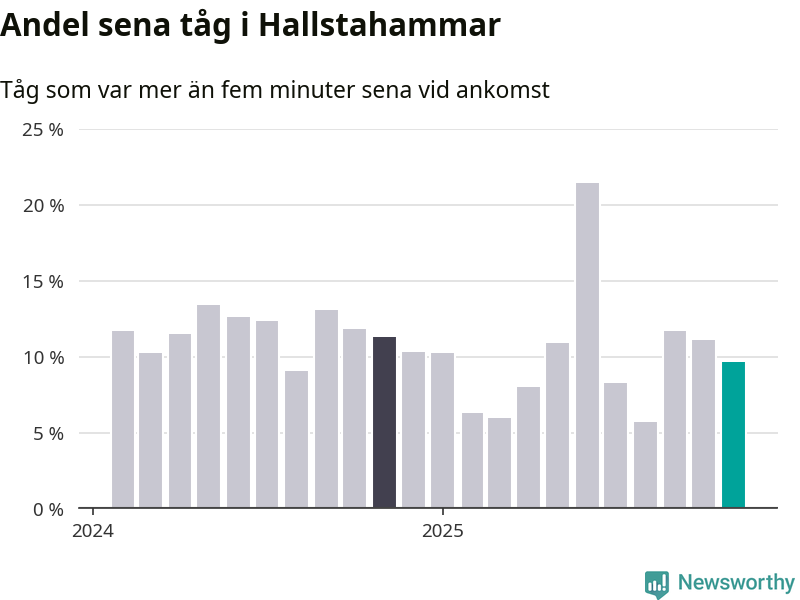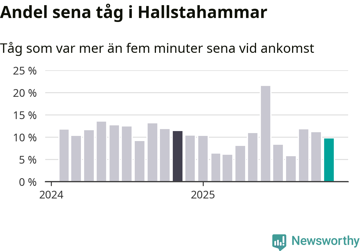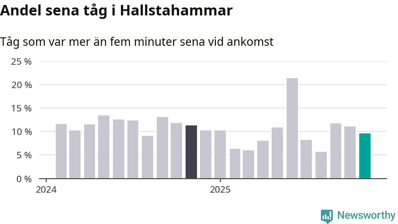 Tio procent kan jämföras med elva procent månaden innan, och elva procent i november 2024. Siffrorna bygger på realtidsinformation om tågavgångar och ankomster från Trafikverket, som Newsworthy löpande samlar in.