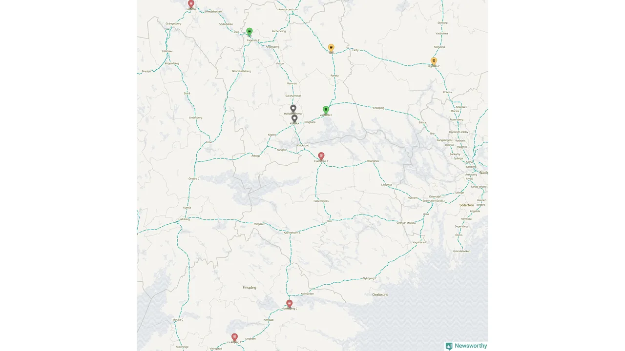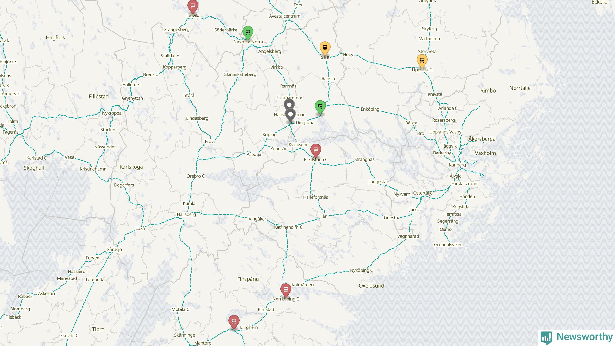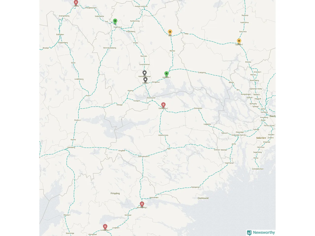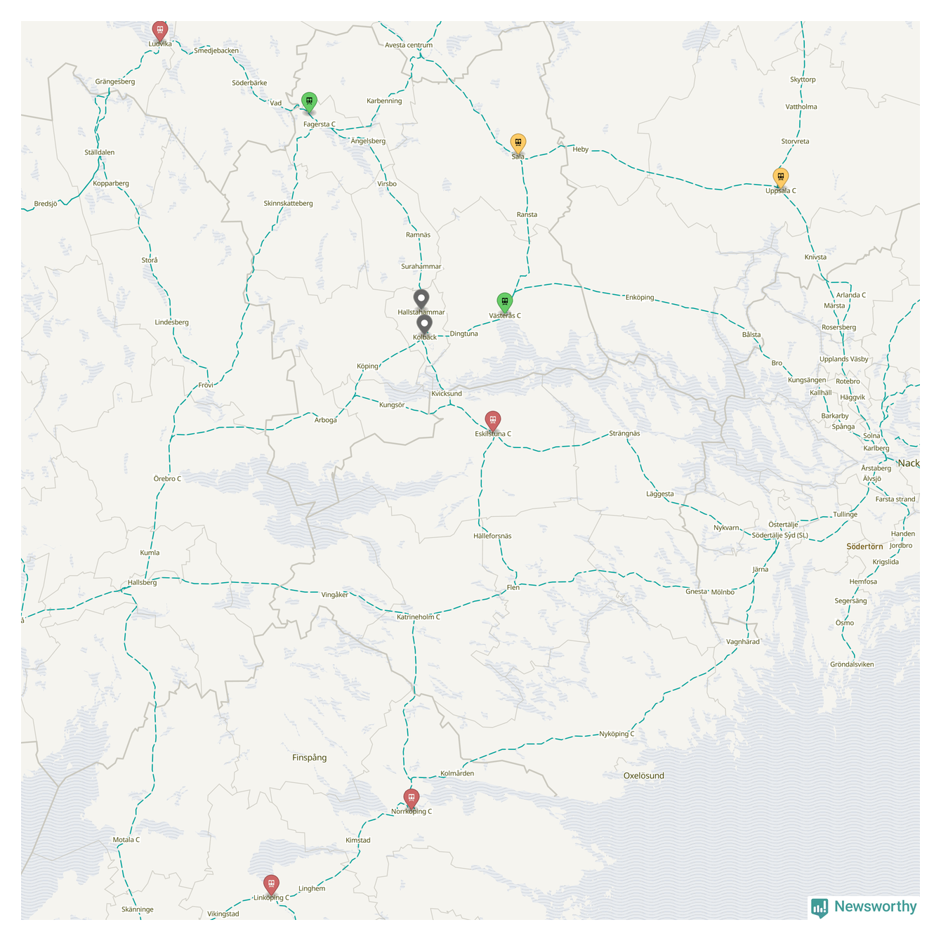 Kartdata från Mapbox, Newsworthy, OpenStreetMap och Trafikverket. Uppgifter om sträckor med passagerartrafik från jarnvag.net.