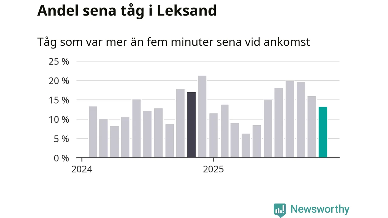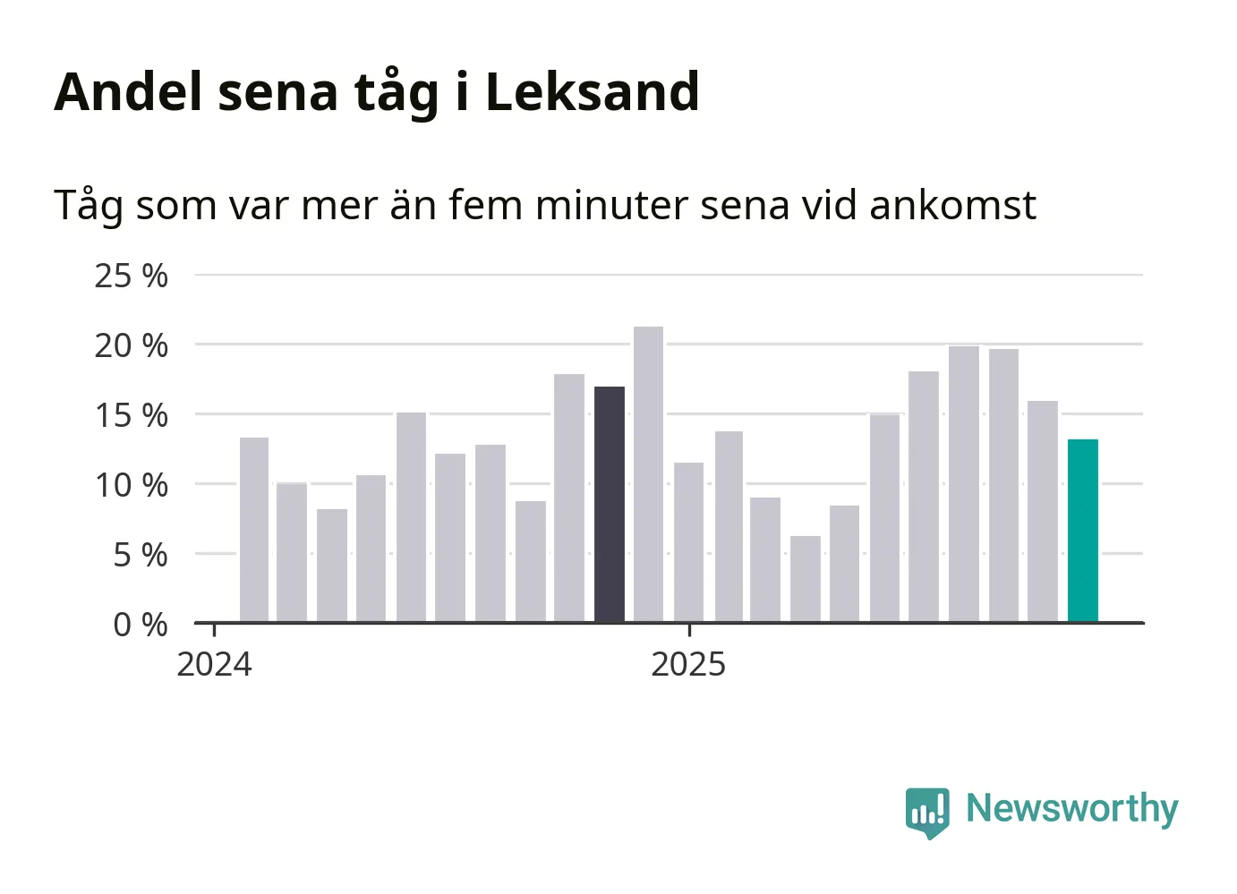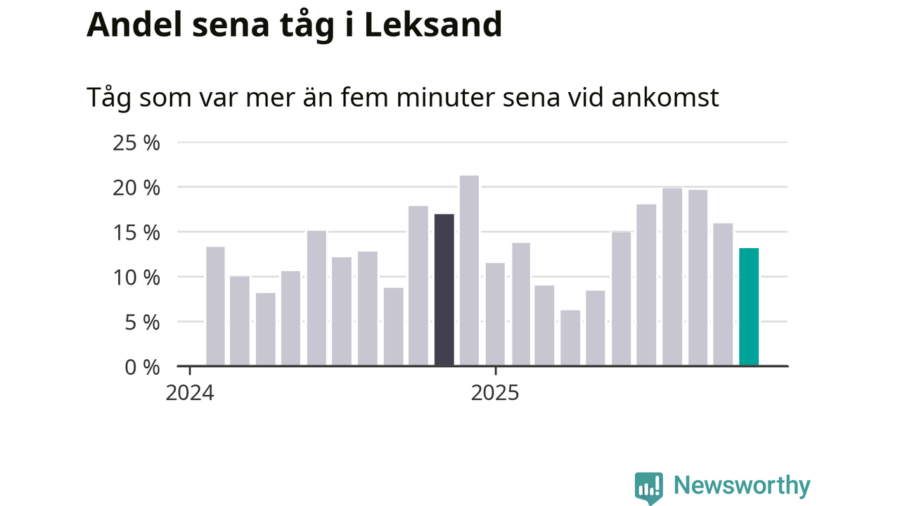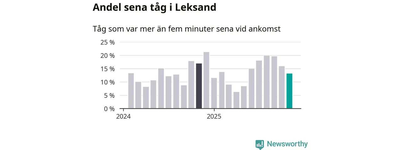 13 procent kan jämföras med 16 procent månaden innan, och 17 procent i november 2024. November är den tredje månaden i rad med minskande förseningar i Leksand. Siffrorna bygger på realtidsinformation om tågavgångar och ankomster från Trafikverket, som Newsworthy löpande samlar in.