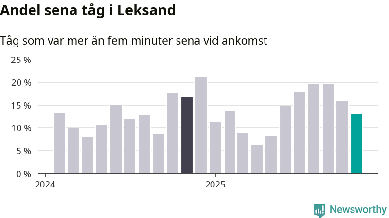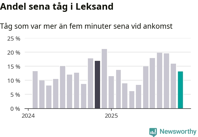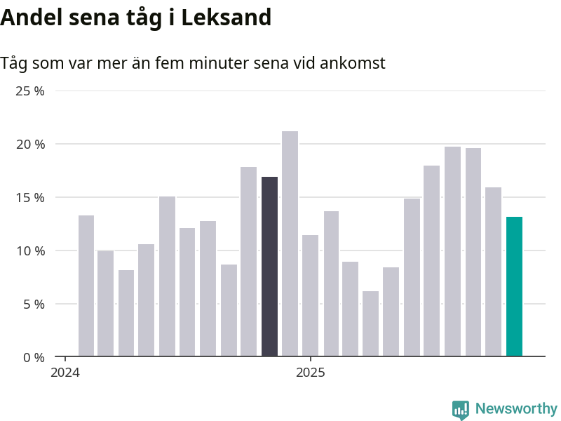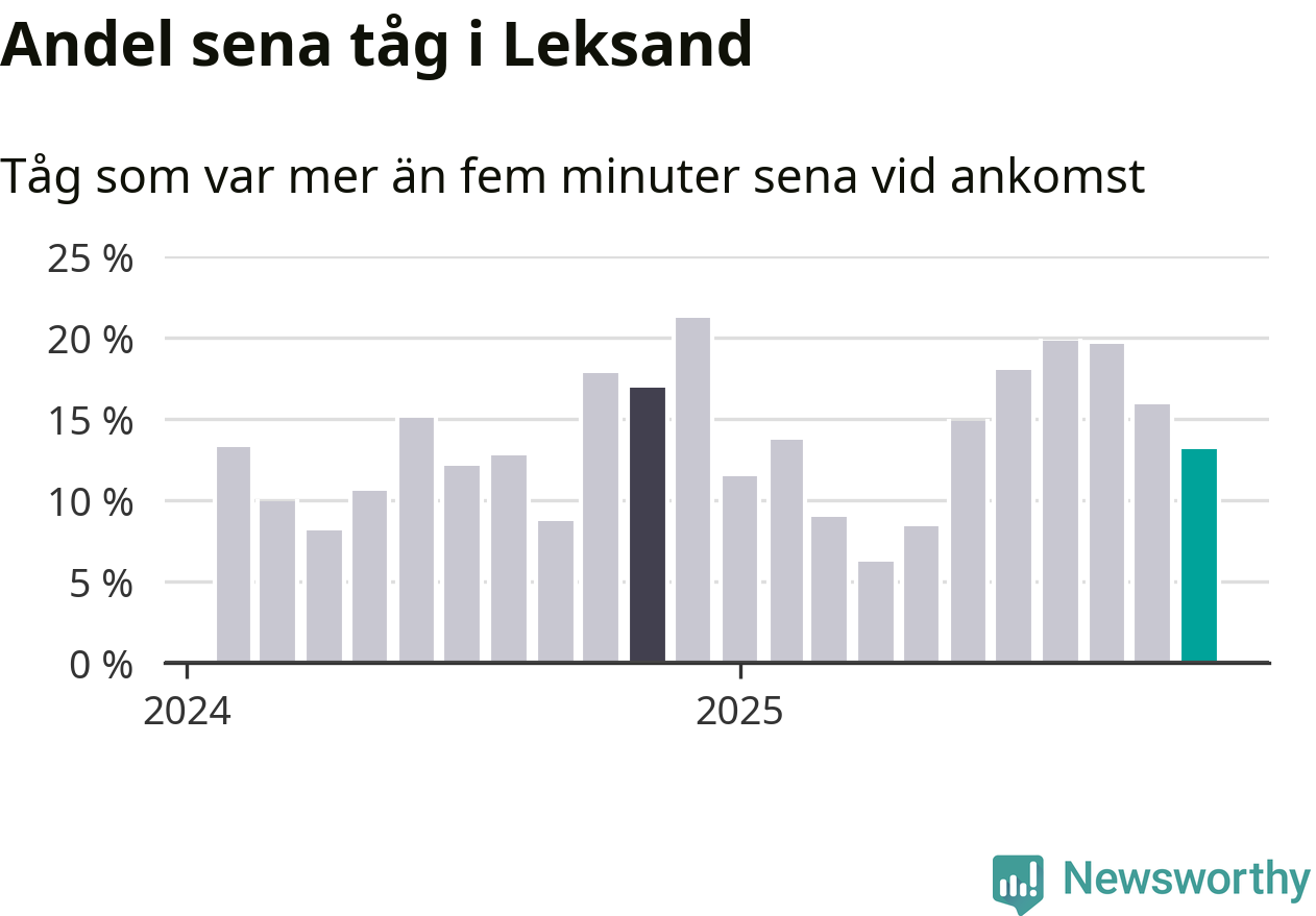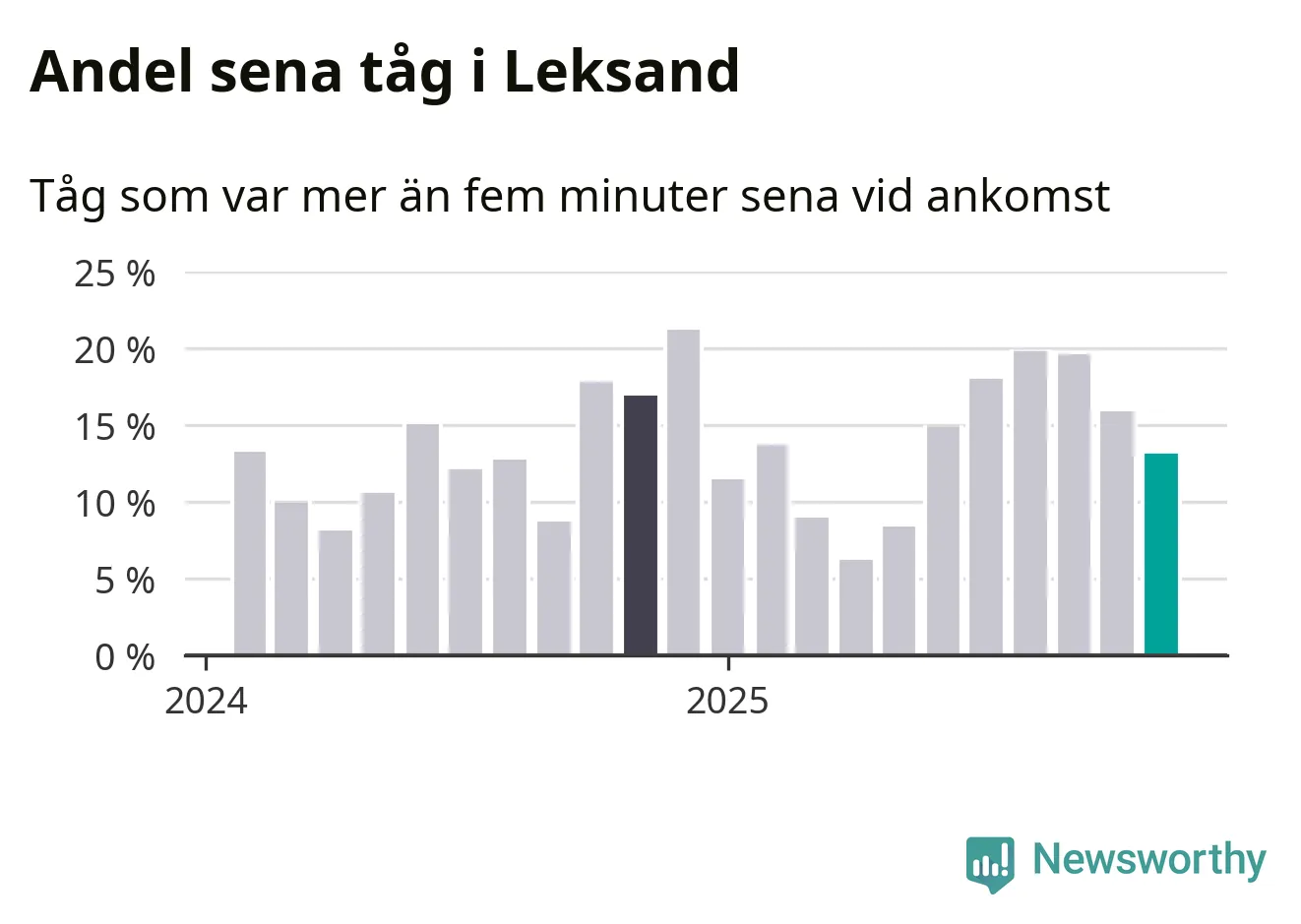 13 procent kan jämföras med 16 procent månaden innan, och 17 procent i november 2024. November är den tredje månaden i rad med minskande förseningar i Leksand. Siffrorna bygger på realtidsinformation om tågavgångar och ankomster från Trafikverket, som Newsworthy löpande samlar in.