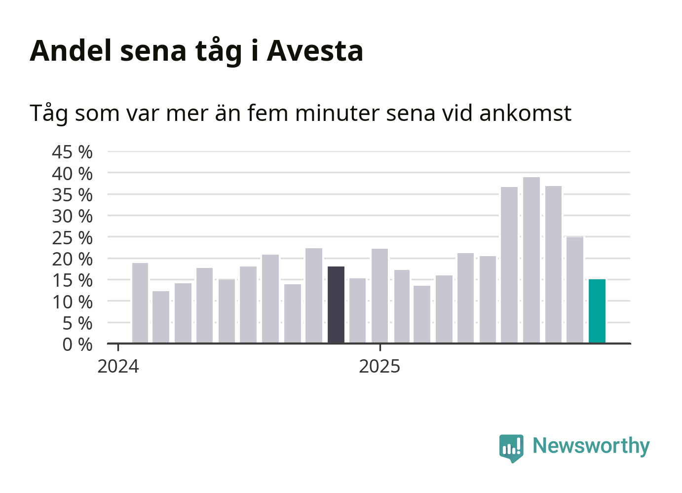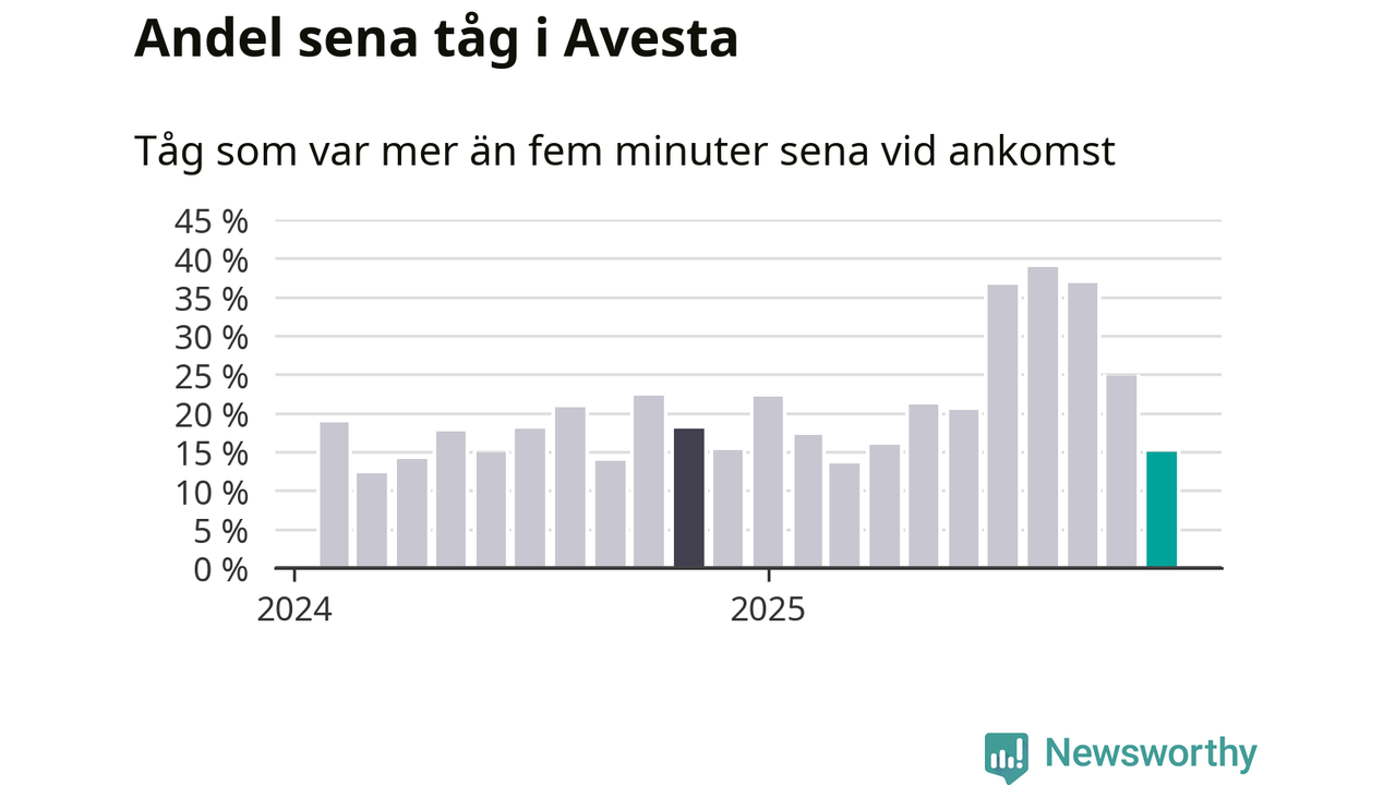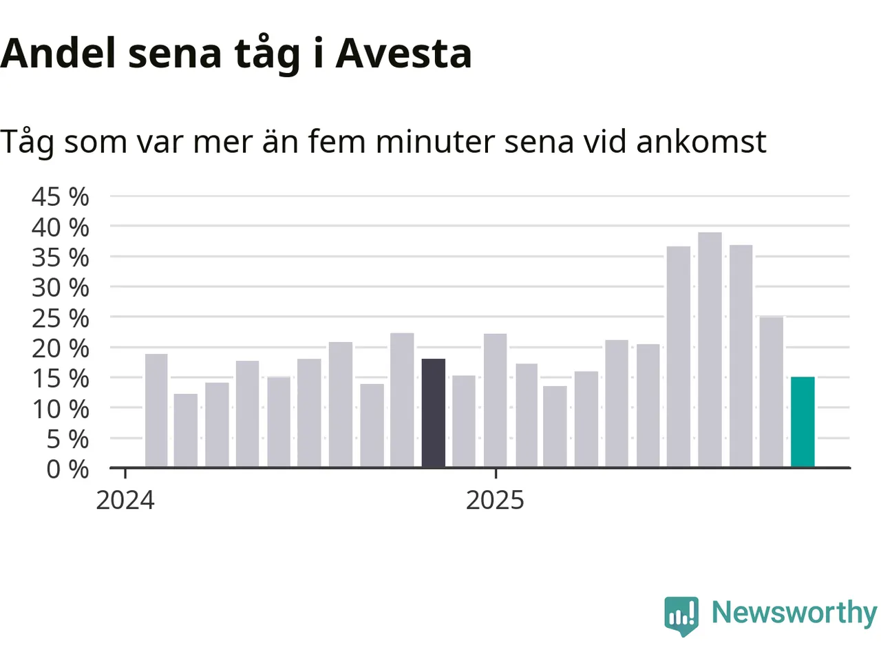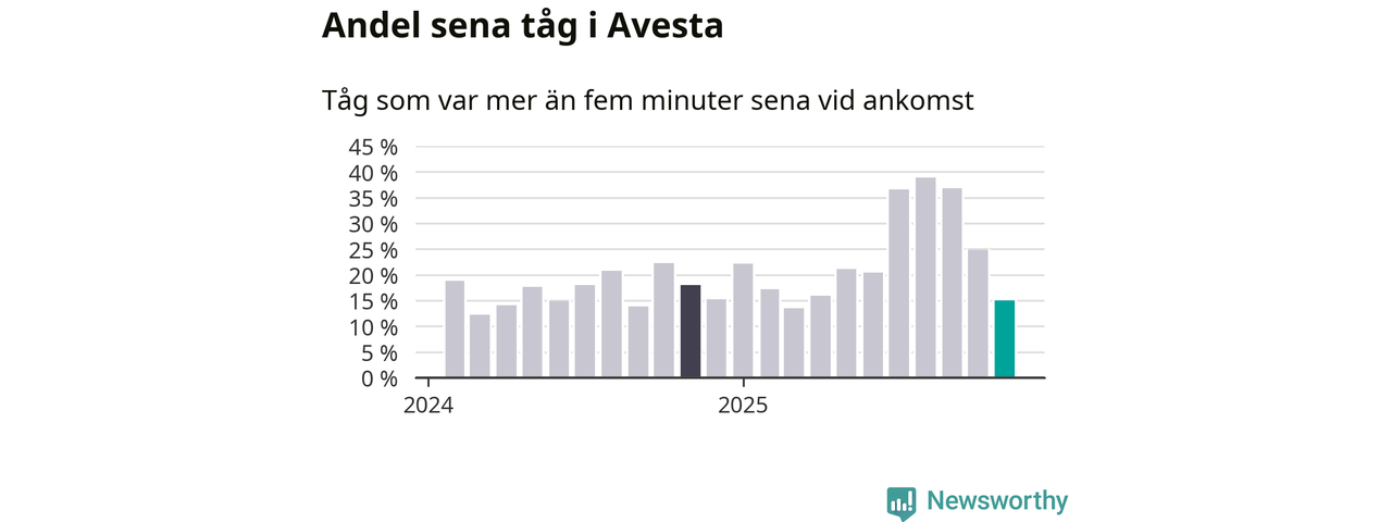 15 procent kan jämföras med 25 procent månaden innan, och 18 procent i november 2024. November är den tredje månaden i rad med minskande förseningar i Avesta. Siffrorna bygger på realtidsinformation om tågavgångar och ankomster från Trafikverket, som Newsworthy löpande samlar in.