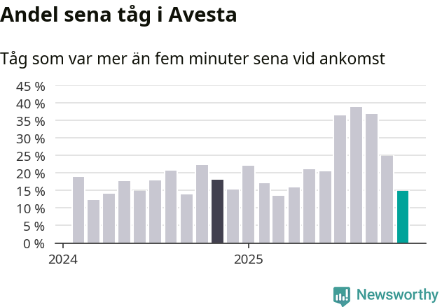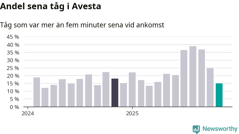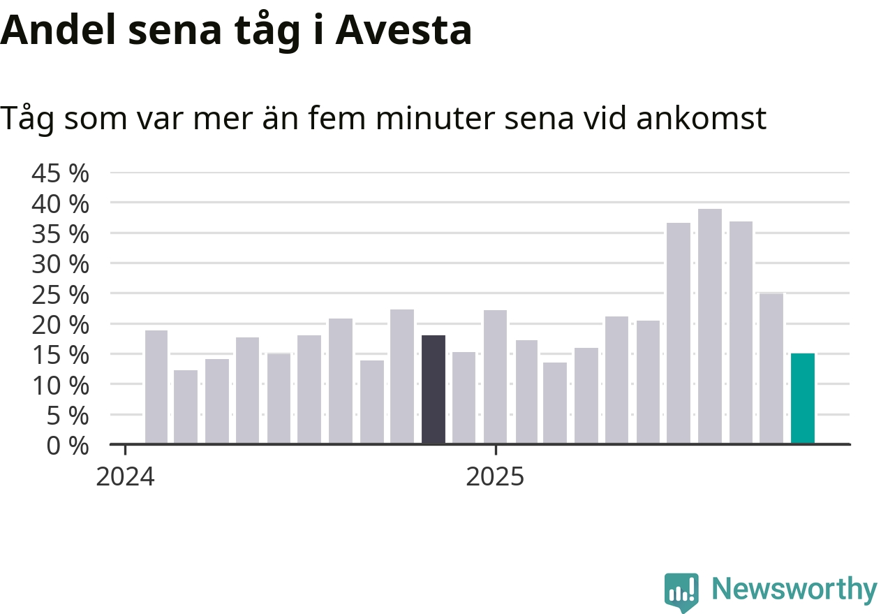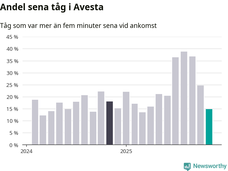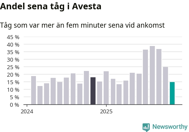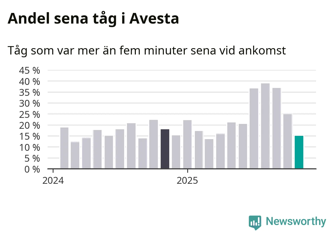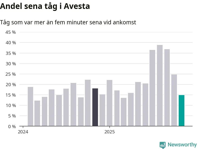 15 procent kan jämföras med 25 procent månaden innan, och 18 procent i november 2024. November är den tredje månaden i rad med minskande förseningar i Avesta. Siffrorna bygger på realtidsinformation om tågavgångar och ankomster från Trafikverket, som Newsworthy löpande samlar in.