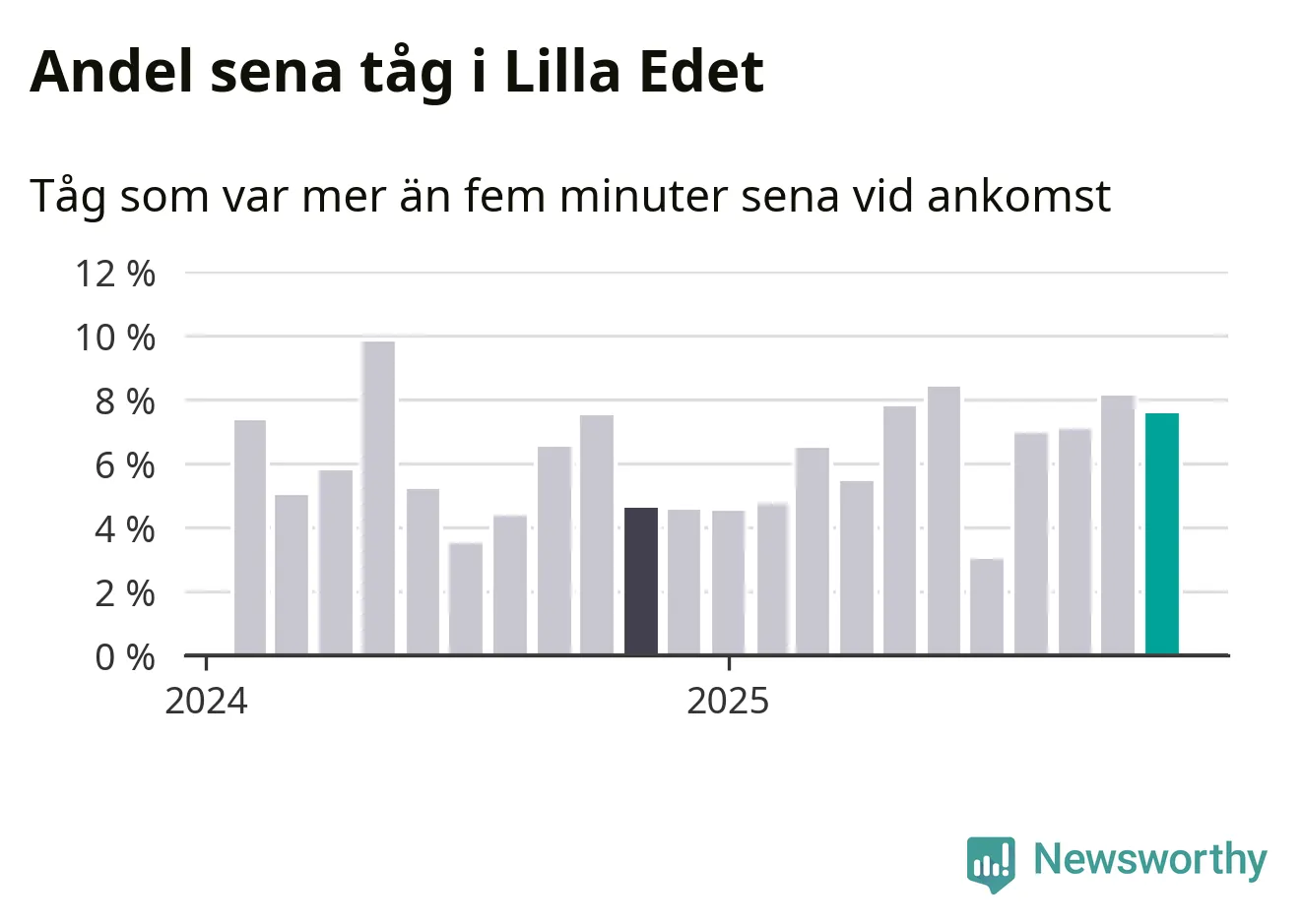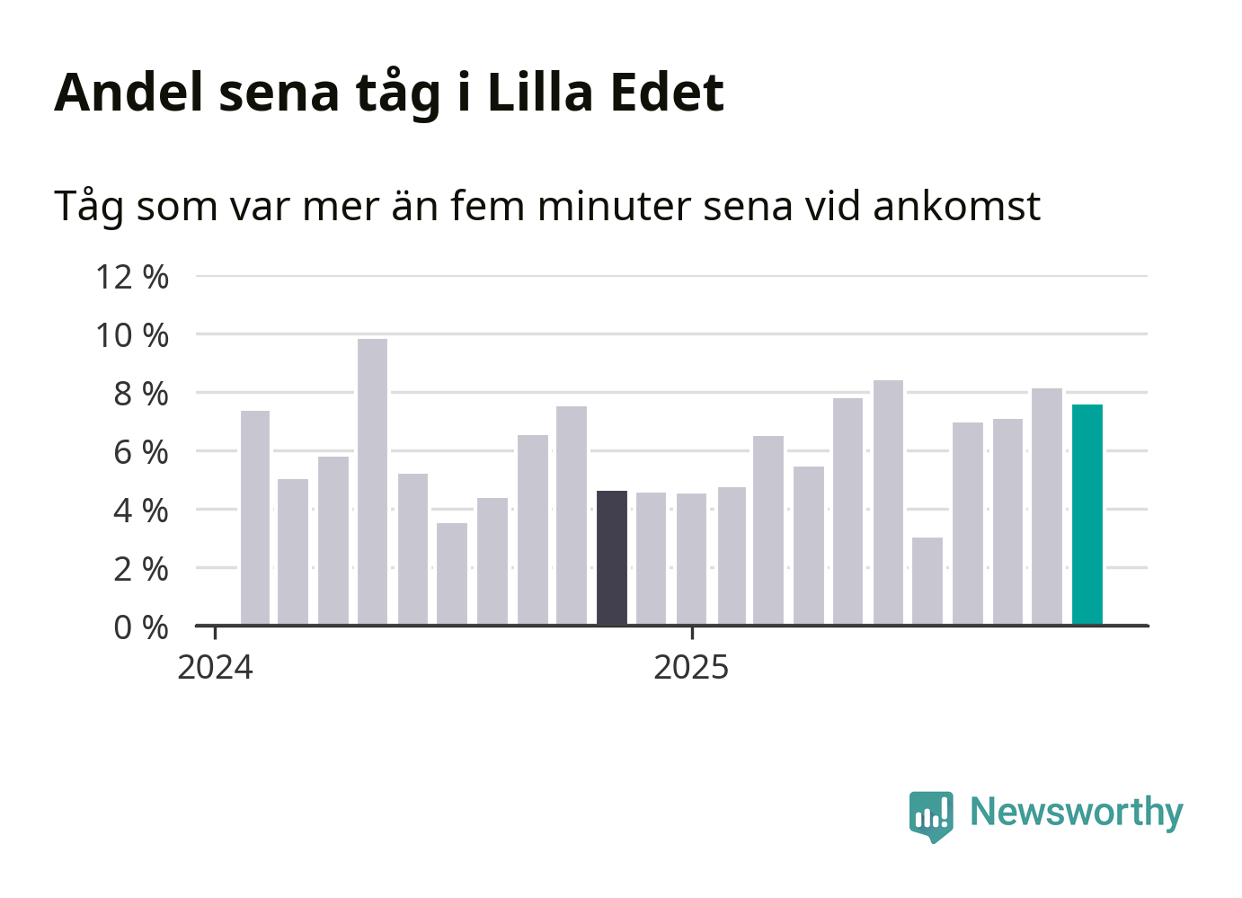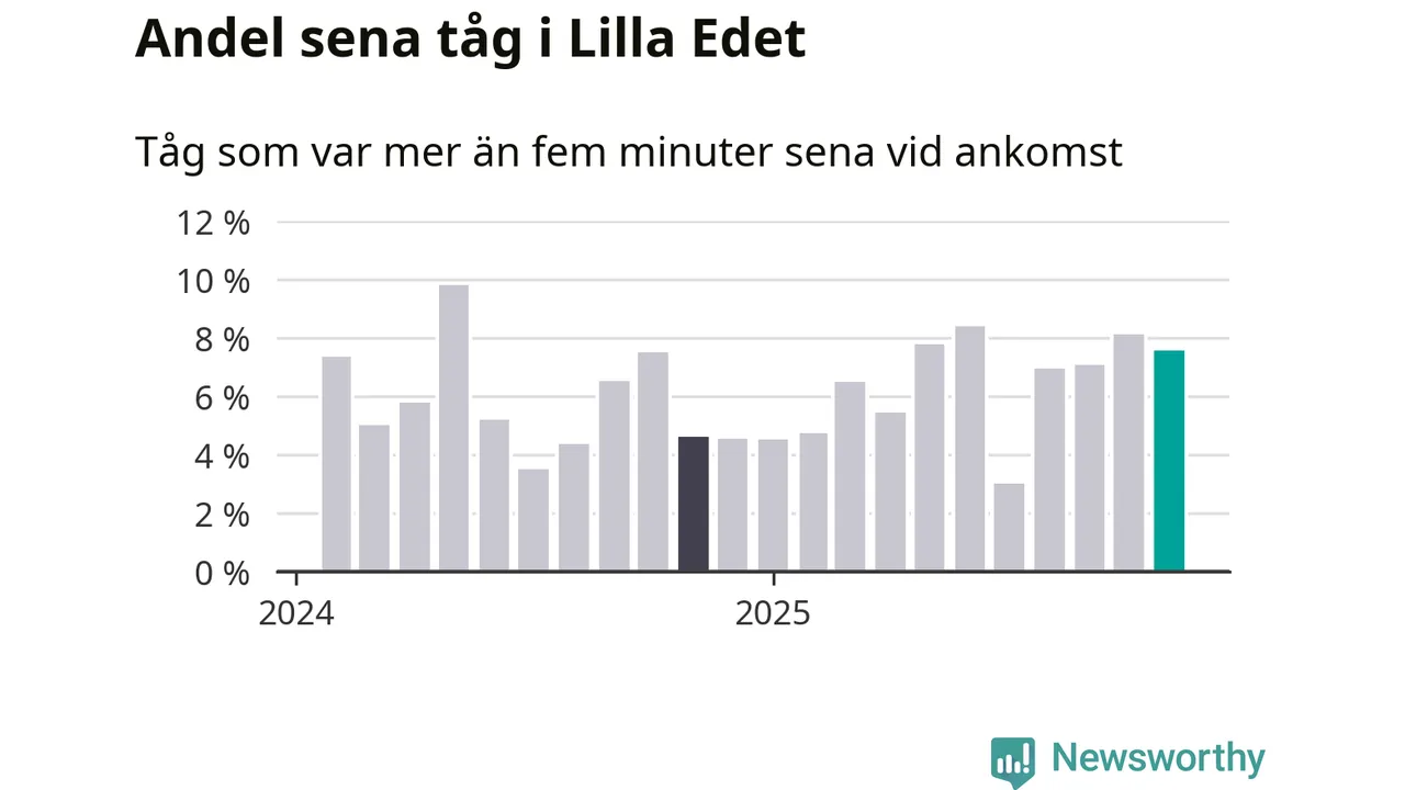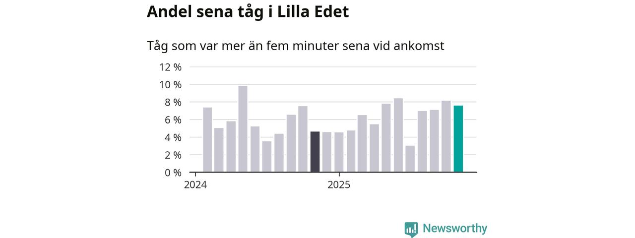 Åtta procent är marginellt mindre än månaden innan, och kan jämföras med fem procent i november 2024. Siffrorna bygger på realtidsinformation om tågavgångar och ankomster från Trafikverket, som Newsworthy löpande samlar in.