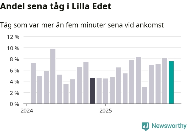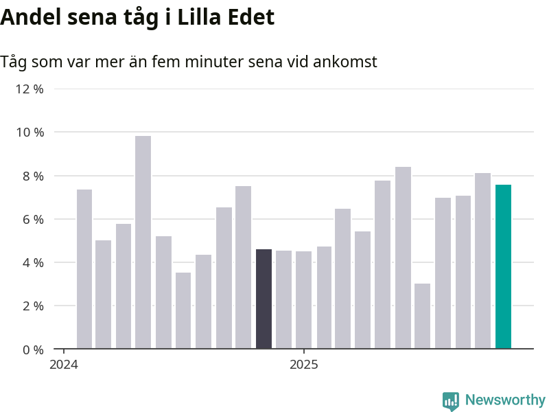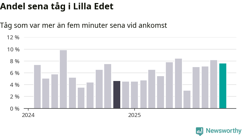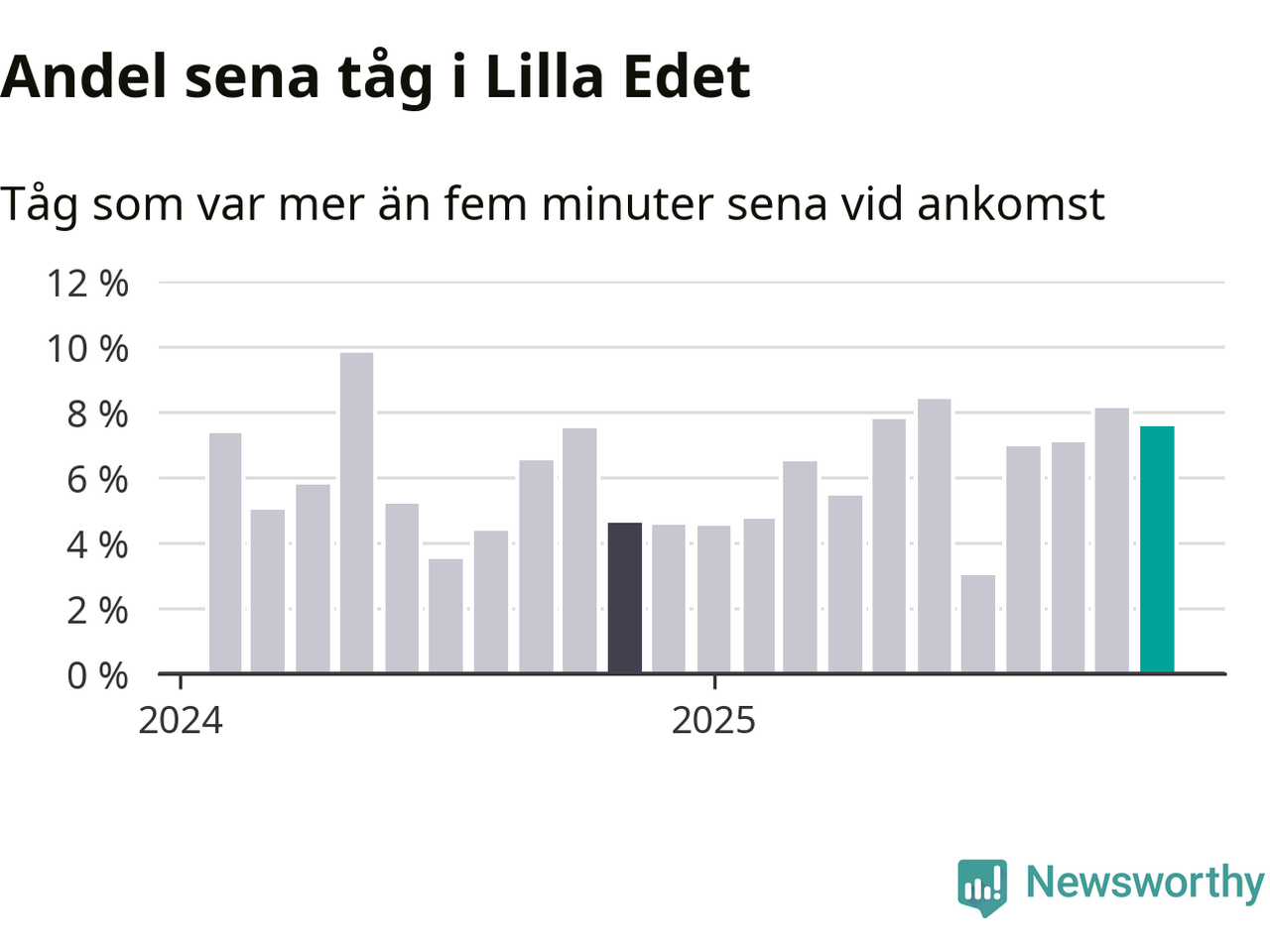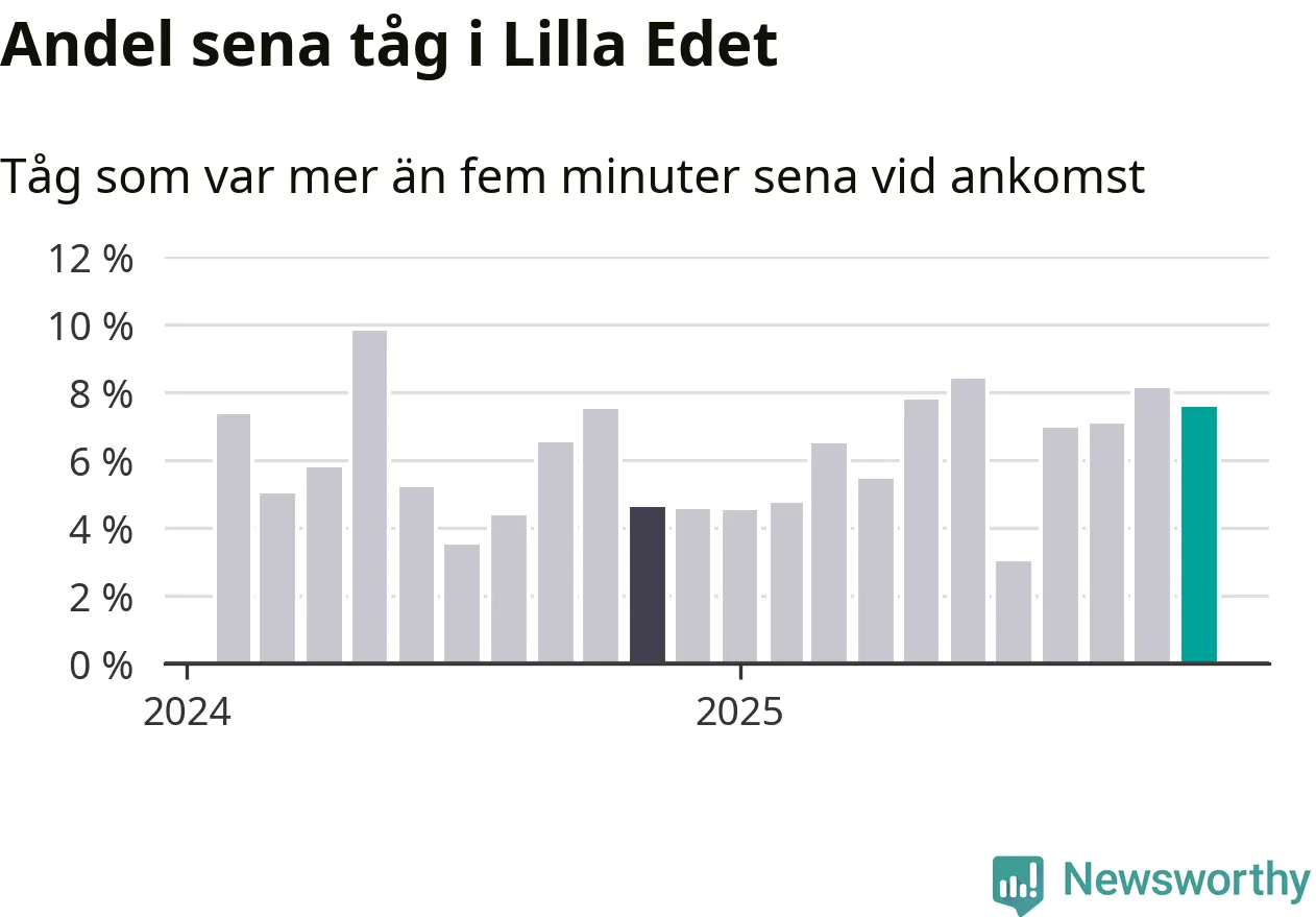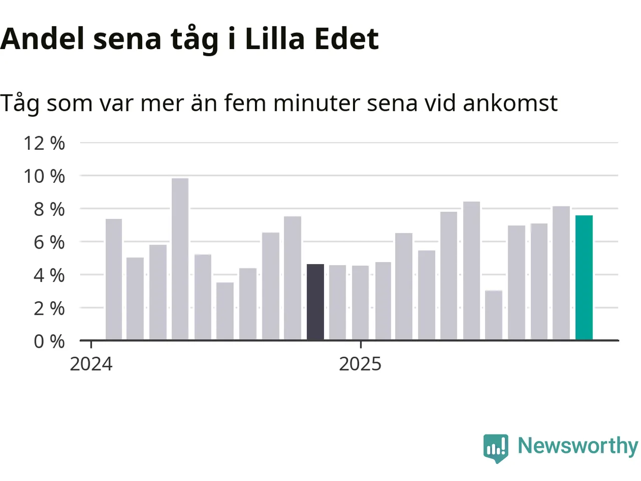 Åtta procent är marginellt mindre än månaden innan, och kan jämföras med fem procent i november 2024. Siffrorna bygger på realtidsinformation om tågavgångar och ankomster från Trafikverket, som Newsworthy löpande samlar in.