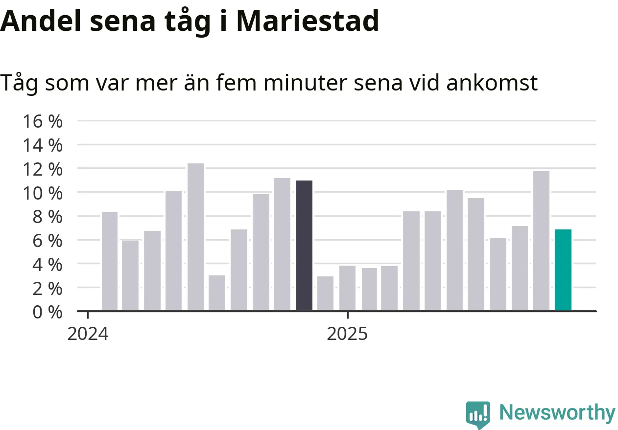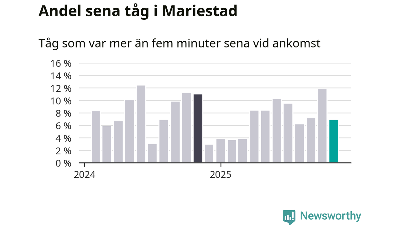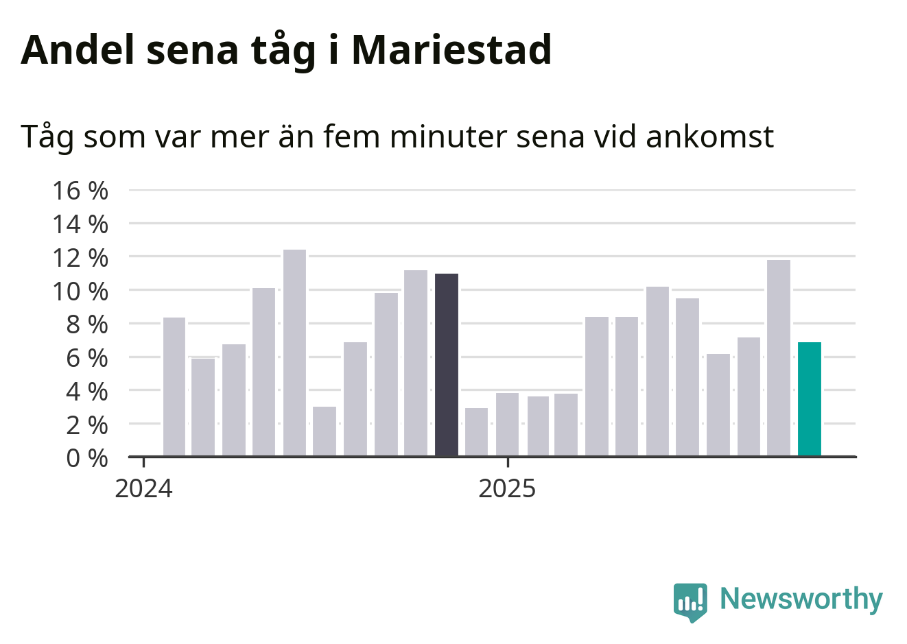 Sju procent kan jämföras med tolv procent månaden innan, och elva procent i november 2024. Siffrorna bygger på realtidsinformation om tågavgångar och ankomster från Trafikverket, som Newsworthy löpande samlar in.