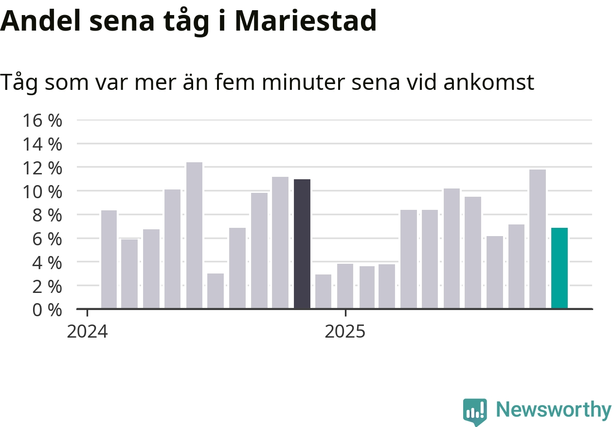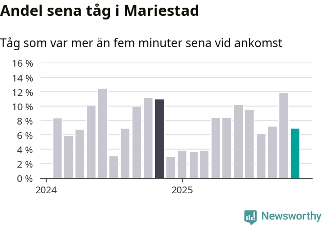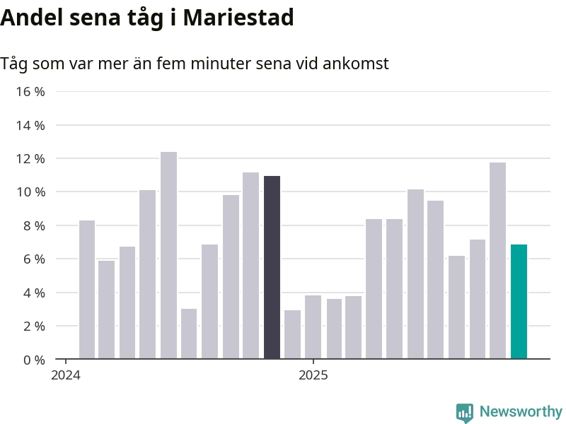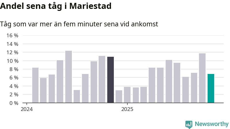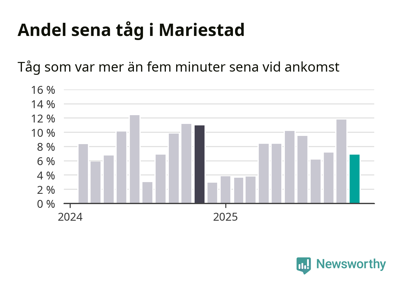 Sju procent kan jämföras med tolv procent månaden innan, och elva procent i november 2024. Siffrorna bygger på realtidsinformation om tågavgångar och ankomster från Trafikverket, som Newsworthy löpande samlar in.