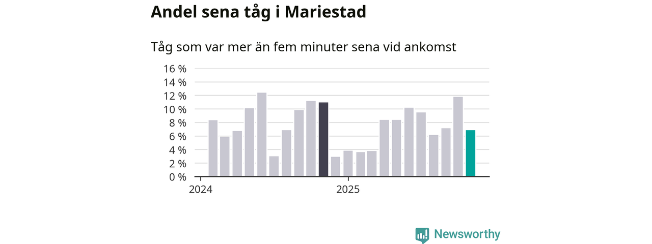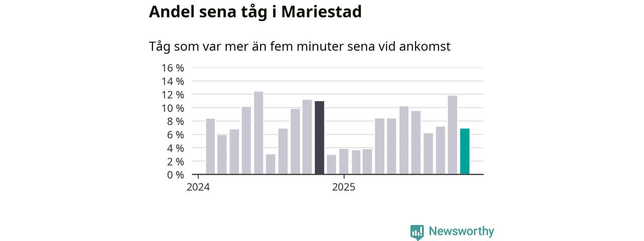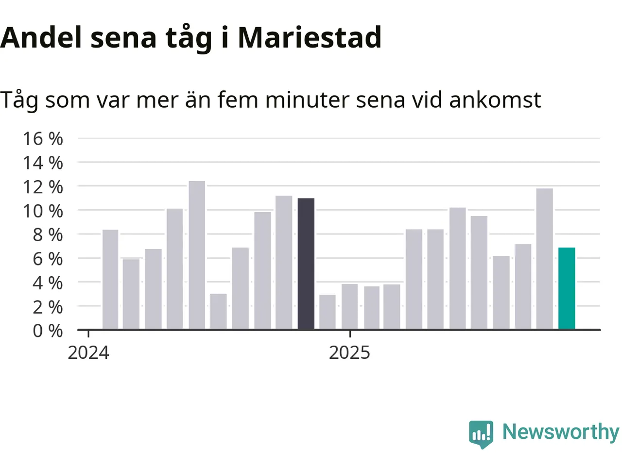 Av knappt 400 tåg som passerade Mariestad i november var 25 mer än fem minuter sena. Det motsvarar 7 procent.