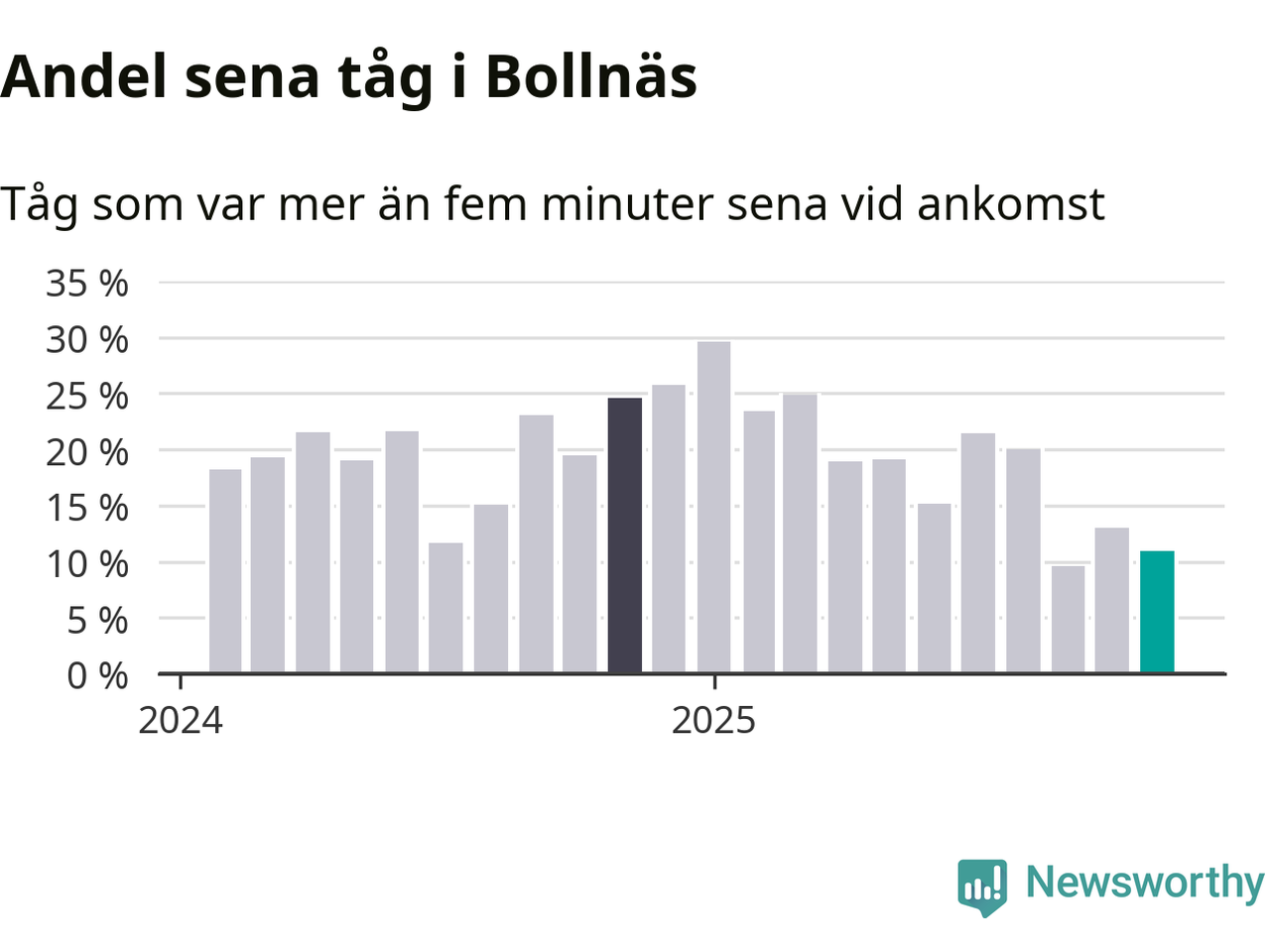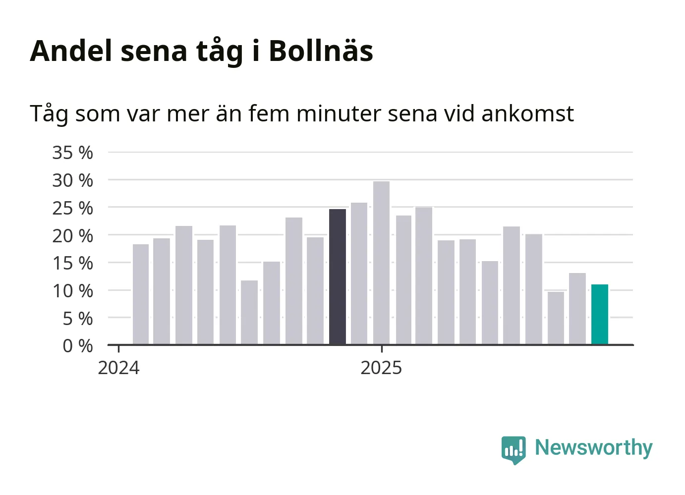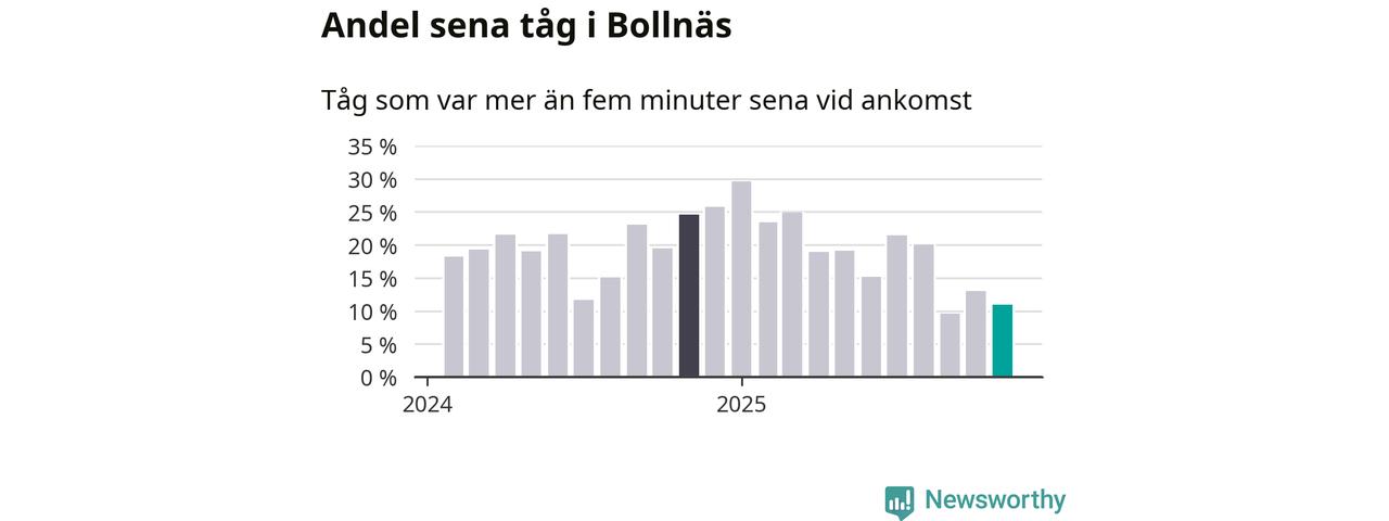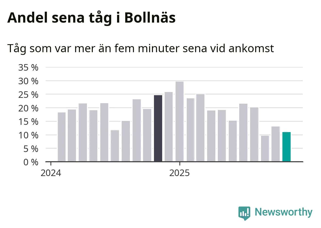 Elva procent kan jämföras med 13 procent månaden innan, och 25 procent i november 2024. Siffrorna bygger på realtidsinformation om tågavgångar och ankomster från Trafikverket, som Newsworthy löpande samlar in.