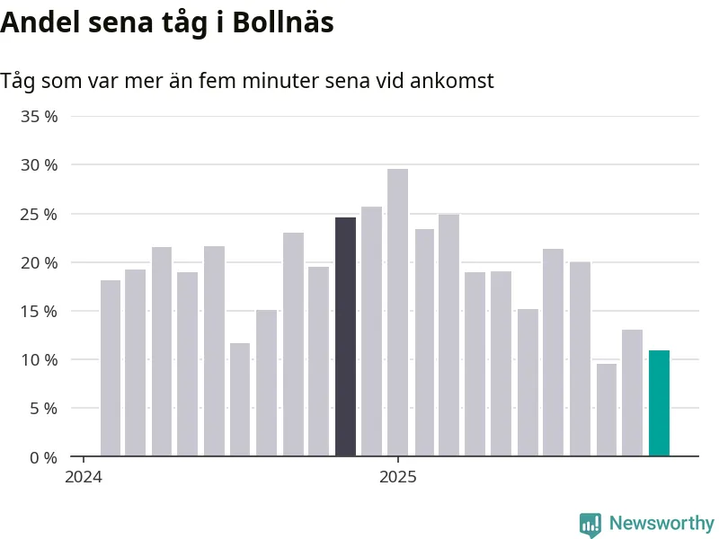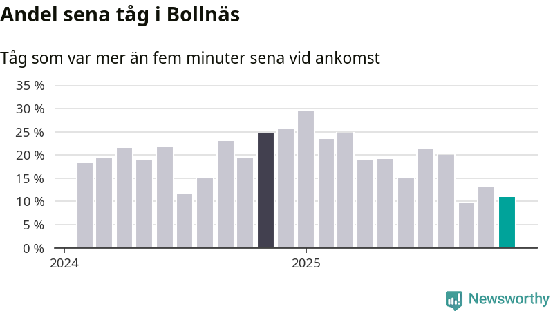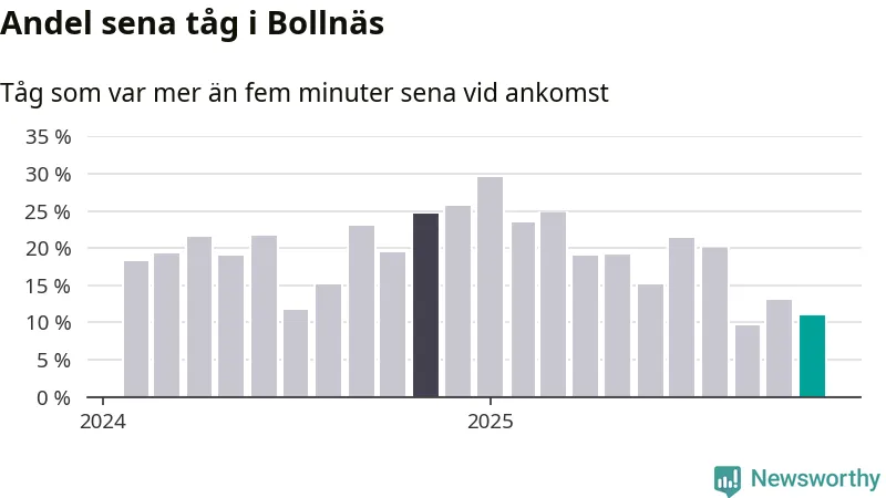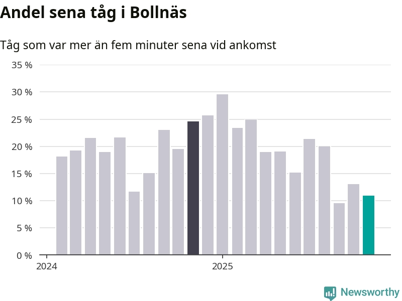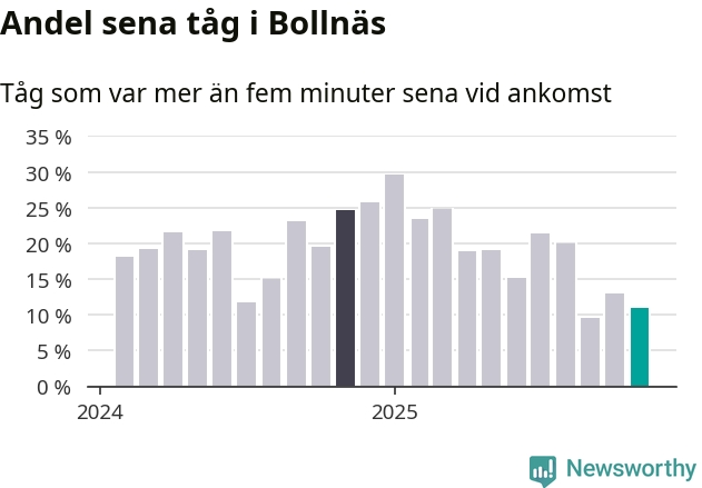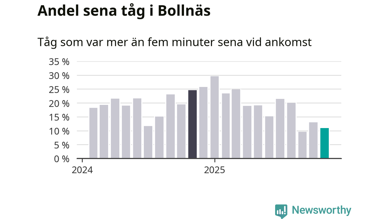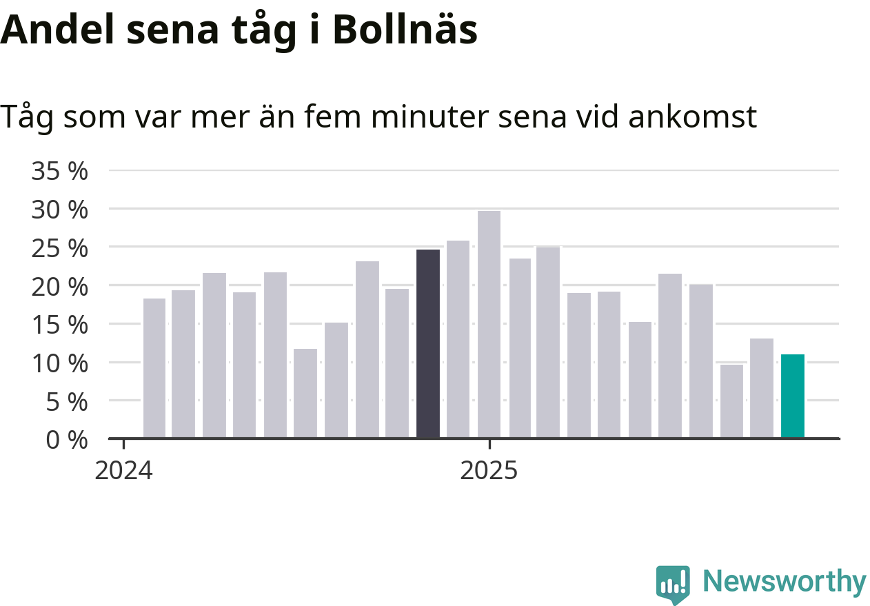 Elva procent kan jämföras med 13 procent månaden innan, och 25 procent i november 2024. Siffrorna bygger på realtidsinformation om tågavgångar och ankomster från Trafikverket, som Newsworthy löpande samlar in.