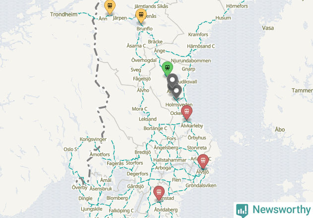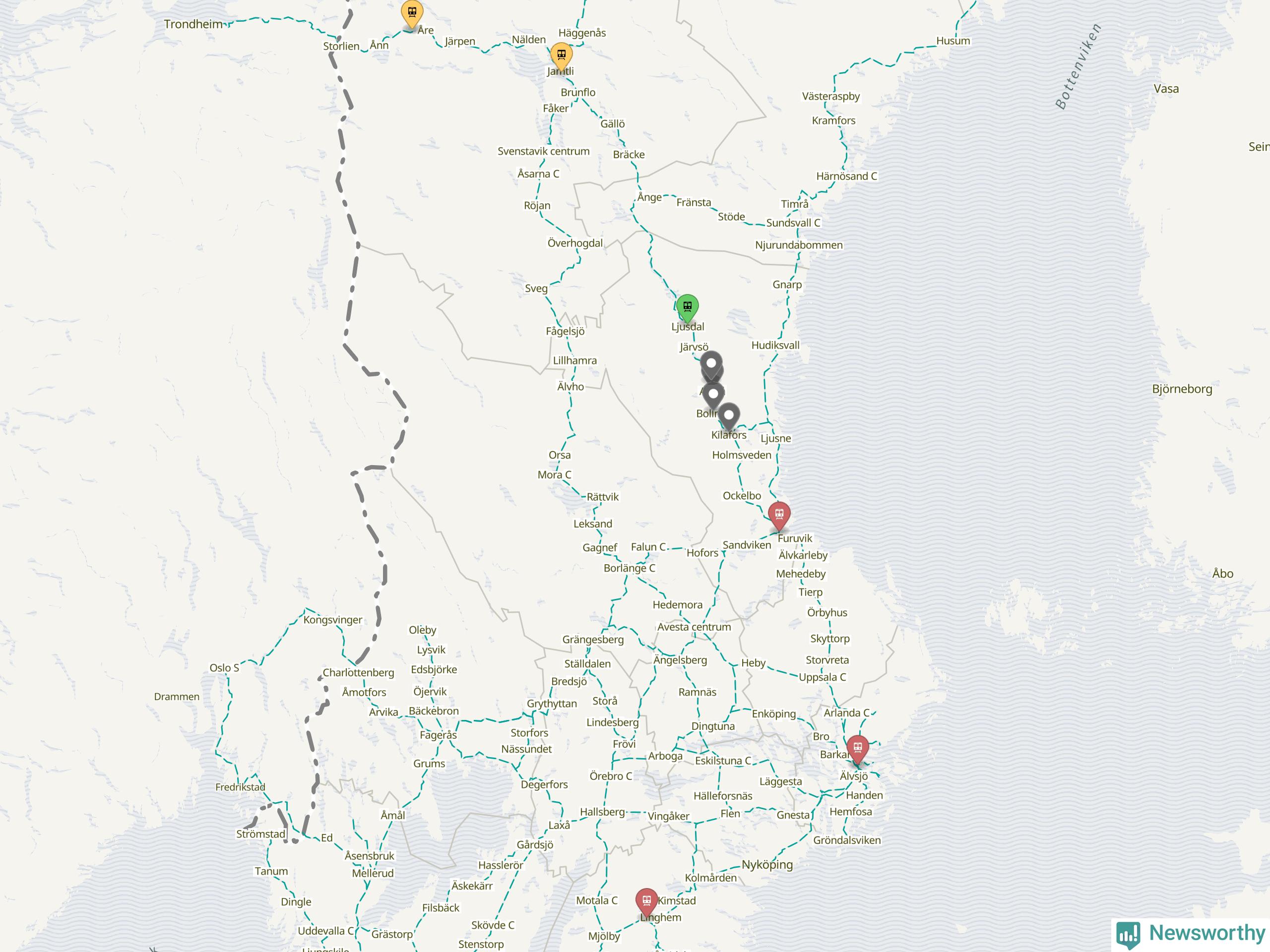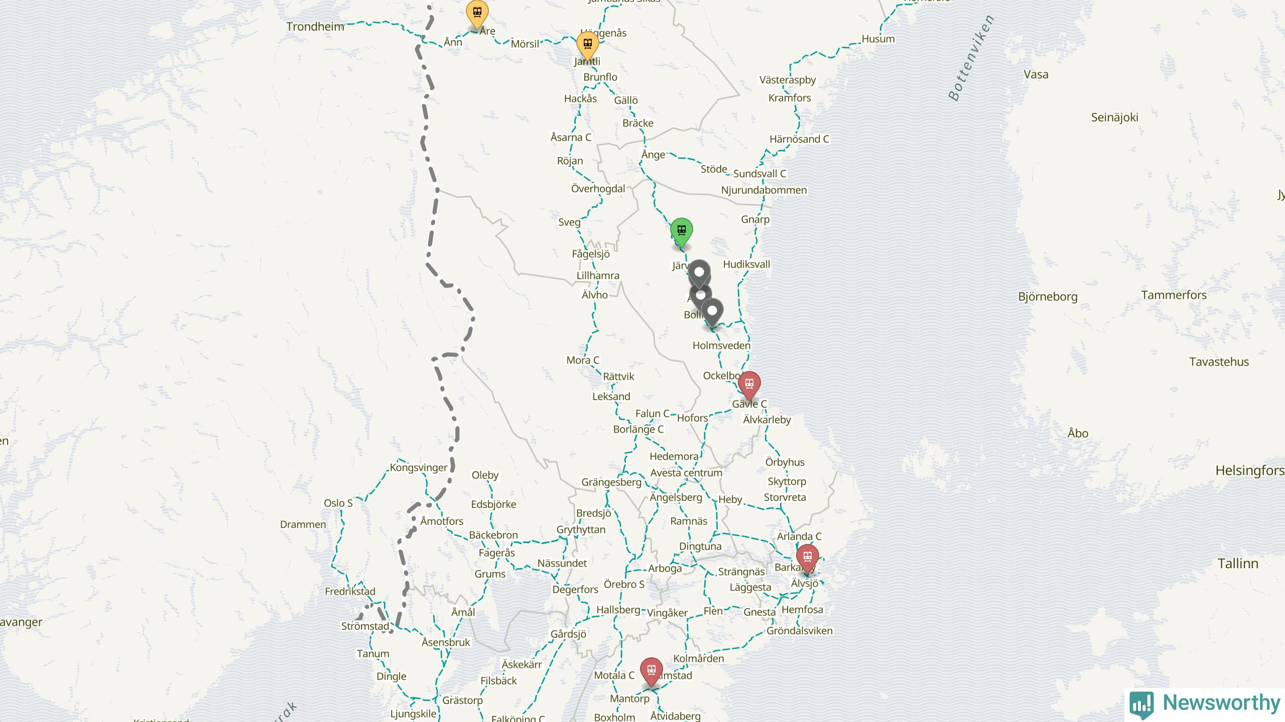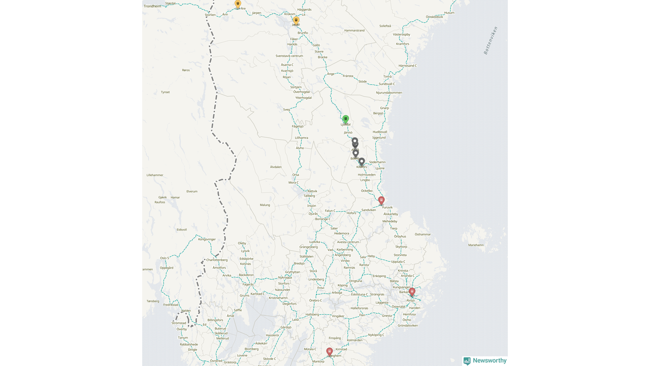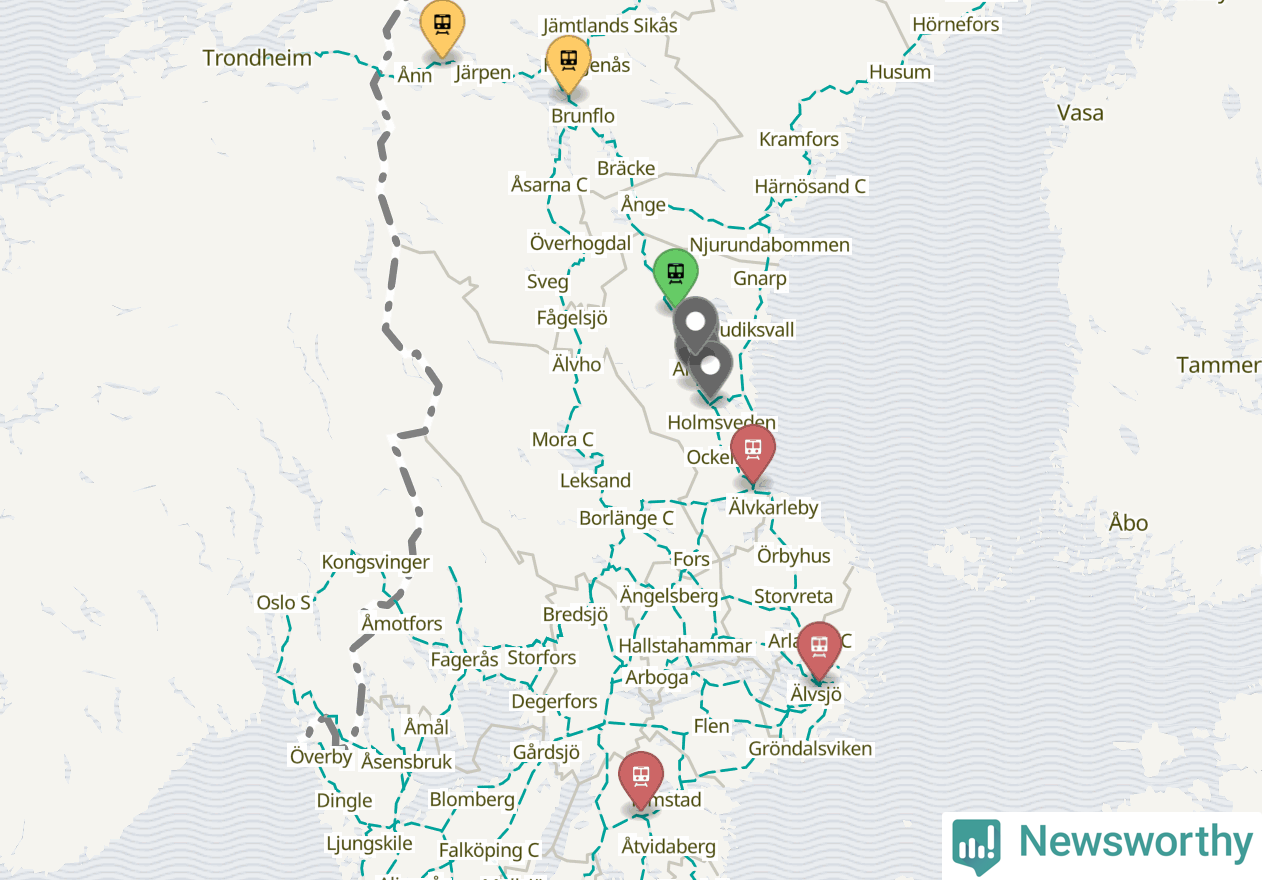Kartdata från Mapbox, Newsworthy, OpenStreetMap och Trafikverket. Uppgifter om sträckor med passagerartrafik från jarnvag.net.