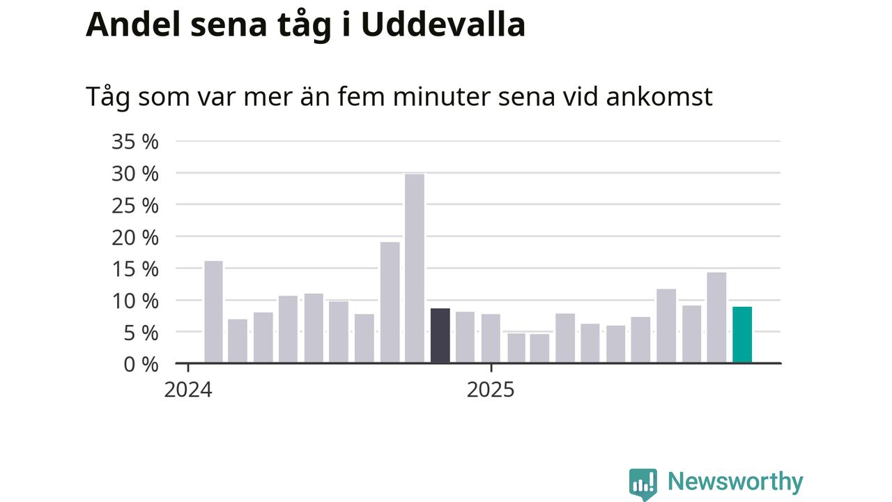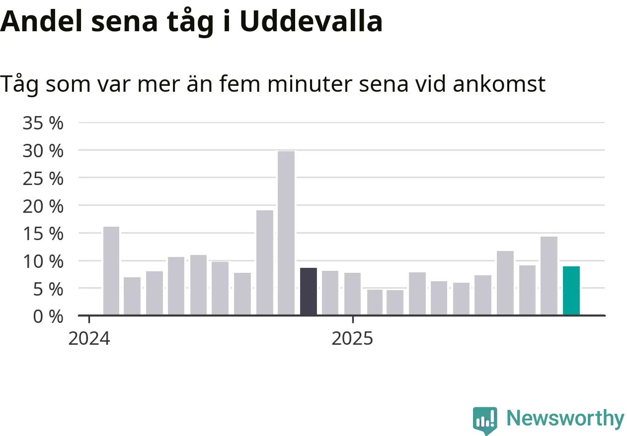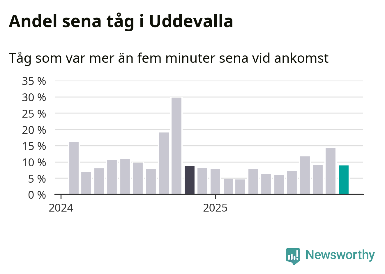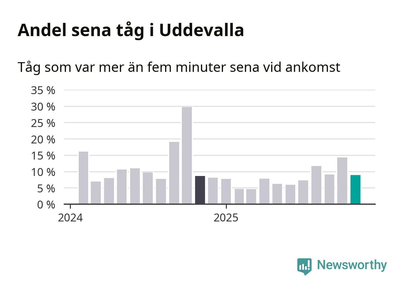 Nio procent kan jämföras med 14 procent månaden innan, och nio procent i november 2024. Siffrorna bygger på realtidsinformation om tågavgångar och ankomster från Trafikverket, som Newsworthy löpande samlar in.