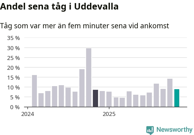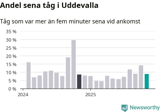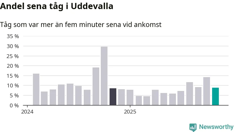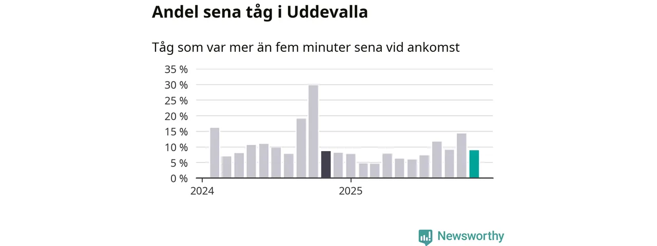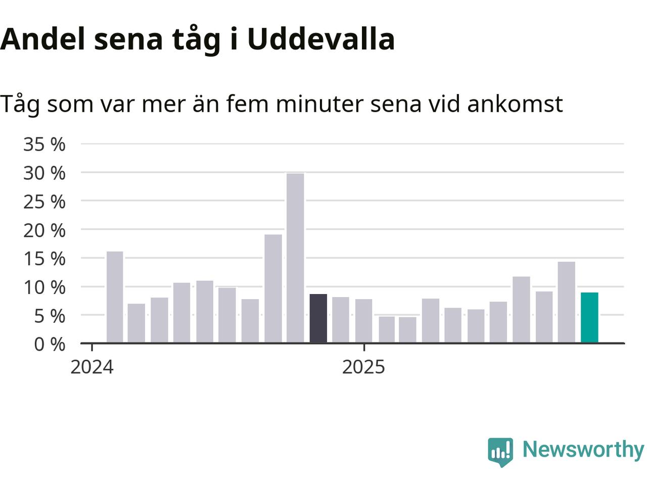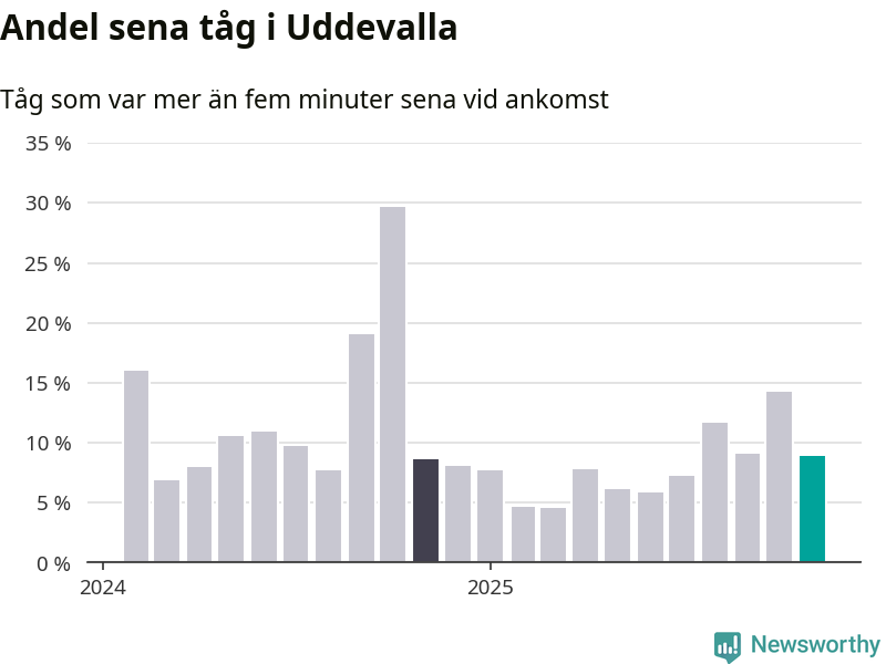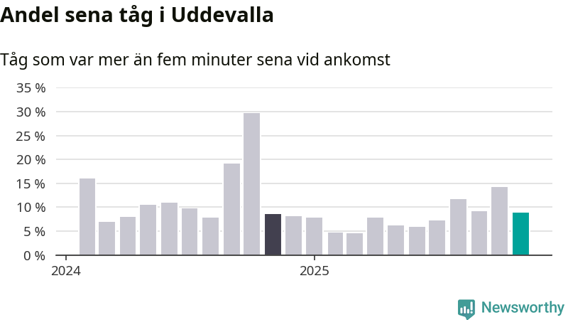 Nio procent kan jämföras med 14 procent månaden innan, och nio procent i november 2024. Siffrorna bygger på realtidsinformation om tågavgångar och ankomster från Trafikverket, som Newsworthy löpande samlar in.