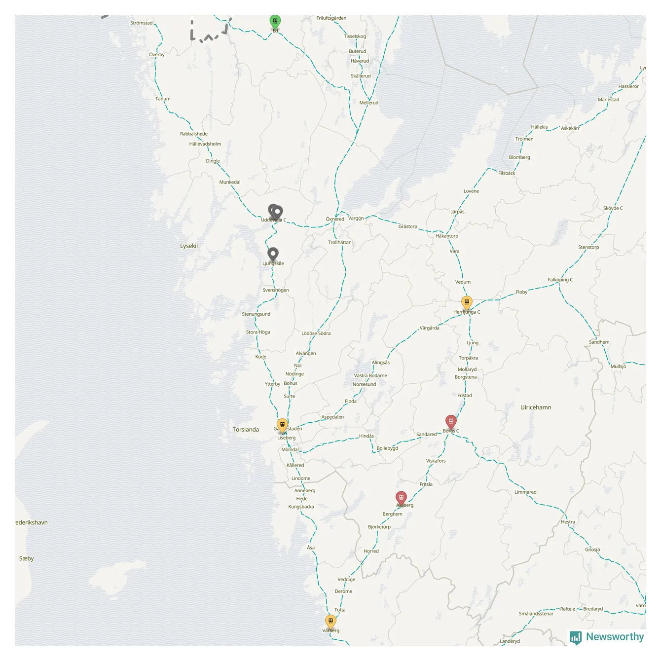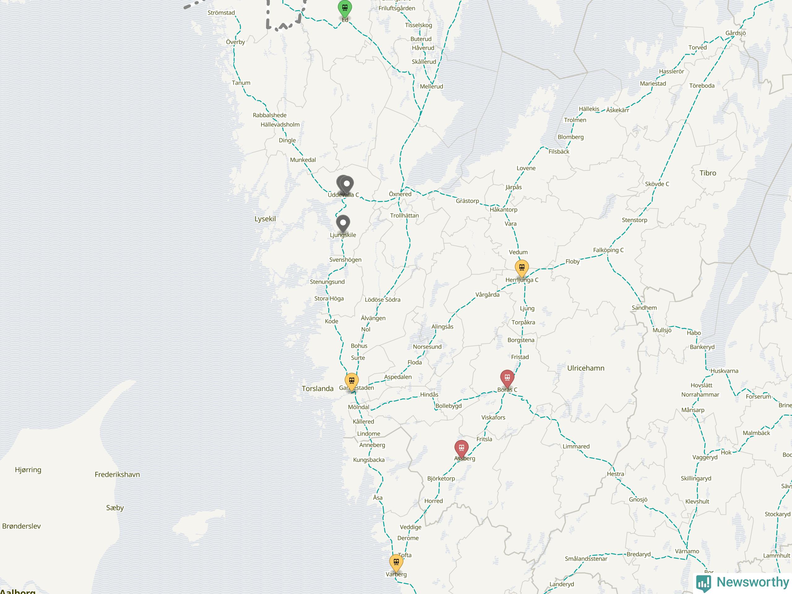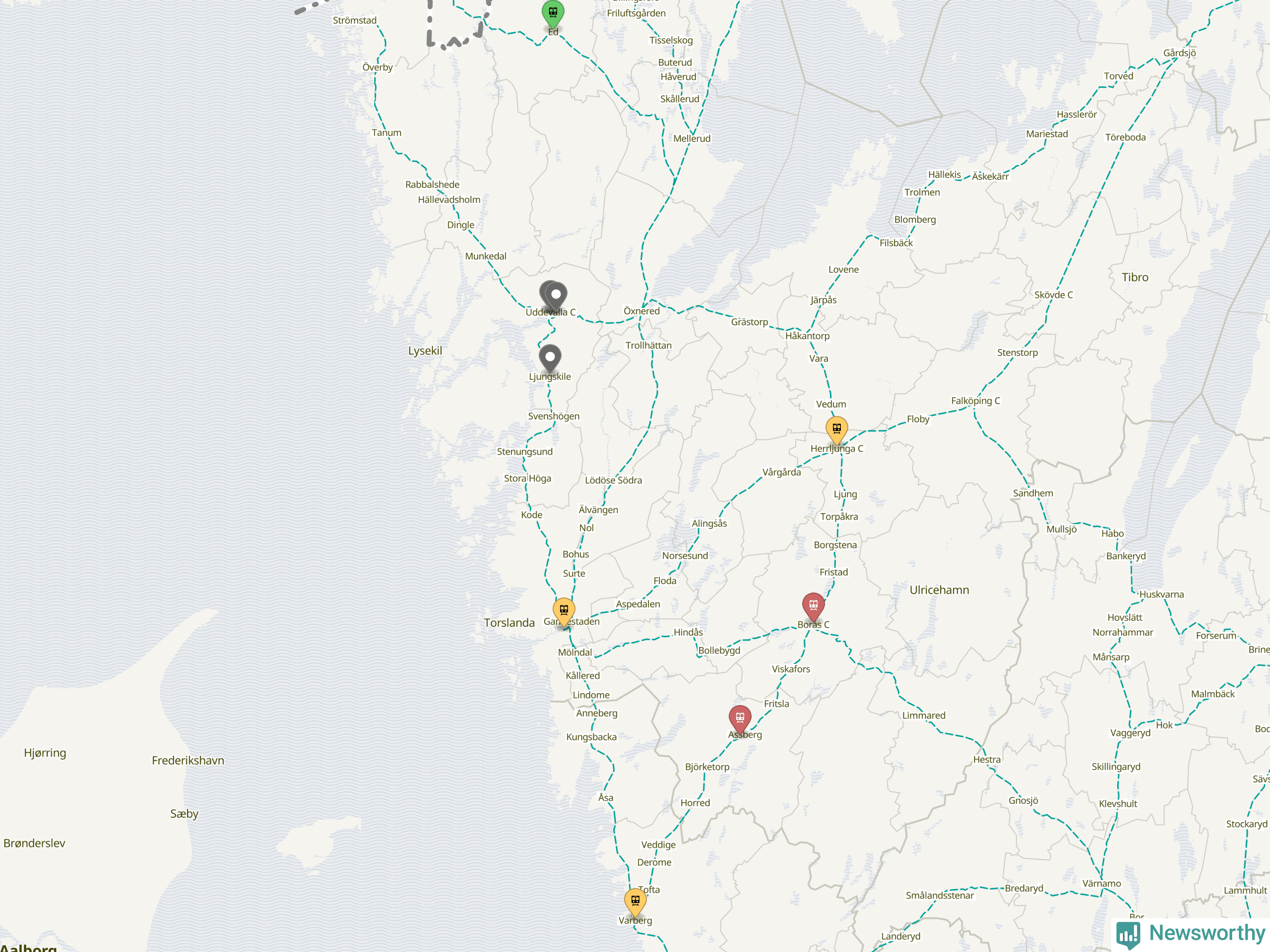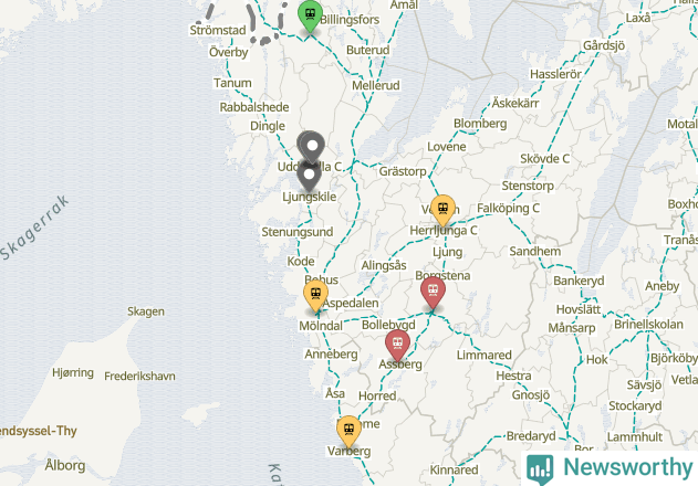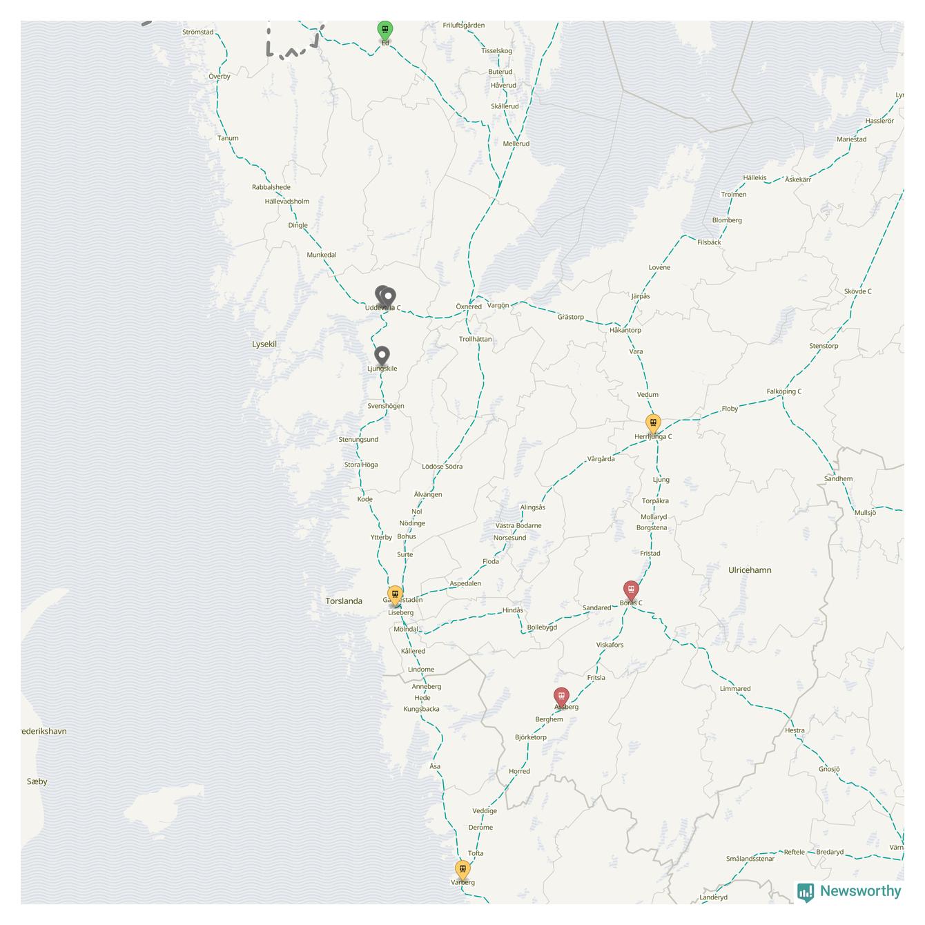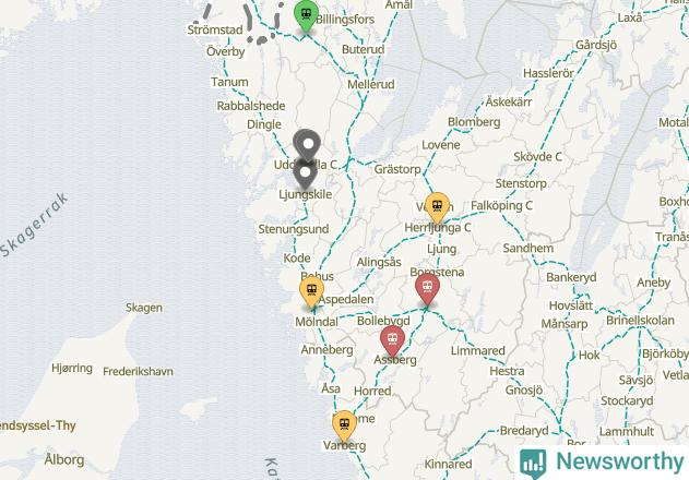 Kartdata från Mapbox, Newsworthy, OpenStreetMap och Trafikverket. Uppgifter om sträckor med passagerartrafik från jarnvag.net.