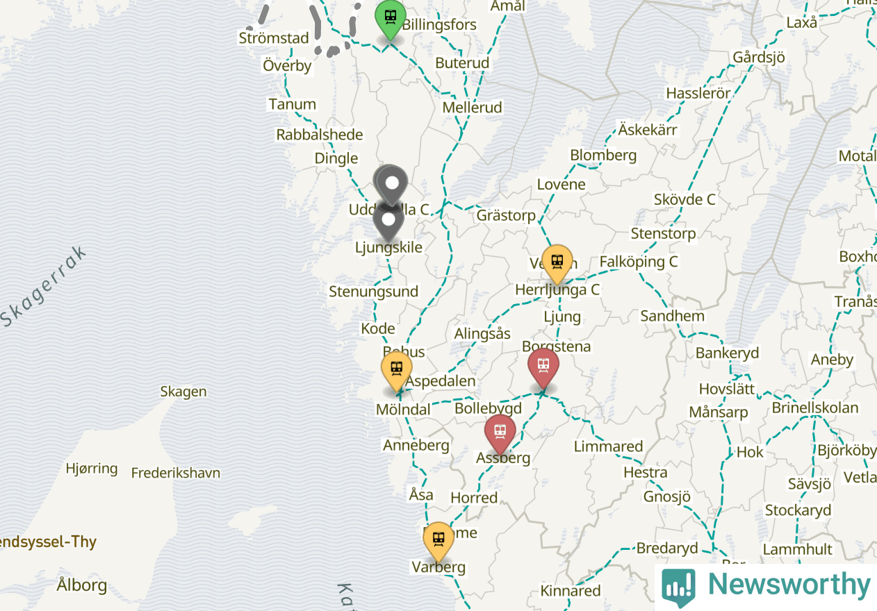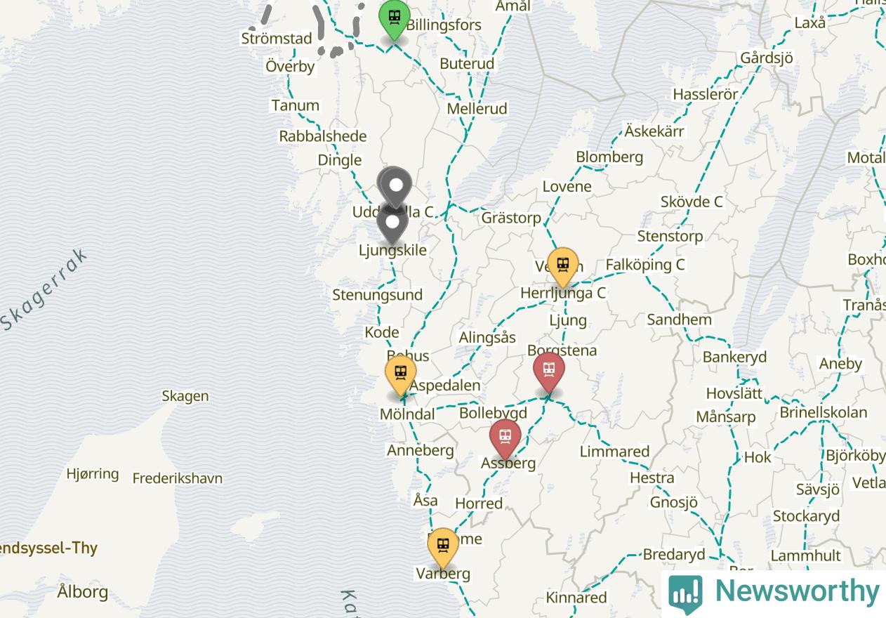 Den svenska järnvägsbranschen har ett gemensamt mål om att 95 procent av tågen ska komma fram i tid. Dit är det just nu långt. Så här sena var tågen vid stationerna i Uddevalla kommun förra månaden.