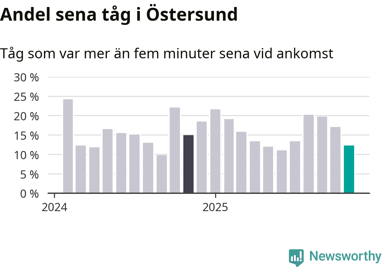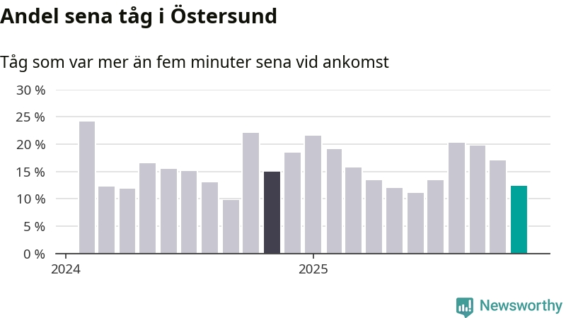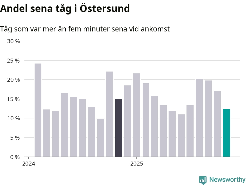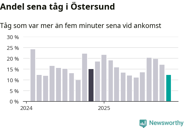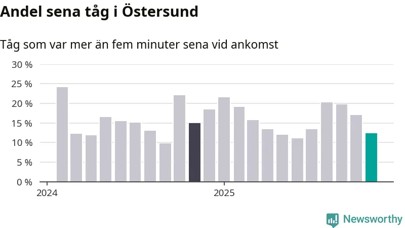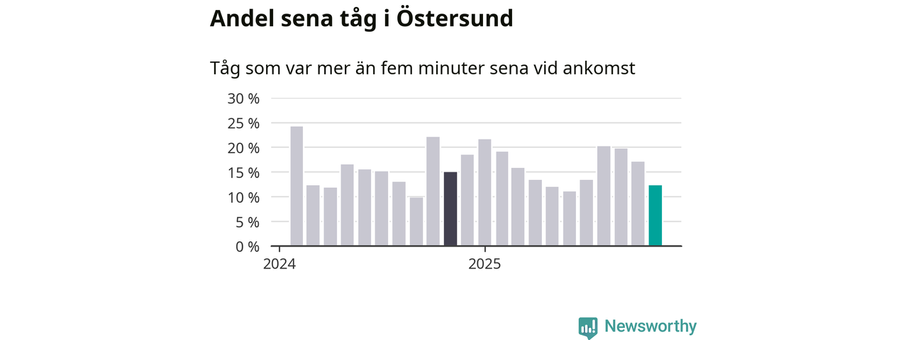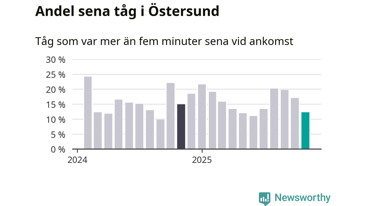 Tolv procent kan jämföras med 17 procent månaden innan, och 15 procent i november 2024. November är den tredje månaden i rad med minskande förseningar i Östersund. Siffrorna bygger på realtidsinformation om tågavgångar och ankomster från Trafikverket, som Newsworthy löpande samlar in.