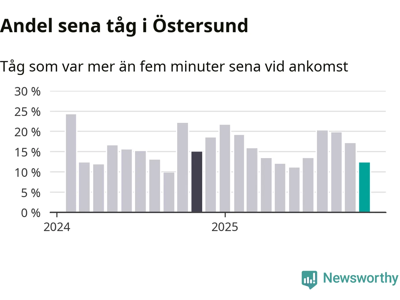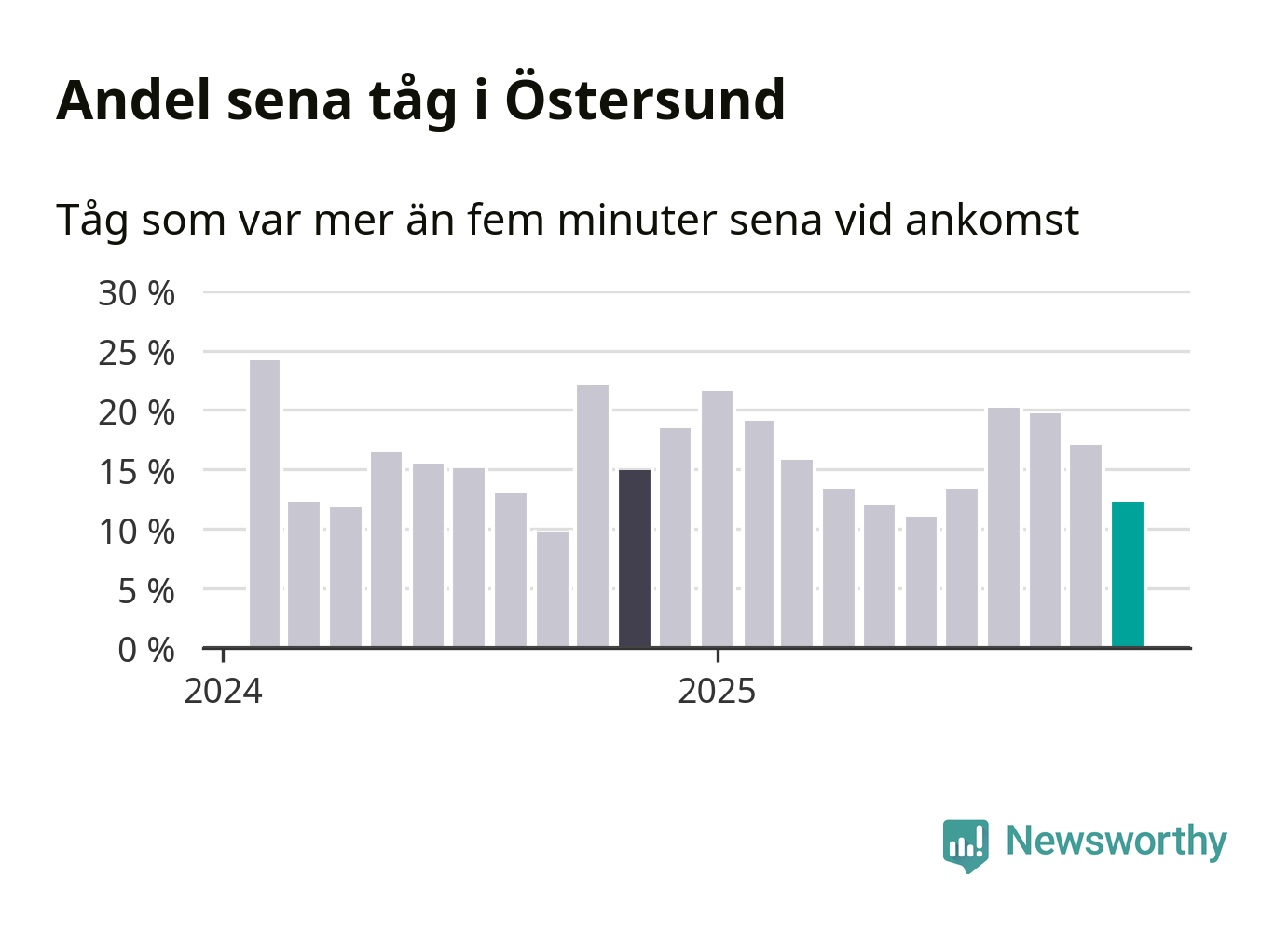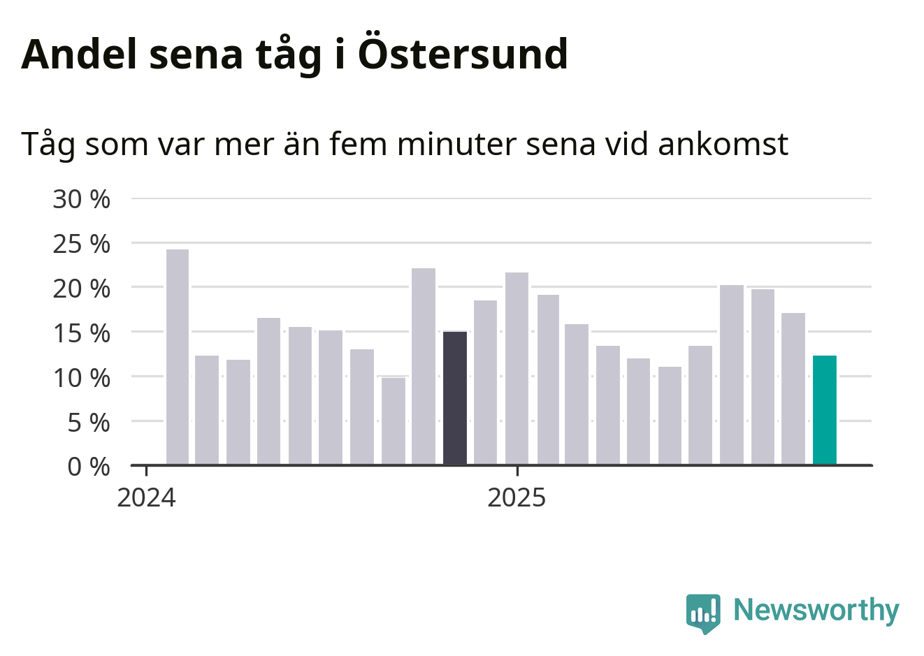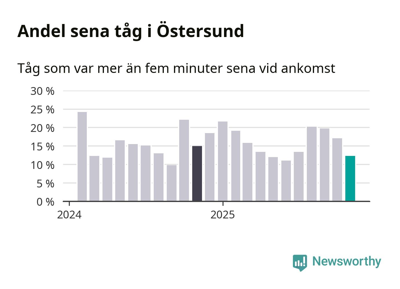 Tolv procent kan jämföras med 17 procent månaden innan, och 15 procent i november 2024. November är den tredje månaden i rad med minskande förseningar i Östersund. Siffrorna bygger på realtidsinformation om tågavgångar och ankomster från Trafikverket, som Newsworthy löpande samlar in.