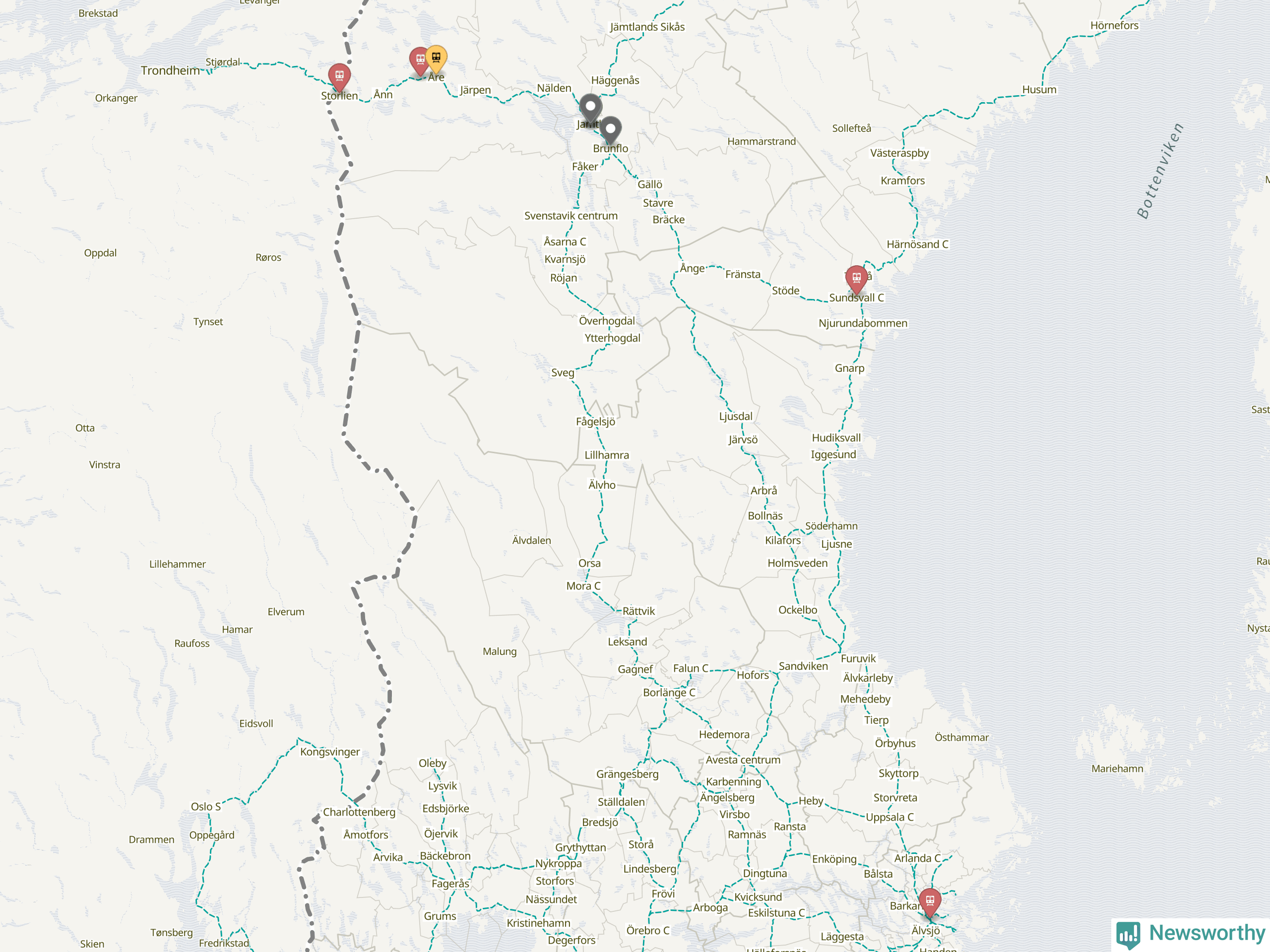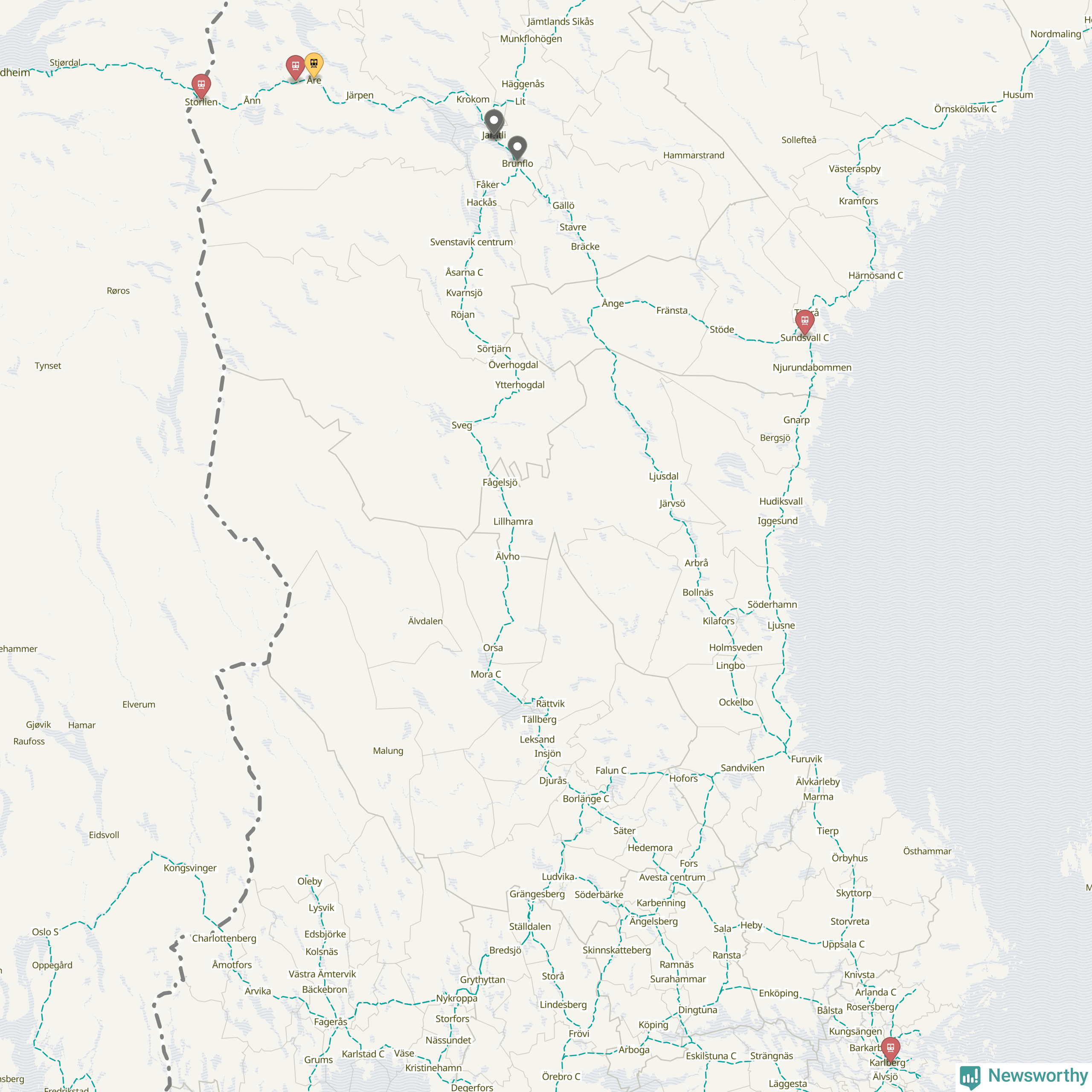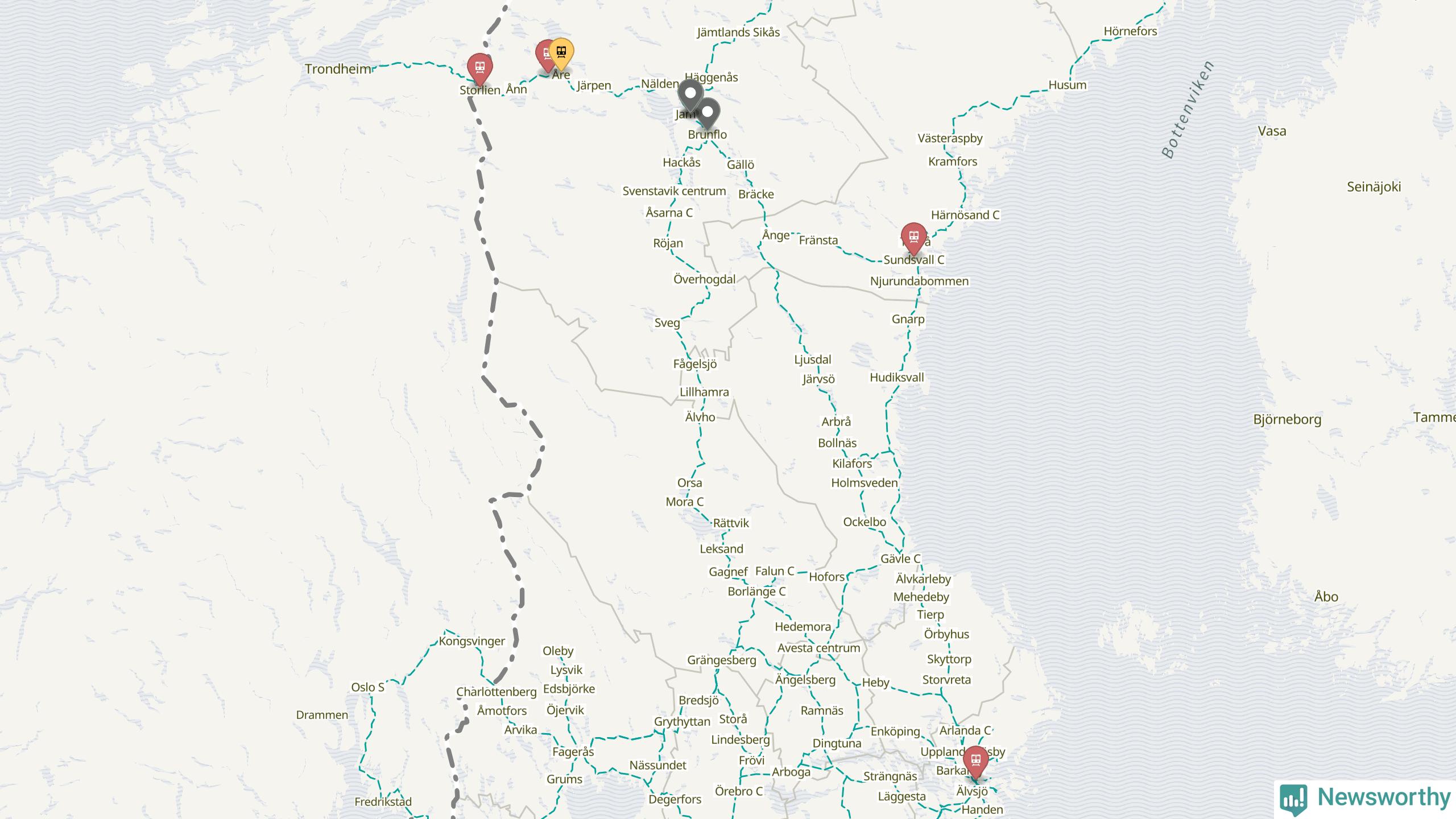 Kartdata från Mapbox, Newsworthy, OpenStreetMap och Trafikverket. Uppgifter om sträckor med passagerartrafik från jarnvag.net.