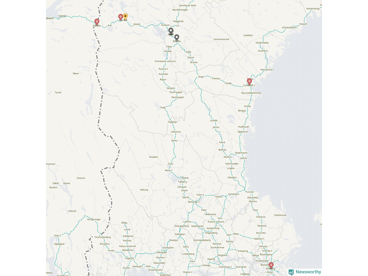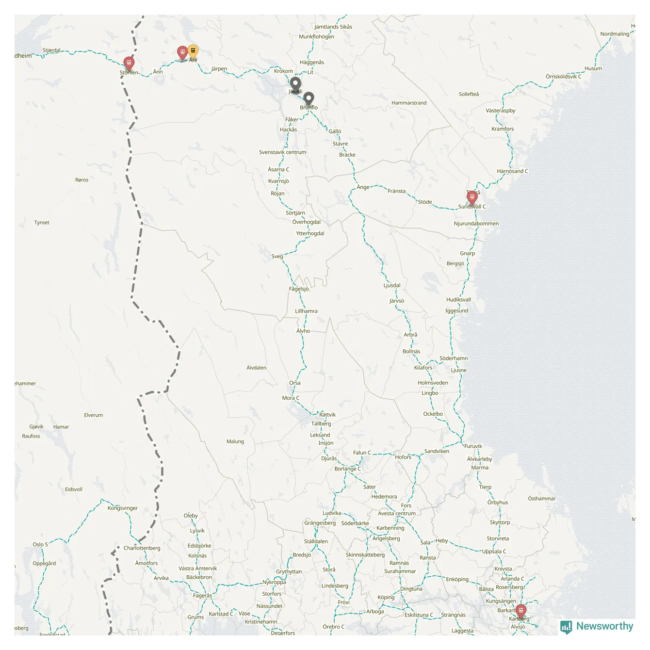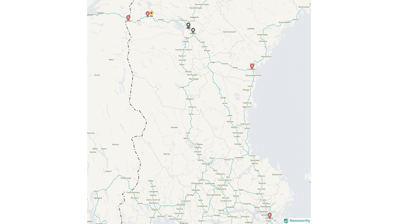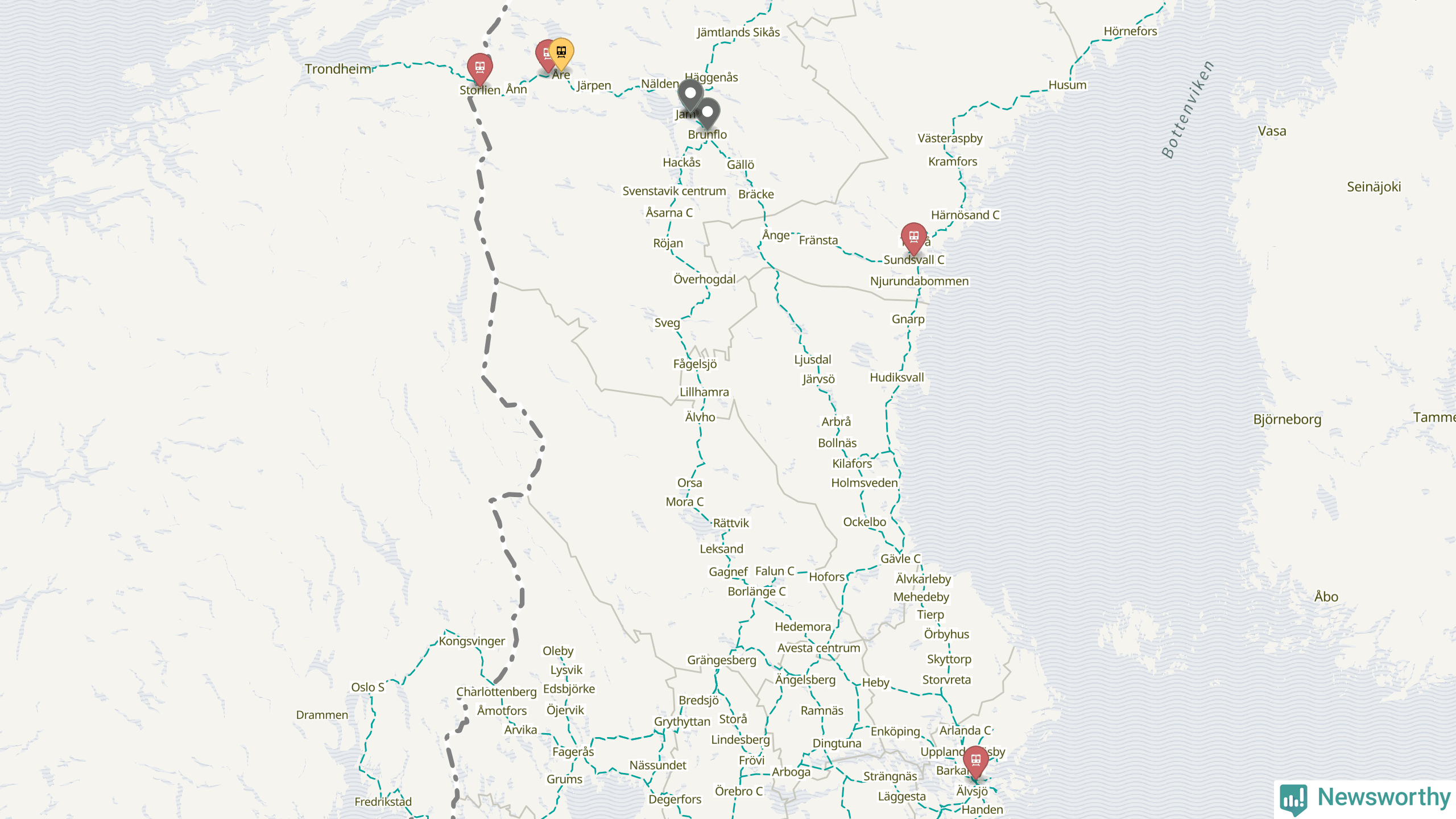 Kartdata från Mapbox, Newsworthy, OpenStreetMap och Trafikverket. Uppgifter om sträckor med passagerartrafik från jarnvag.net.
