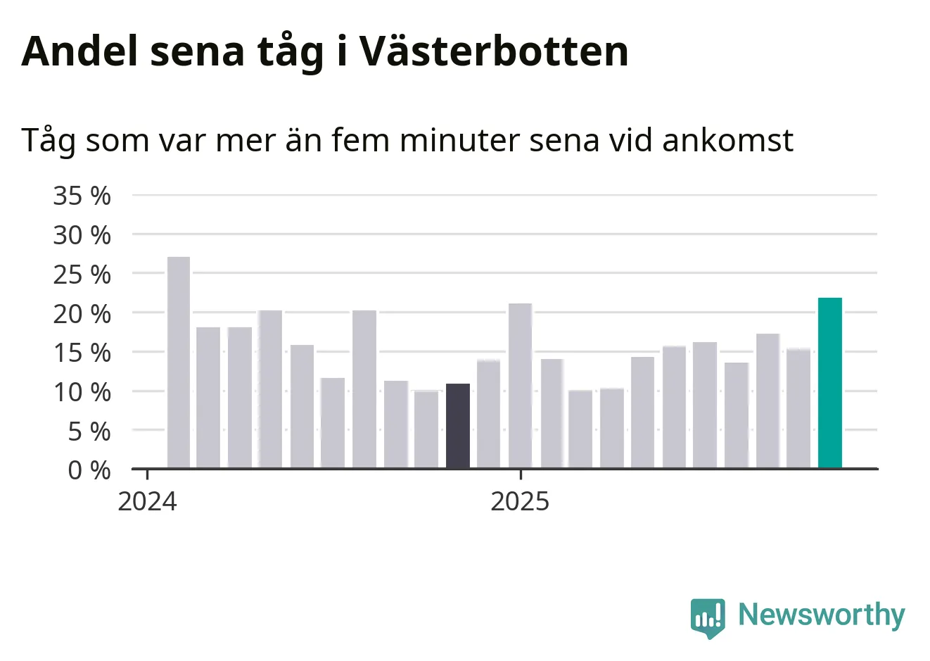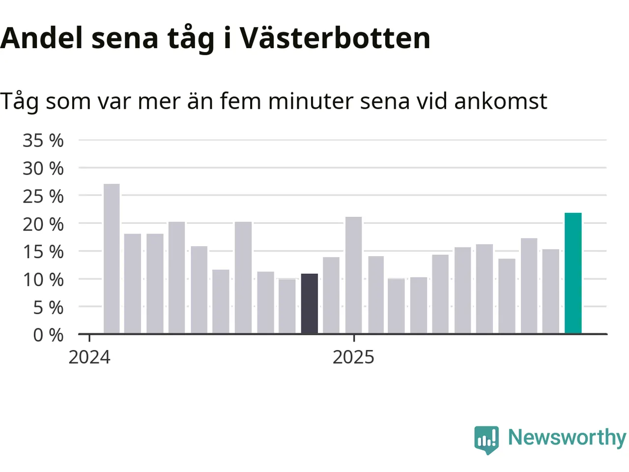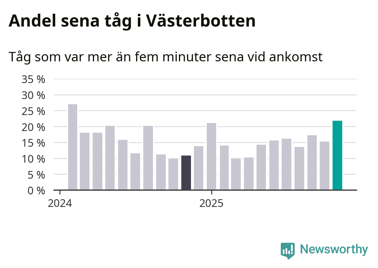 Av drygt 1 600 tåg som passerade någon av stationerna i Västerbottens län i november var 356 mer än fem minuter sena. Det motsvarar 22 procent, en bra bit över den nationella målsättningen som säger att inte mer än fem procent av tågen ska vara sena.