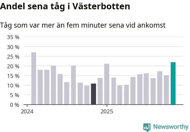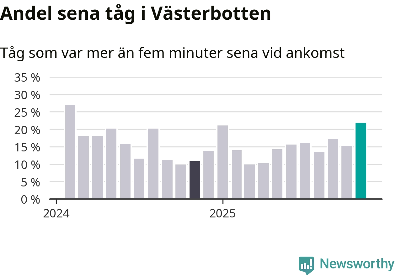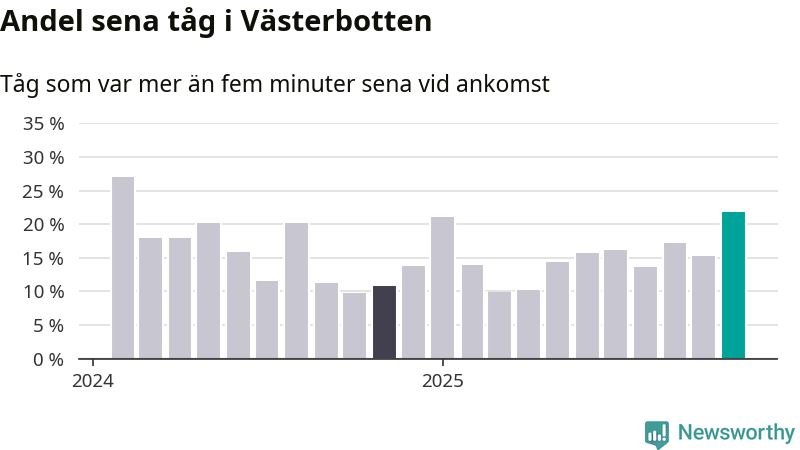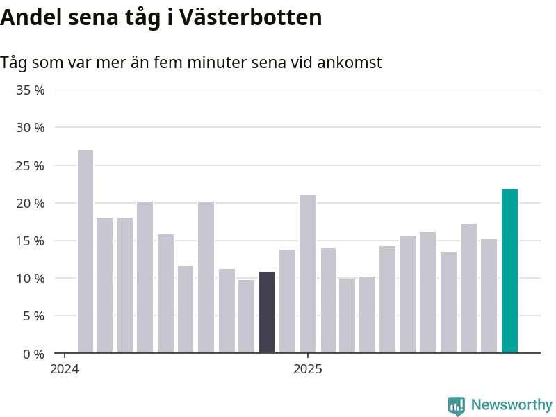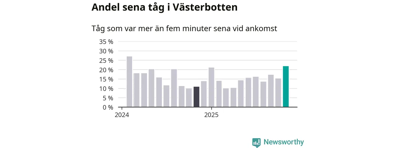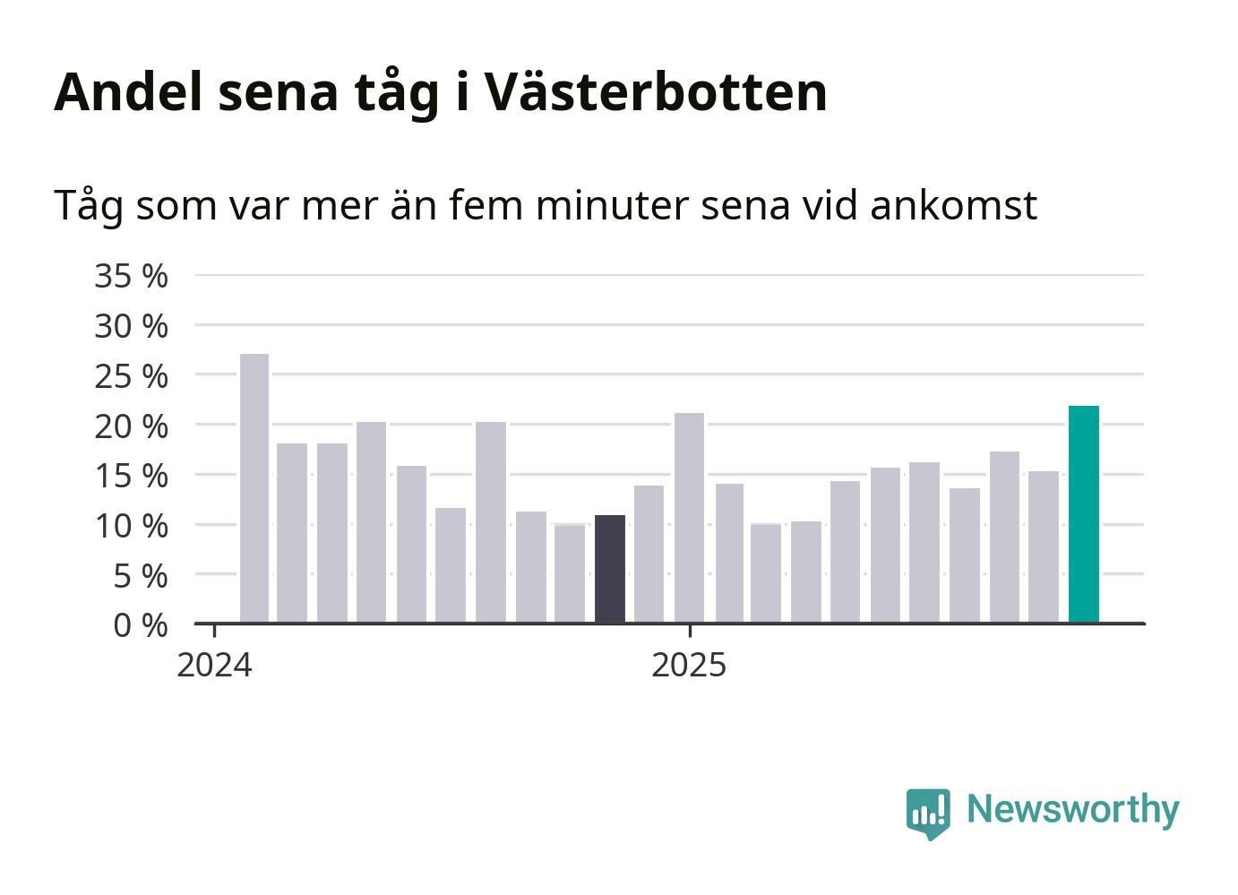 Av drygt 1 600 tåg som passerade någon av stationerna i Västerbottens län i november var 356 mer än fem minuter sena. Det motsvarar 22 procent, en bra bit över den nationella målsättningen som säger att inte mer än fem procent av tågen ska vara sena.