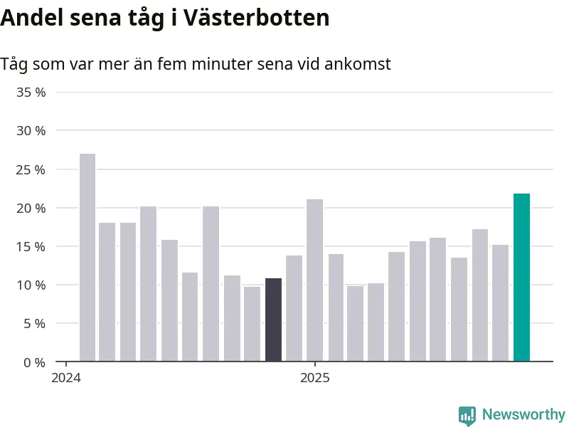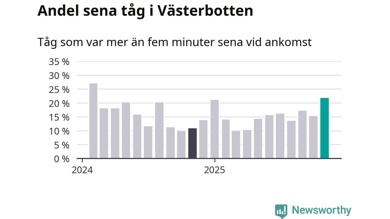Andelen sena tåg vid stationerna i Västerbottens län steg förra månaden, till den högsta noteringen sedan februari i fjol.
