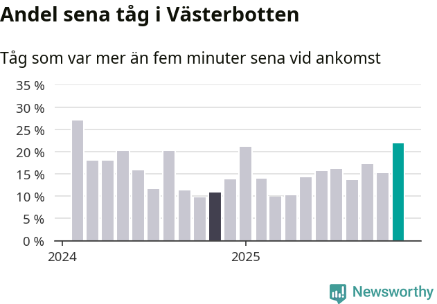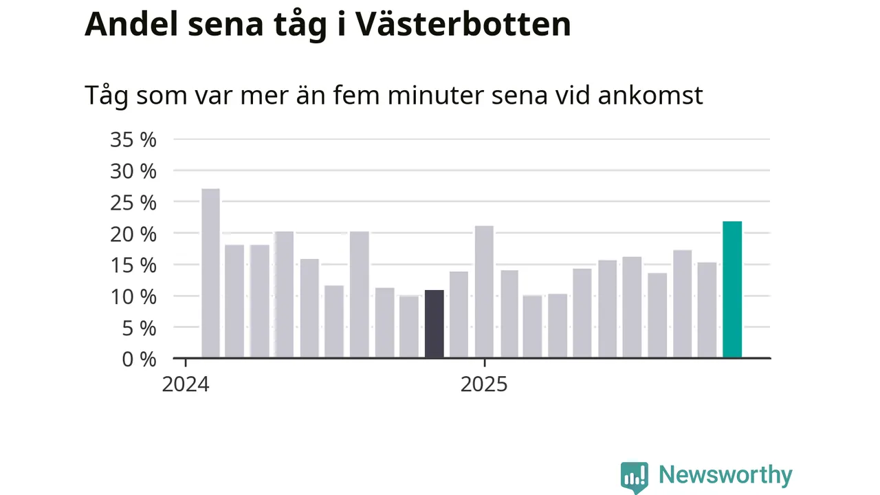 Så hög har andelen förseningar inte varit sedan februari 2024. Siffrorna bygger på realtidsinformation om tågavgångar och ankomster från Trafikverket, som Newsworthy löpande samlar in.