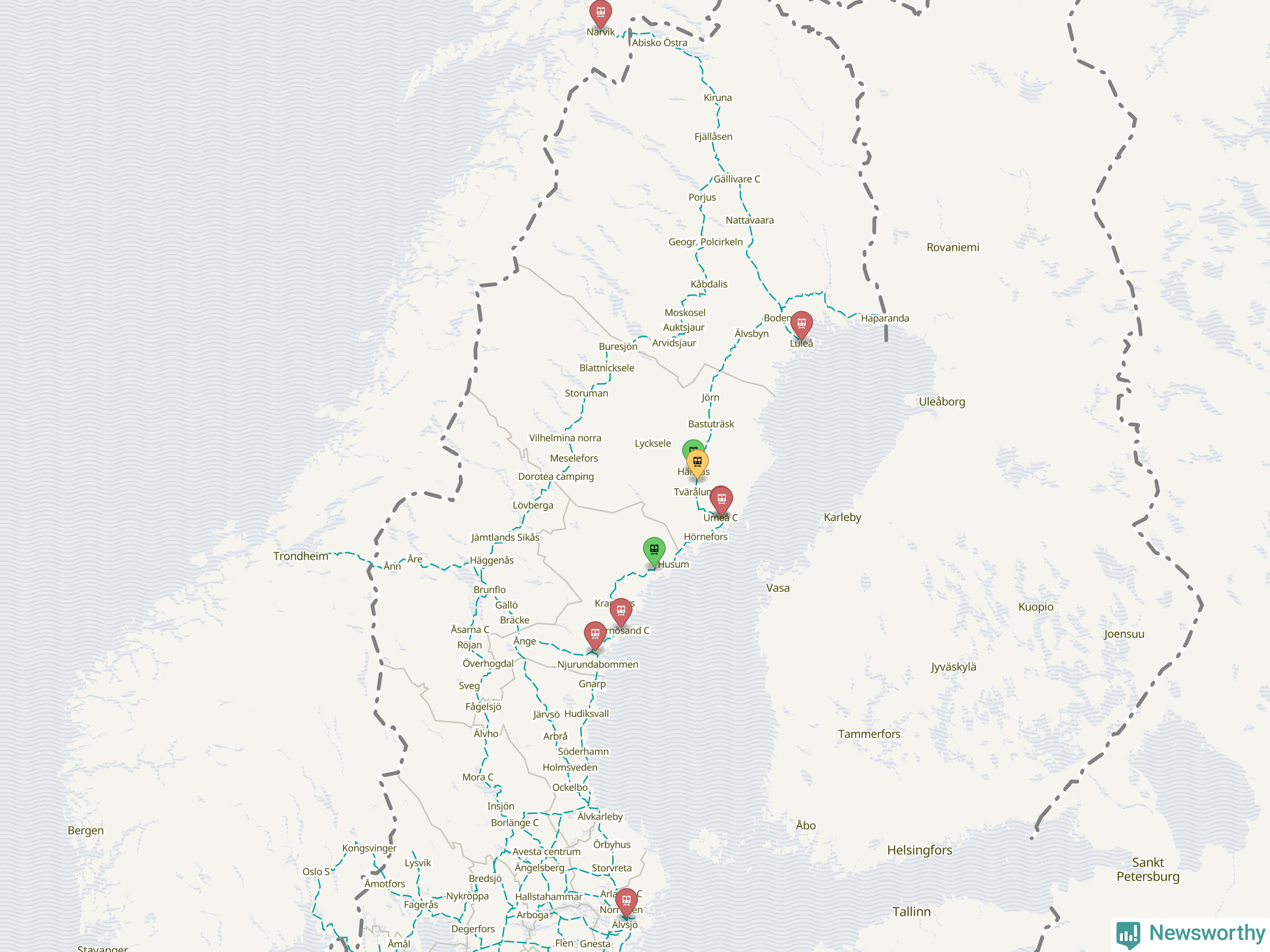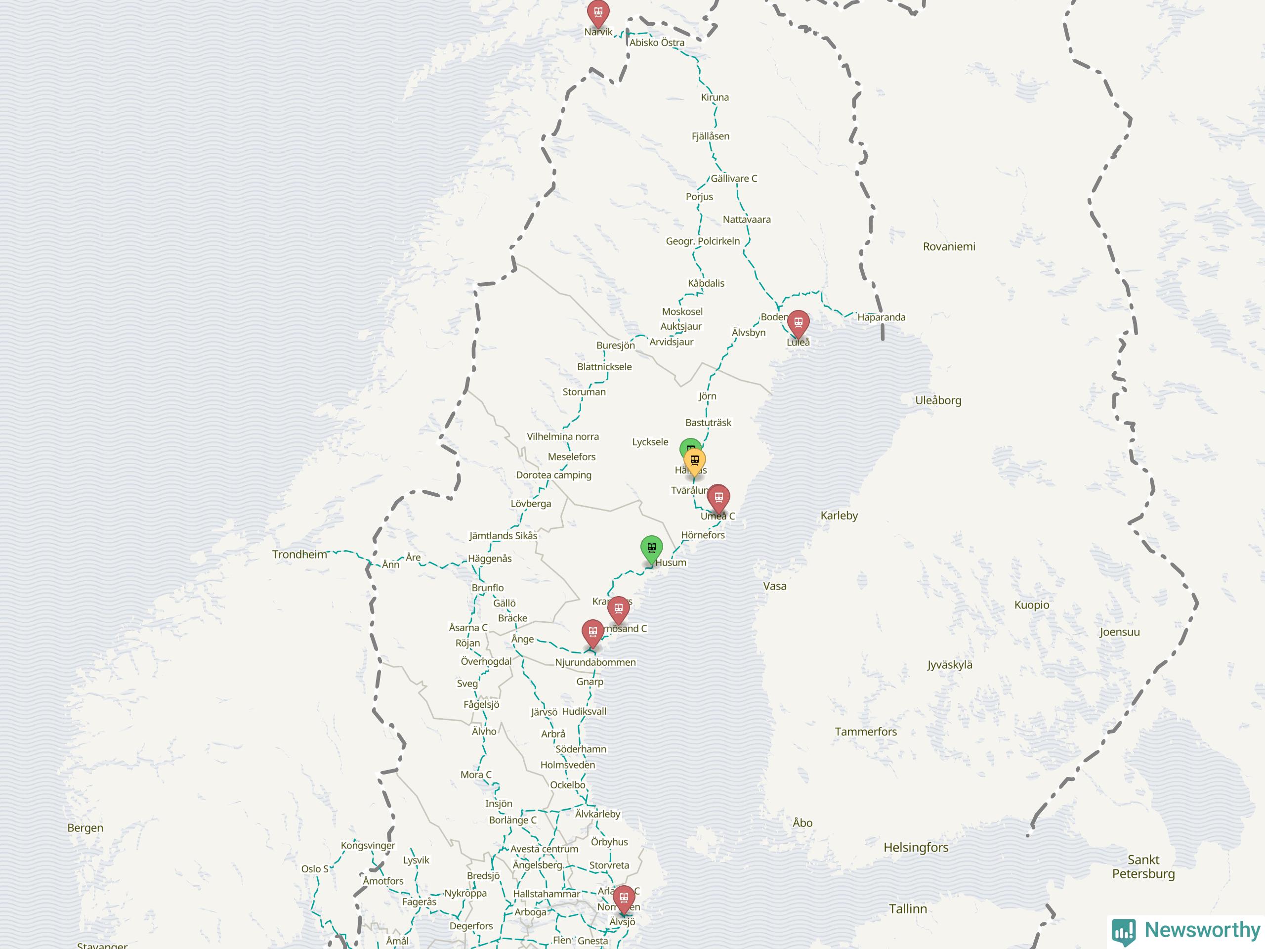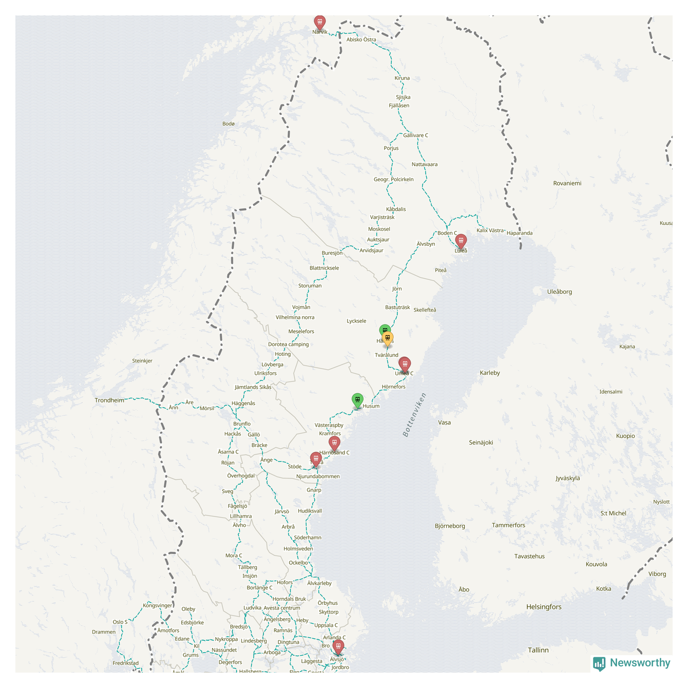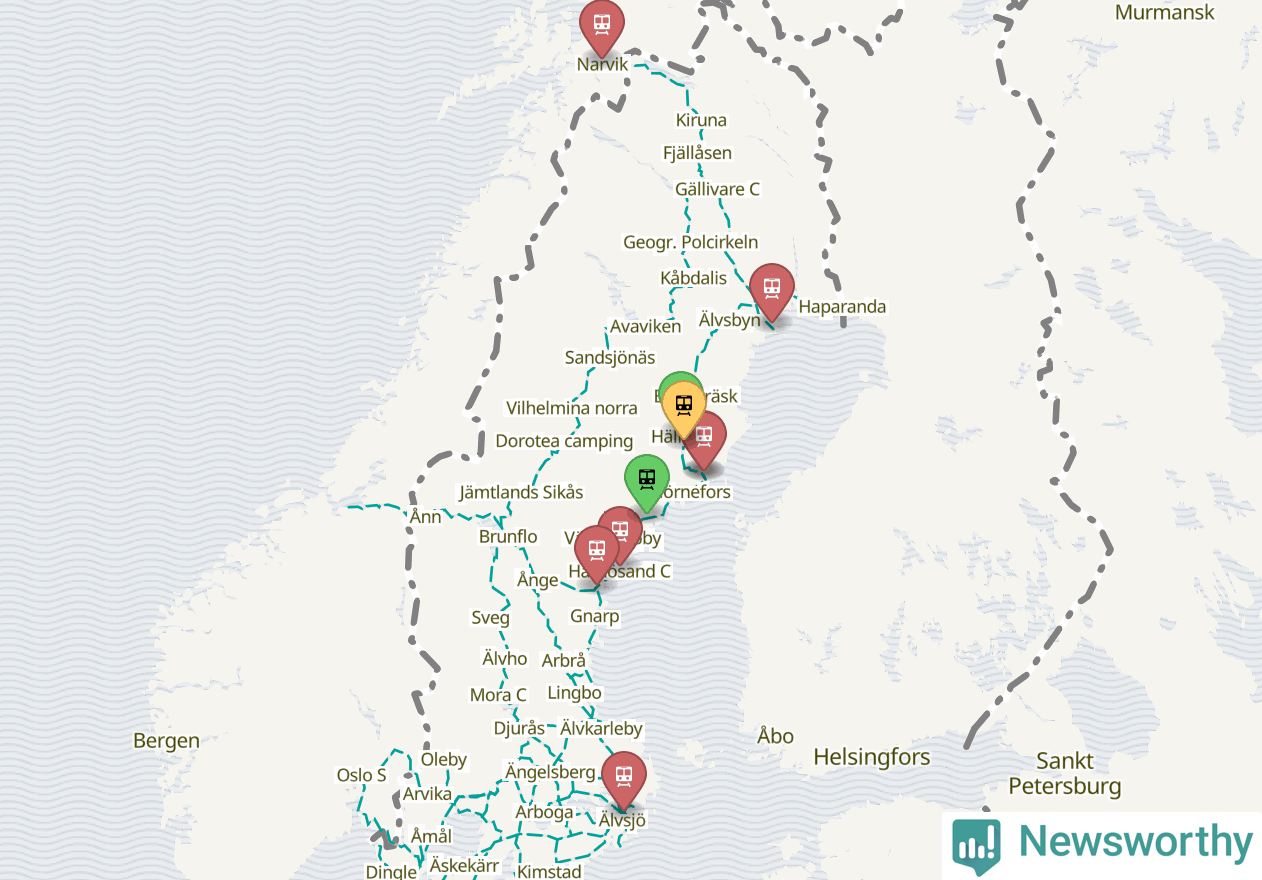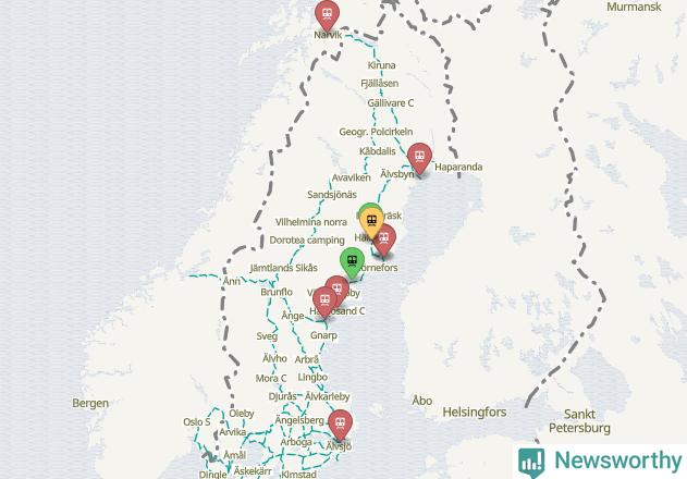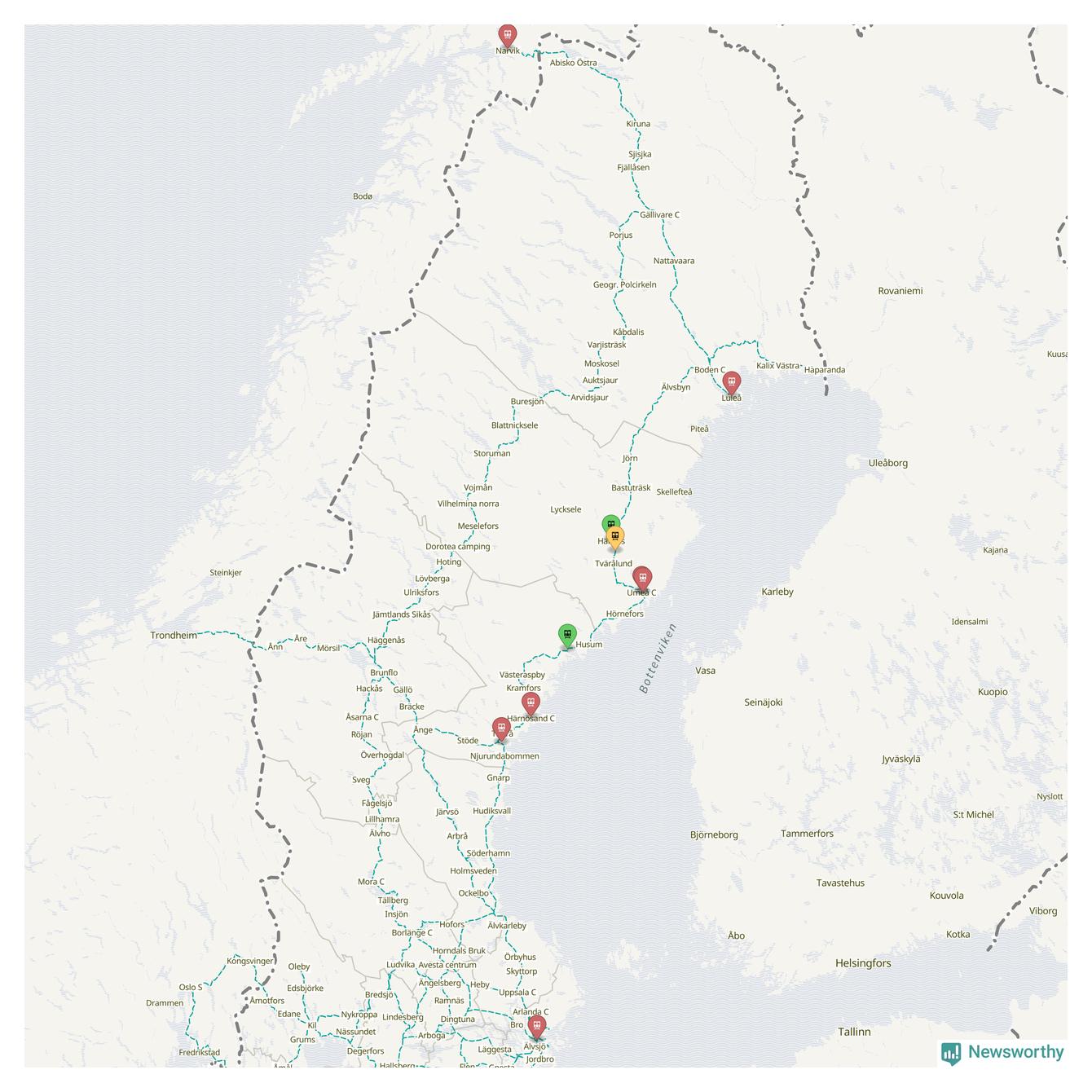 Kartdata från Mapbox, Newsworthy, OpenStreetMap och Trafikverket. Uppgifter om sträckor med passagerartrafik från jarnvag.net.