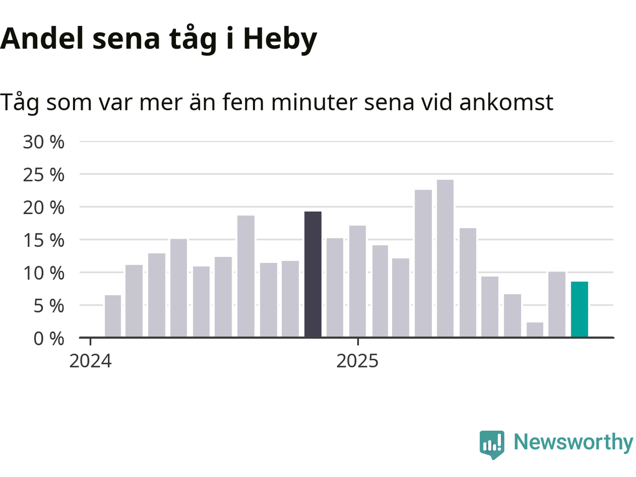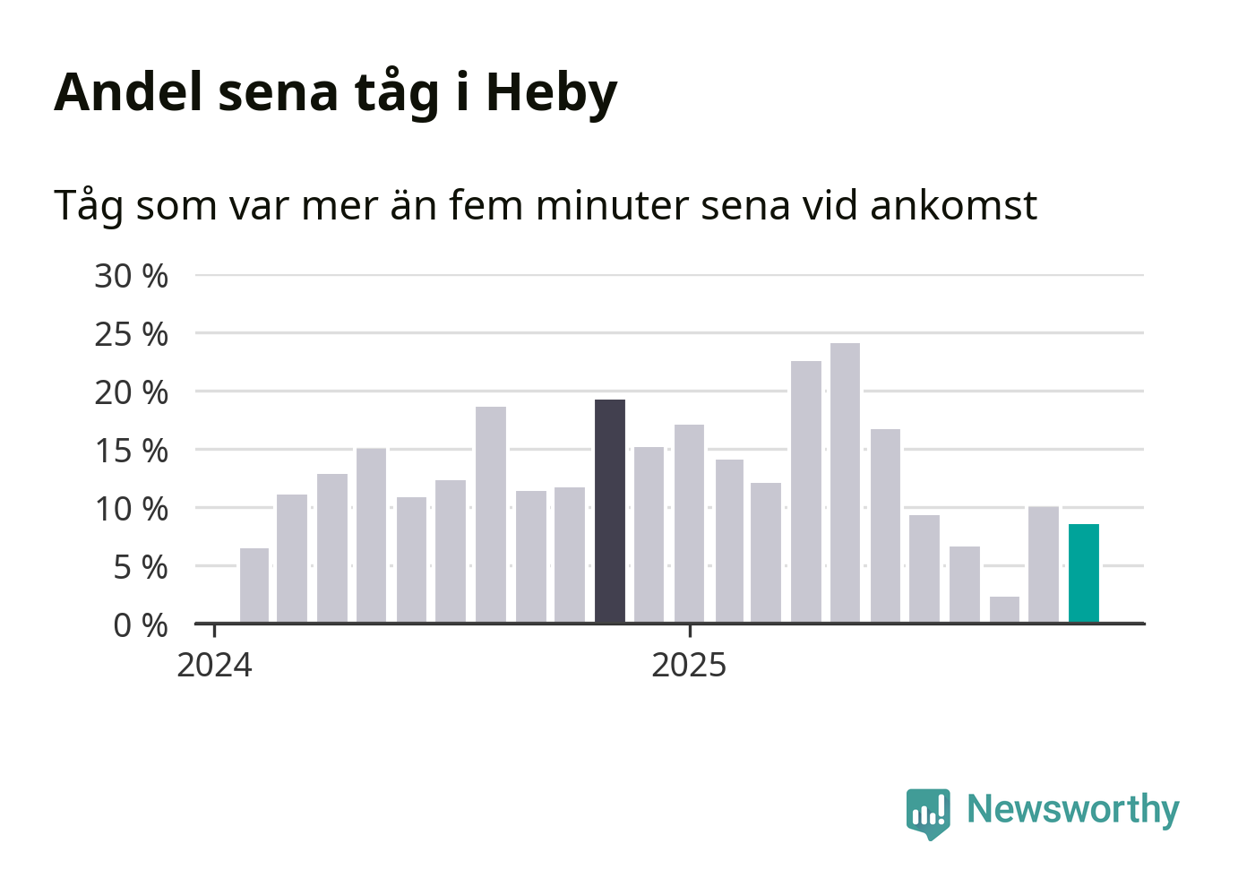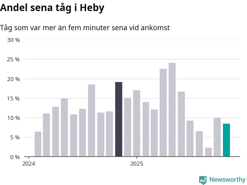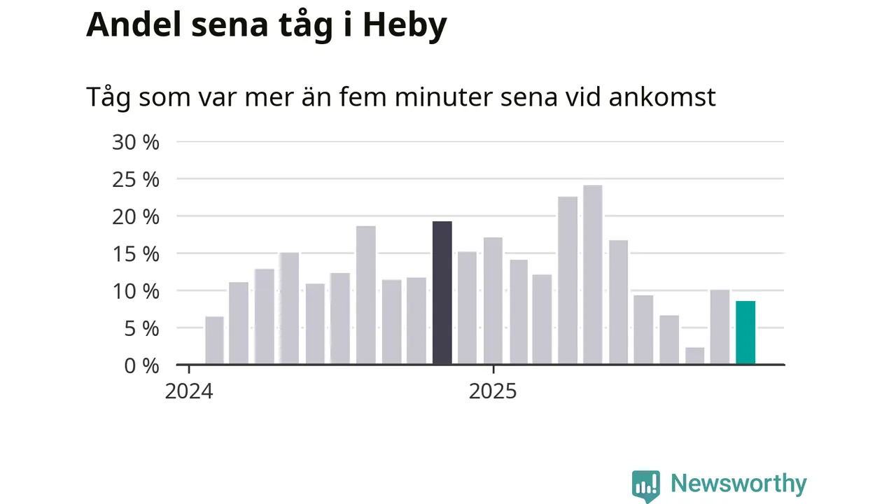 Nio procent kan jämföras med tio procent månaden innan, och 19 procent i november 2024. Siffrorna bygger på realtidsinformation om tågavgångar och ankomster från Trafikverket, som Newsworthy löpande samlar in.
