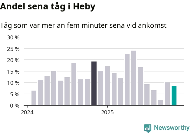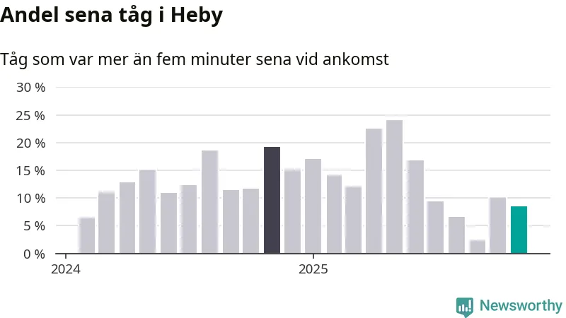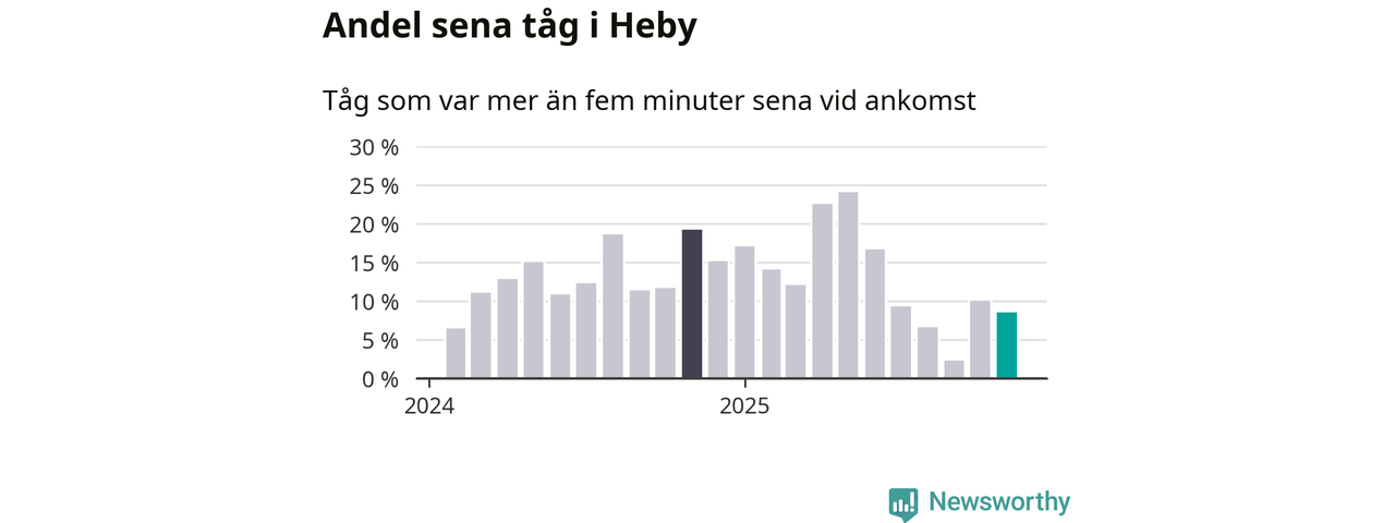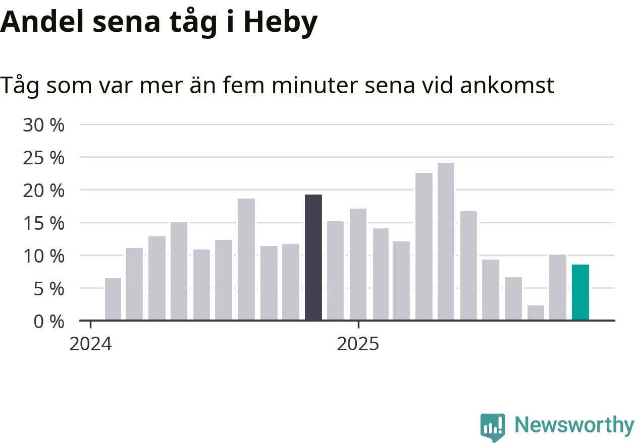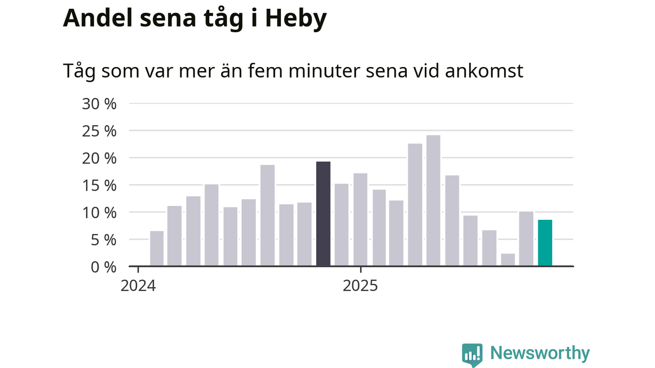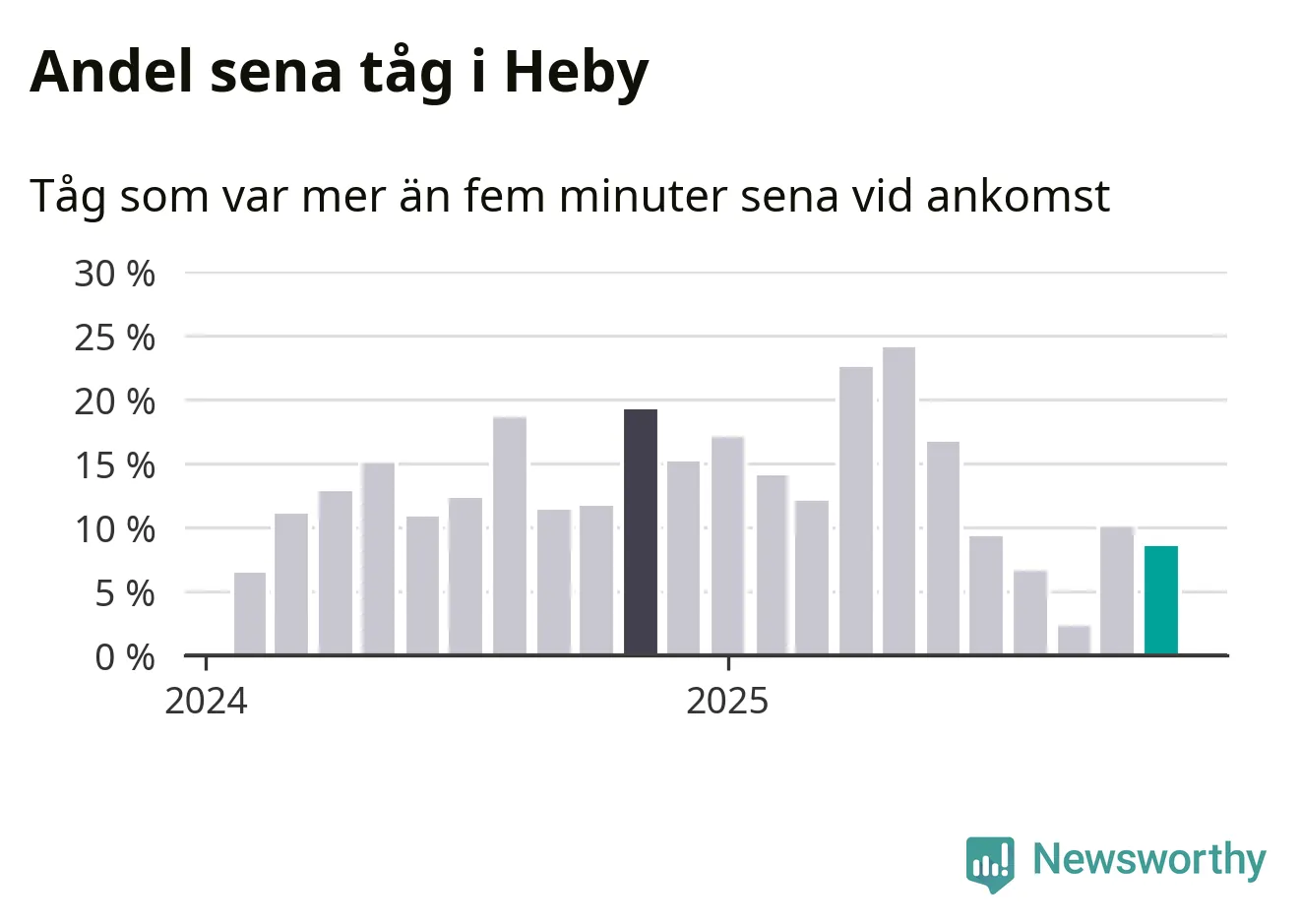 Nio procent kan jämföras med tio procent månaden innan, och 19 procent i november 2024. Siffrorna bygger på realtidsinformation om tågavgångar och ankomster från Trafikverket, som Newsworthy löpande samlar in.
