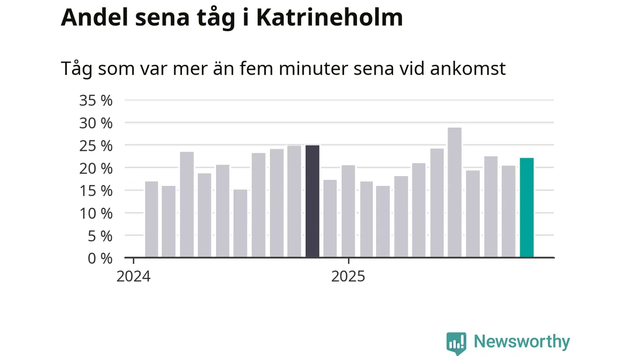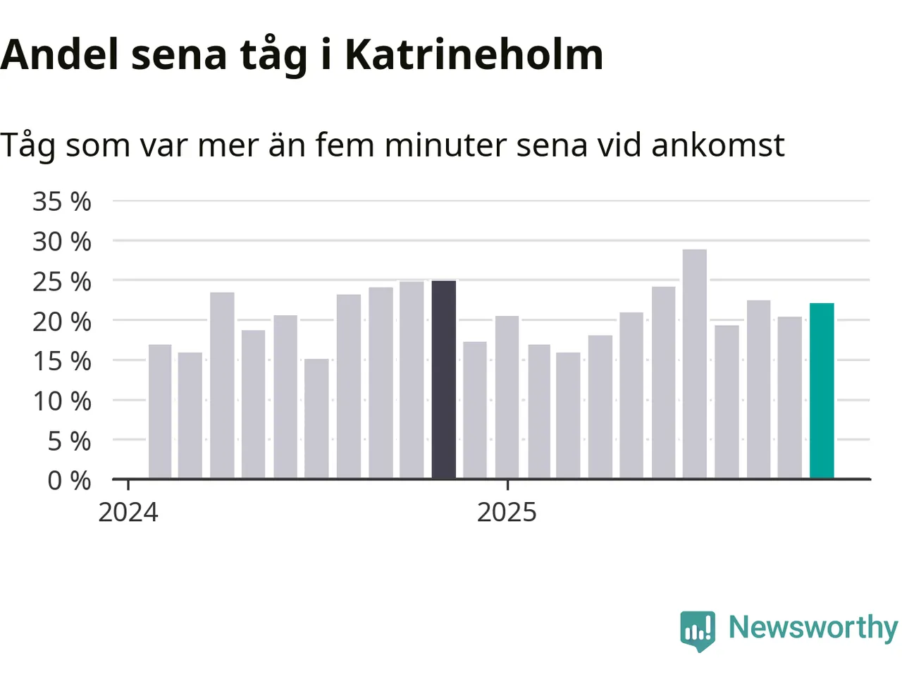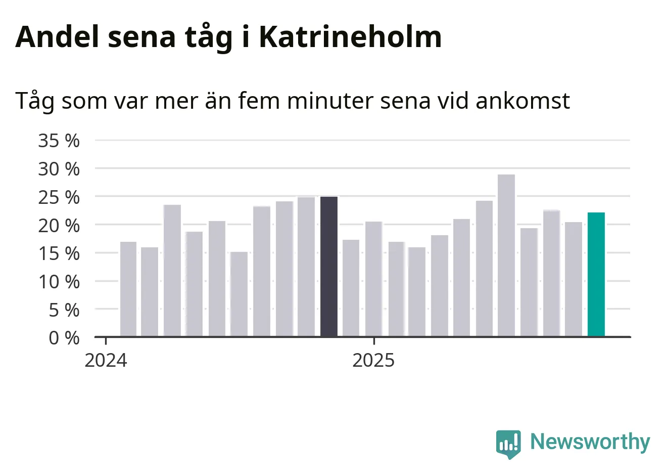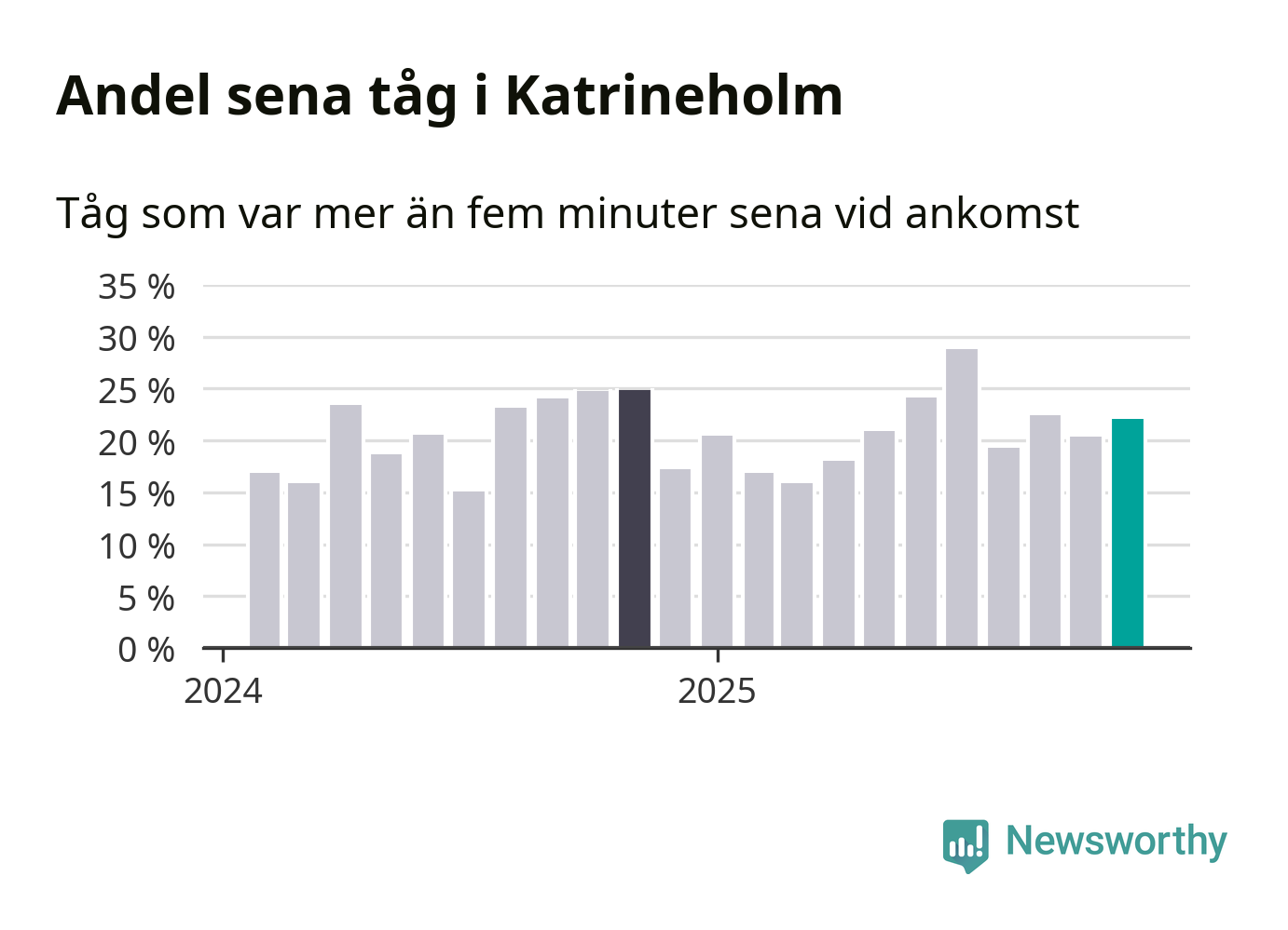 22 procent kan jämföras med 20 procent månaden innan, och 25 procent i november 2024. Siffrorna bygger på realtidsinformation om tågavgångar och ankomster från Trafikverket, som Newsworthy löpande samlar in.