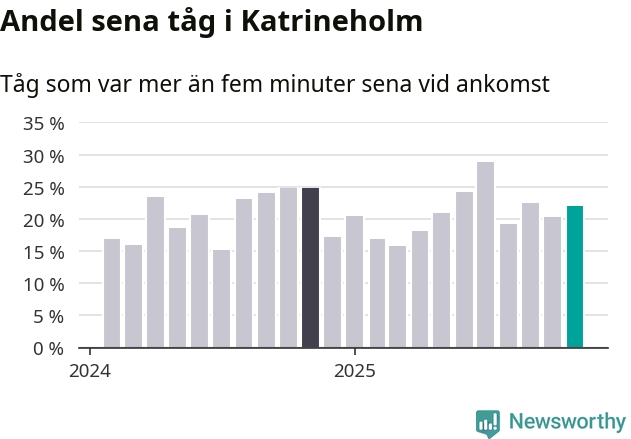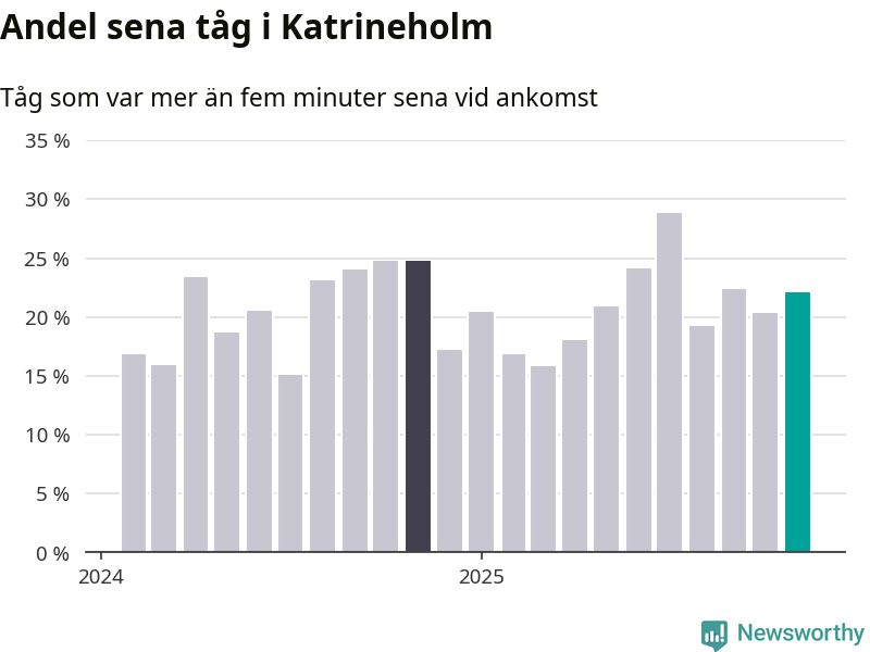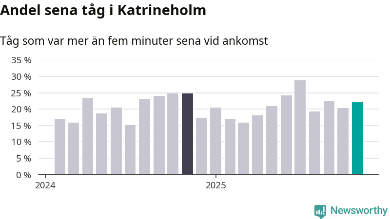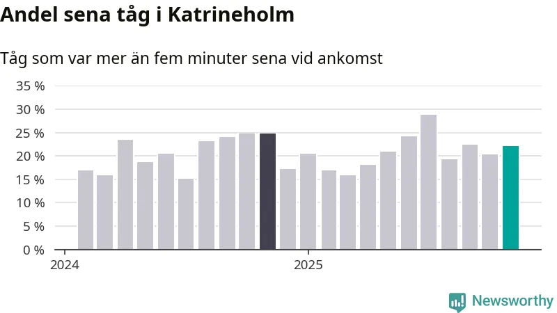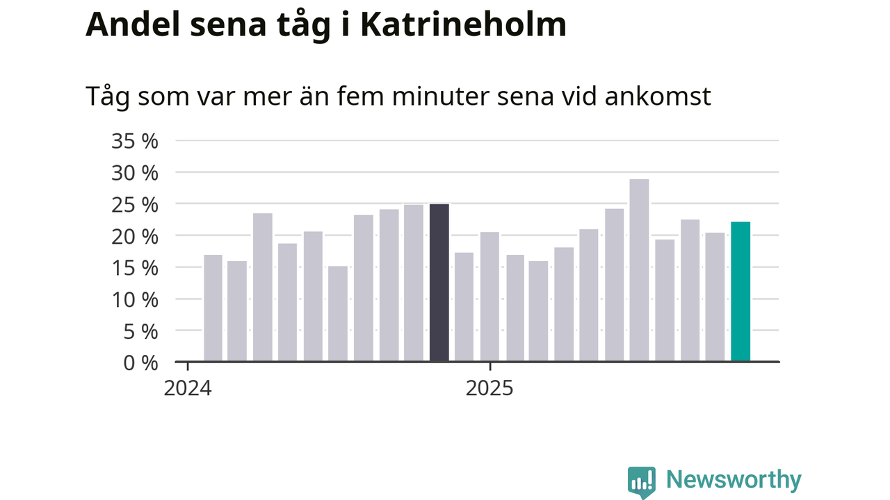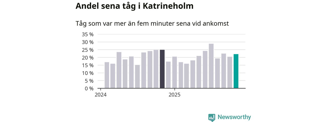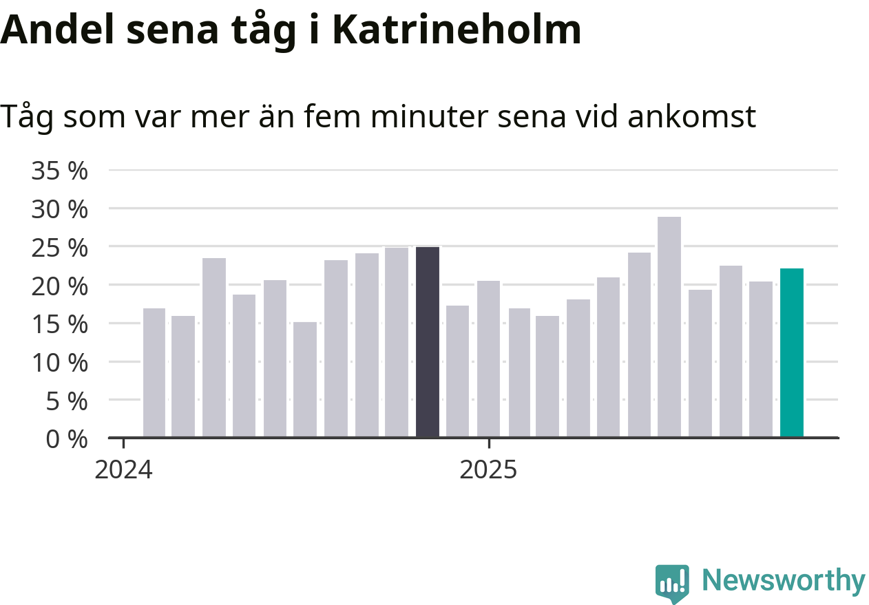 22 procent kan jämföras med 20 procent månaden innan, och 25 procent i november 2024. Siffrorna bygger på realtidsinformation om tågavgångar och ankomster från Trafikverket, som Newsworthy löpande samlar in.