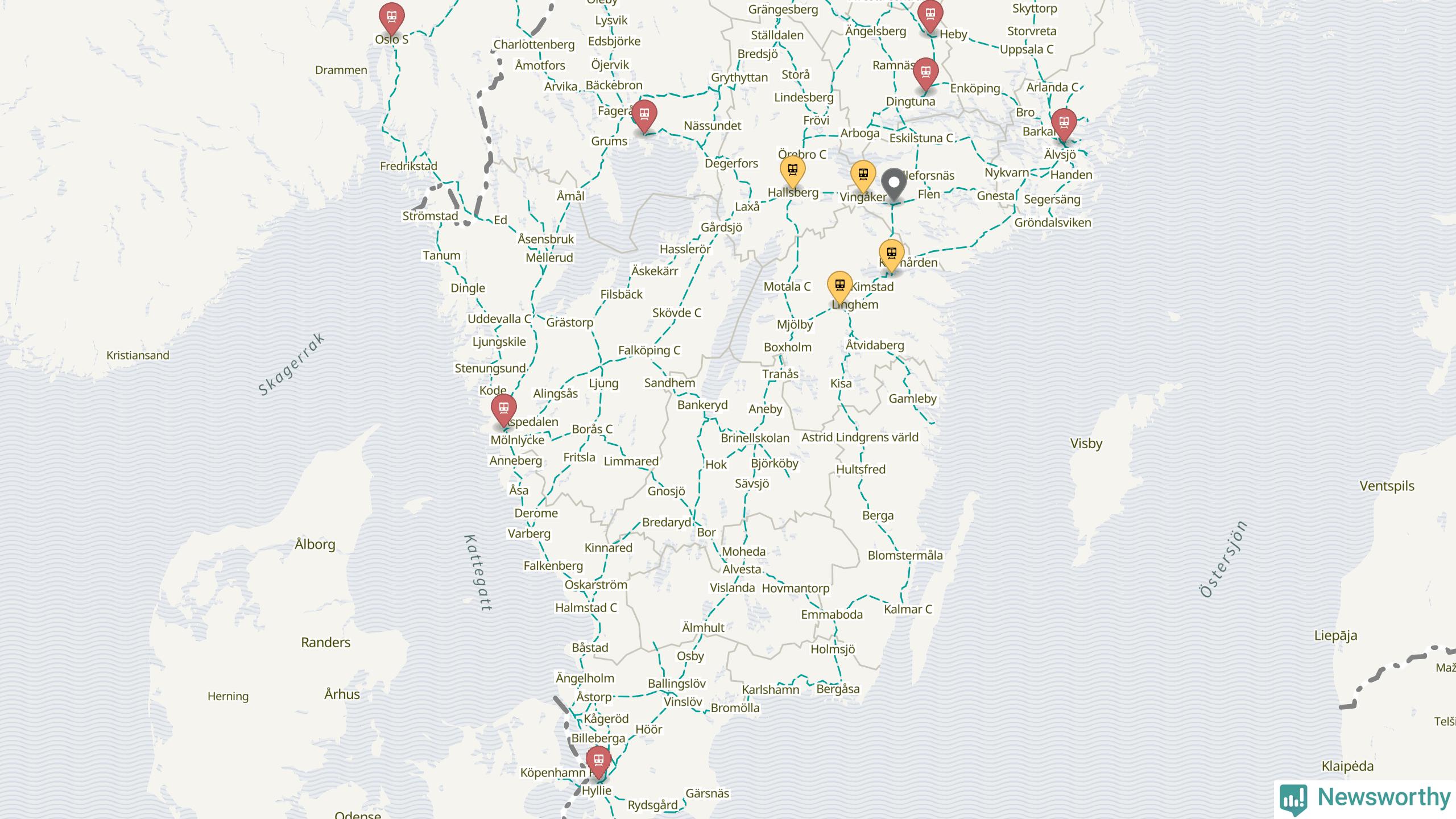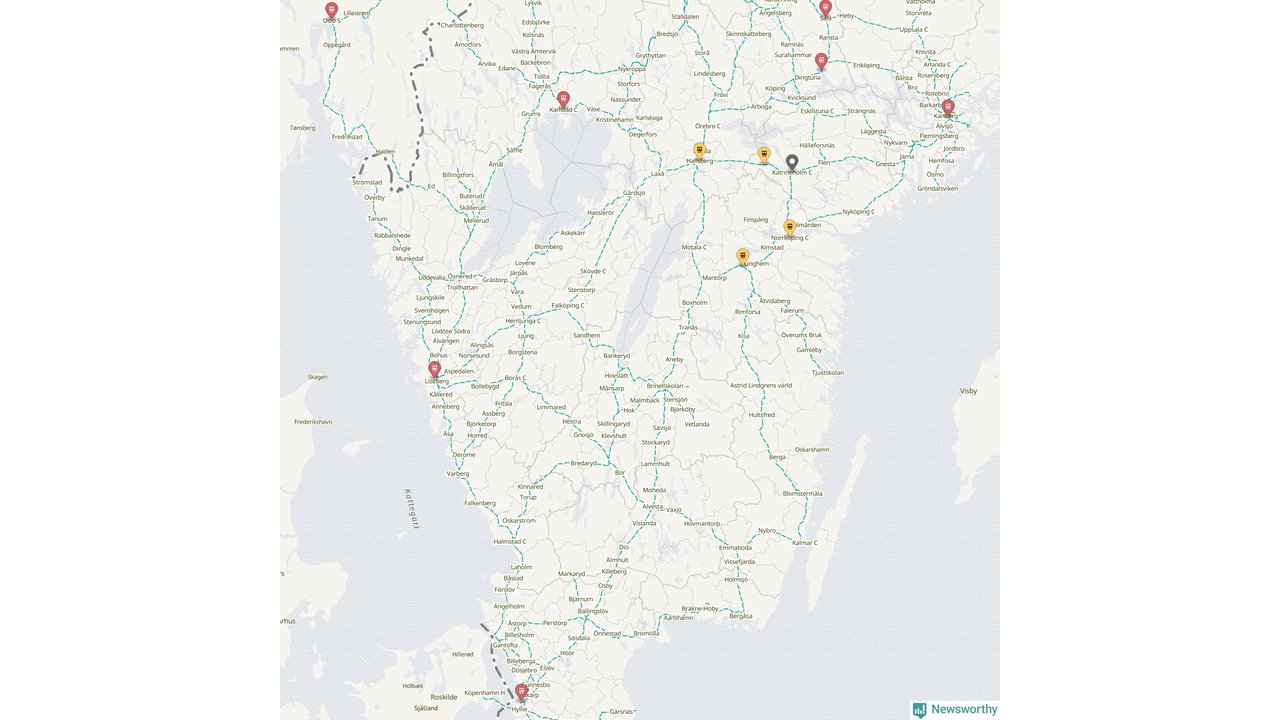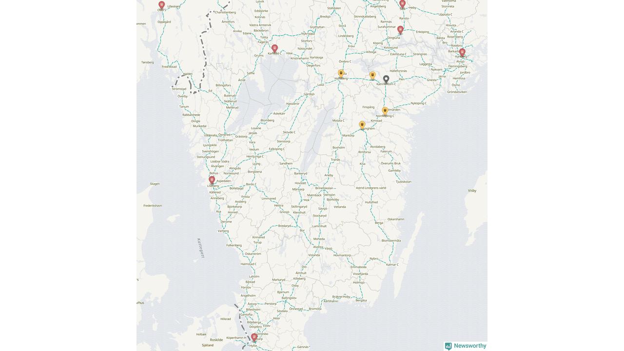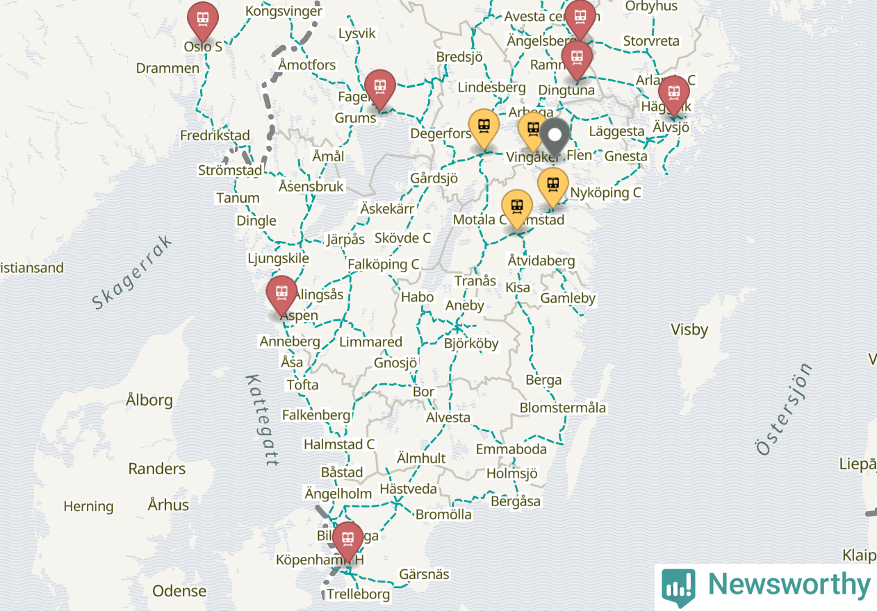 Kartdata från Mapbox, Newsworthy, OpenStreetMap och Trafikverket. Uppgifter om sträckor med passagerartrafik från jarnvag.net.