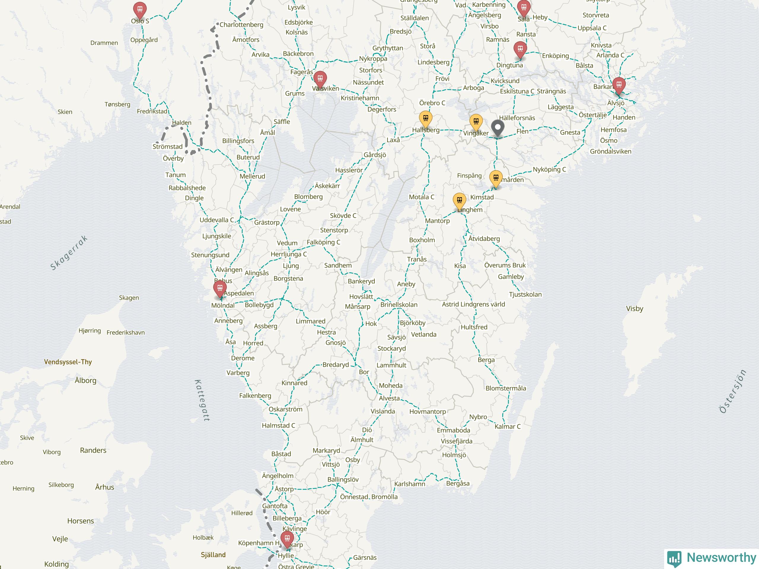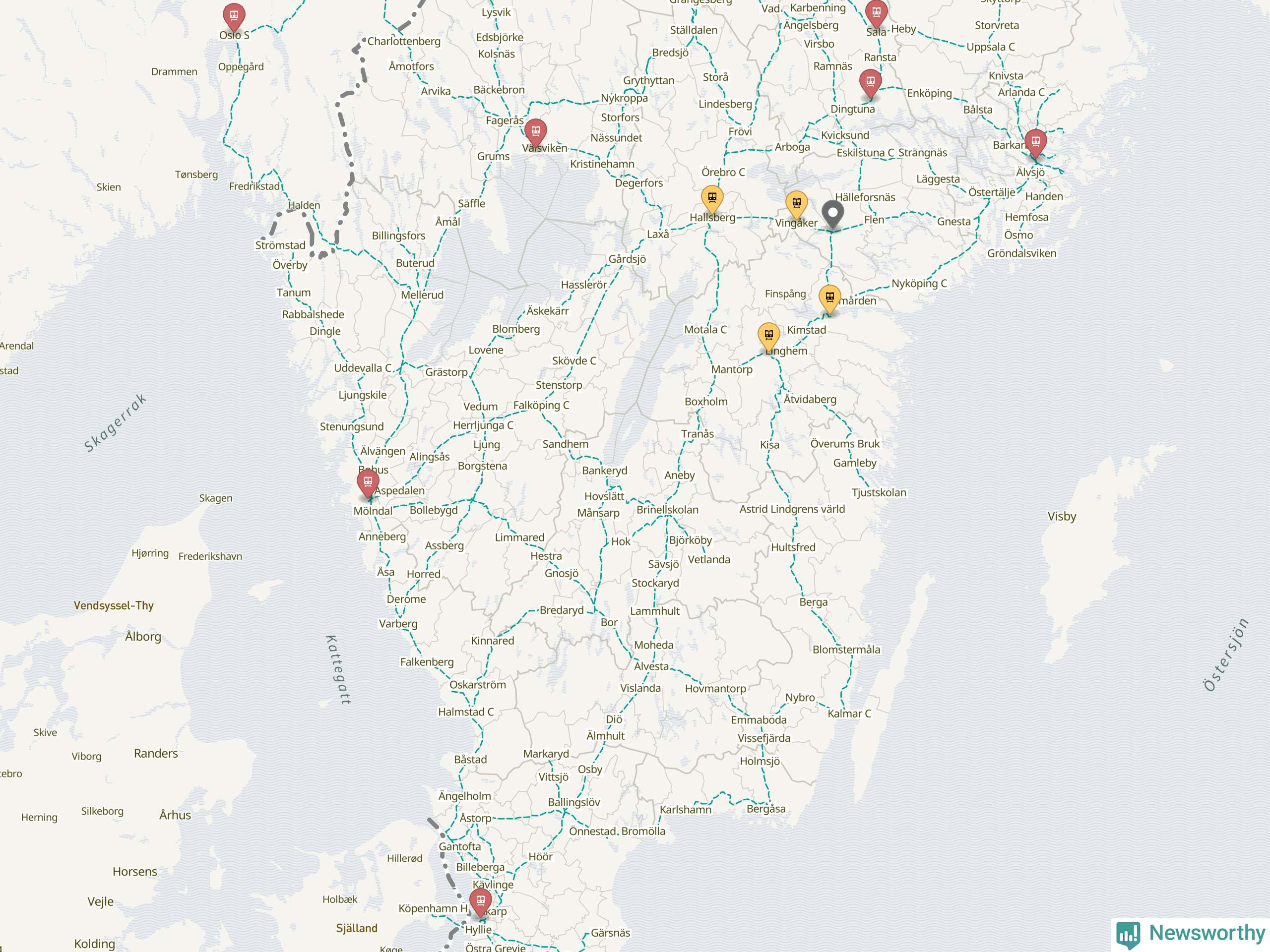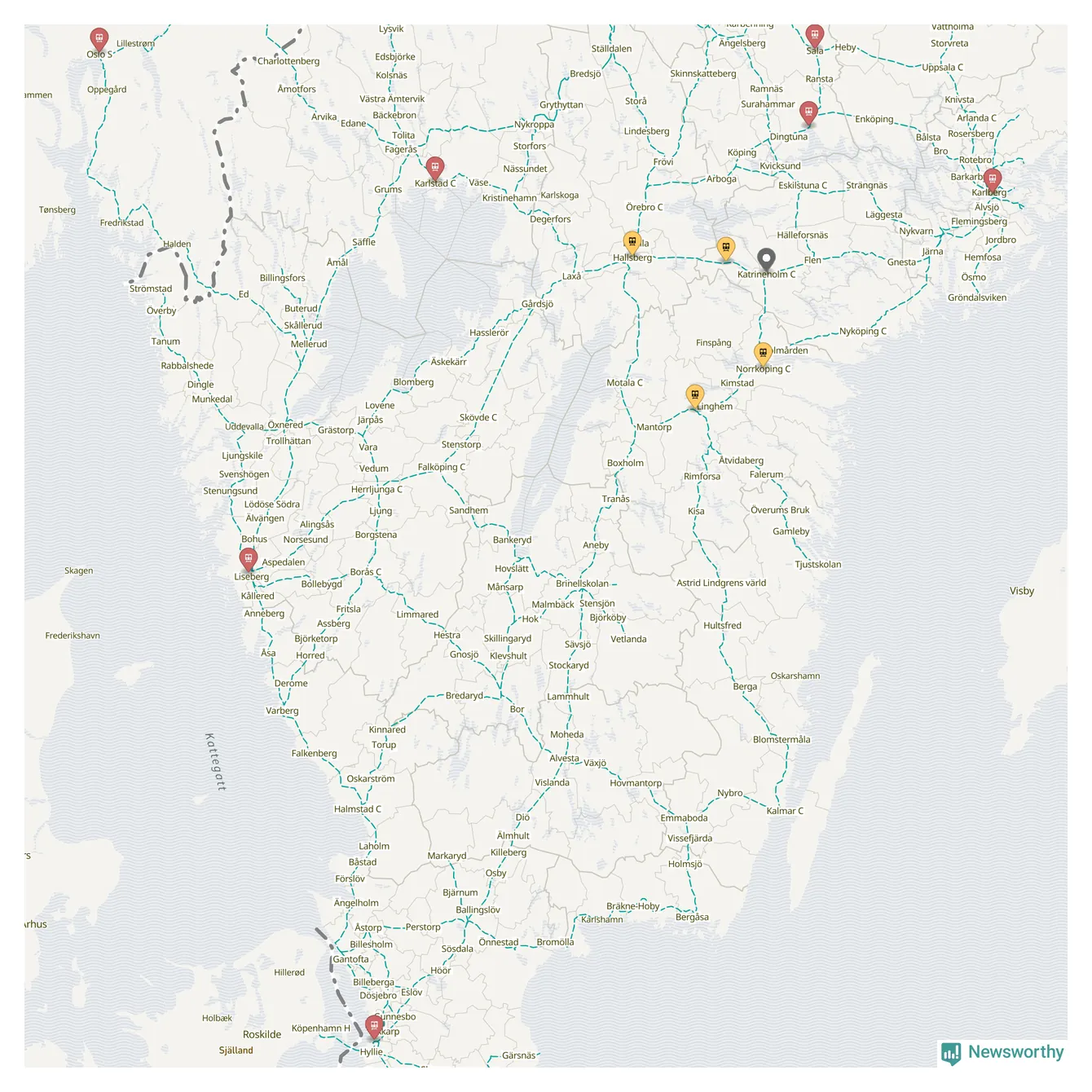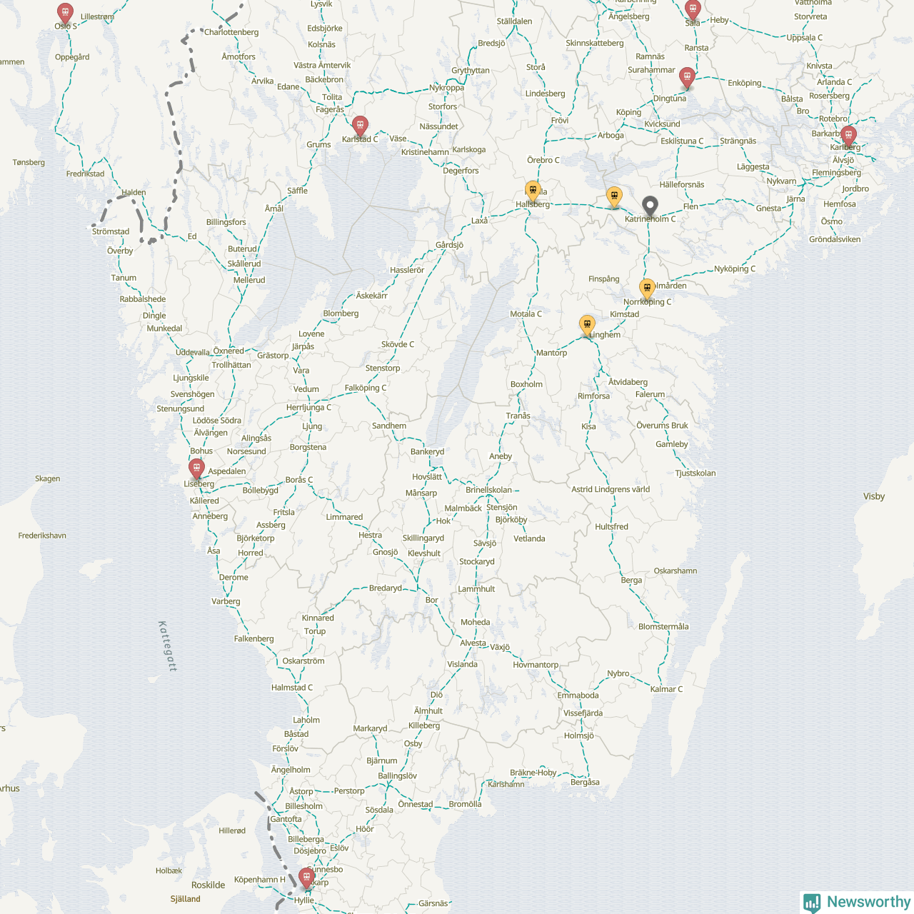 Kartdata från Mapbox, Newsworthy, OpenStreetMap och Trafikverket. Uppgifter om sträckor med passagerartrafik från jarnvag.net.