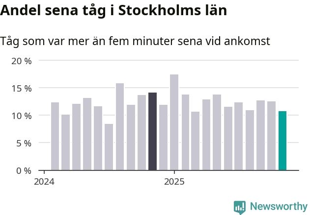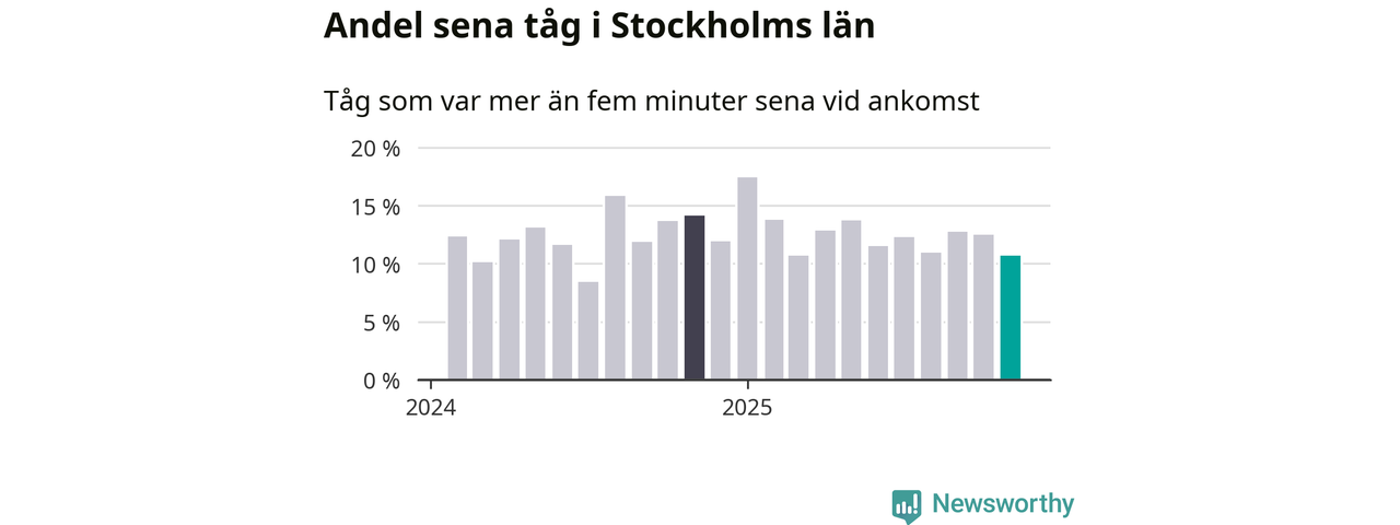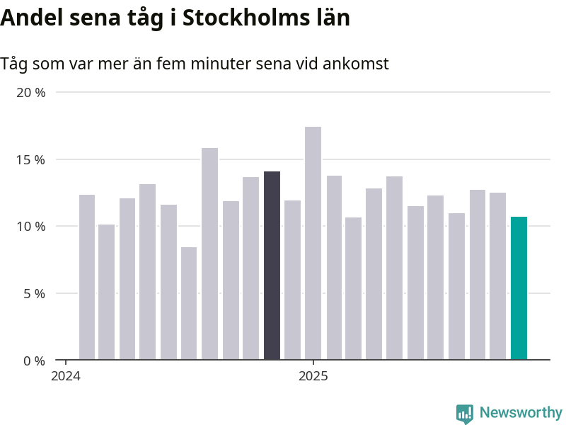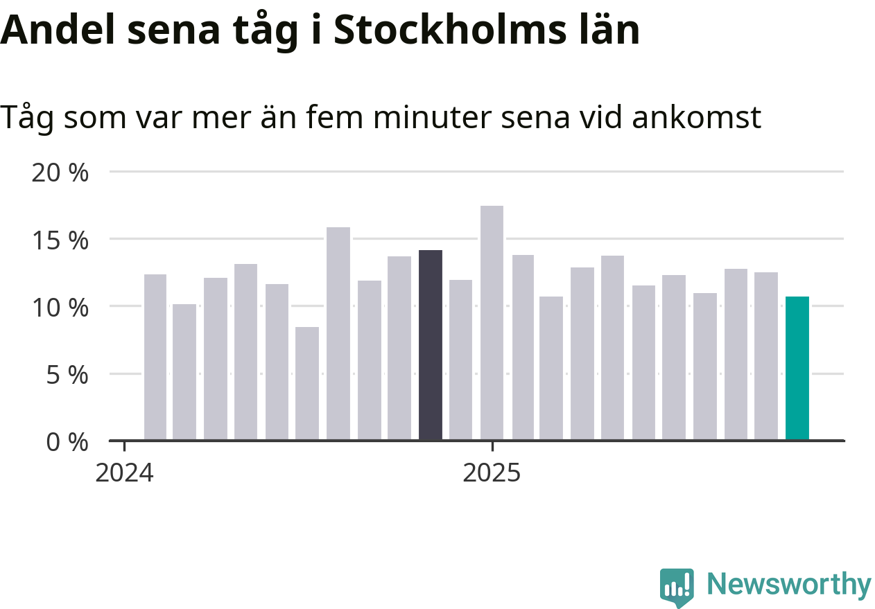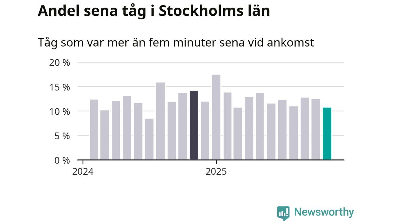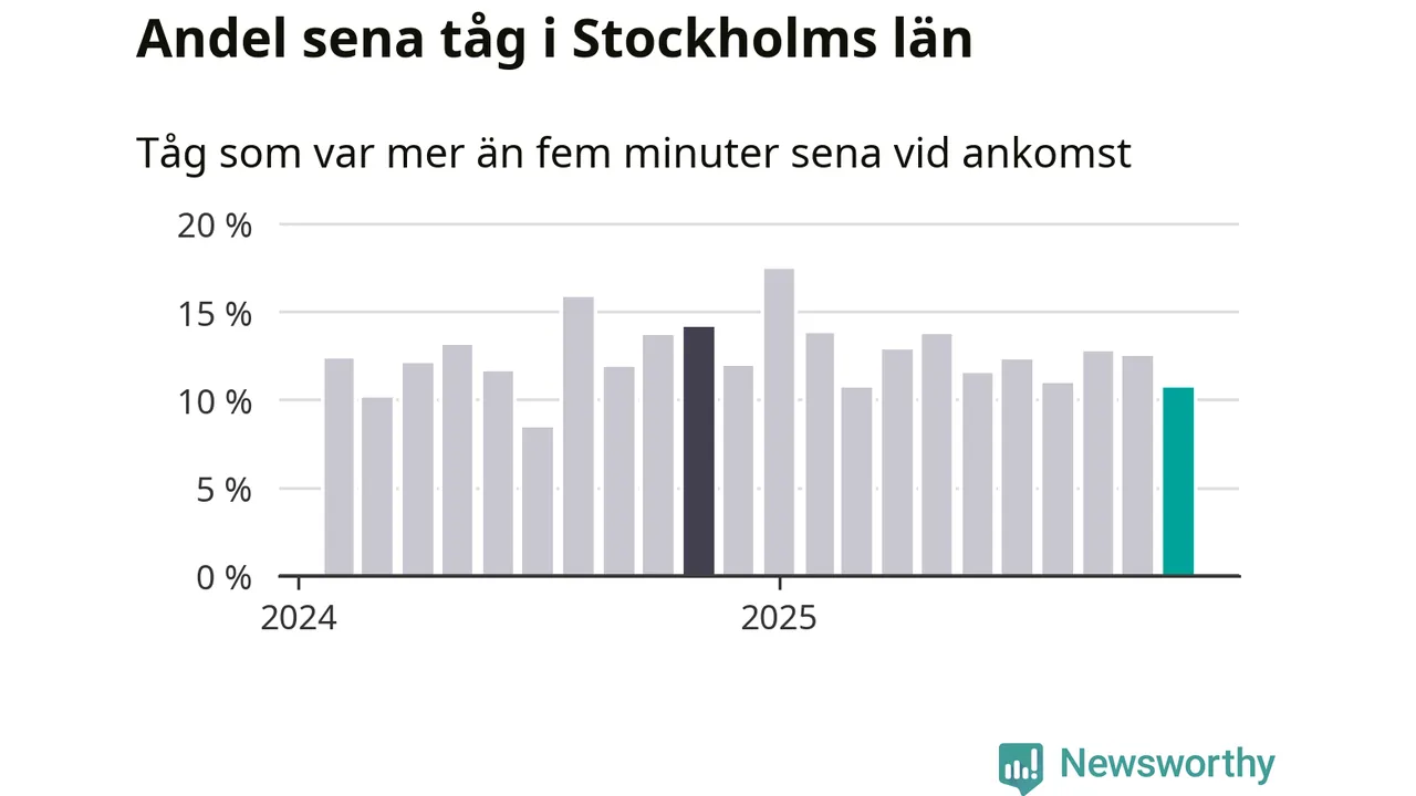 Elva procent kan jämföras med tolv procent månaden innan, och 14 procent i november 2024. Siffrorna bygger på realtidsinformation om tågavgångar och ankomster från Trafikverket, som Newsworthy löpande samlar in.